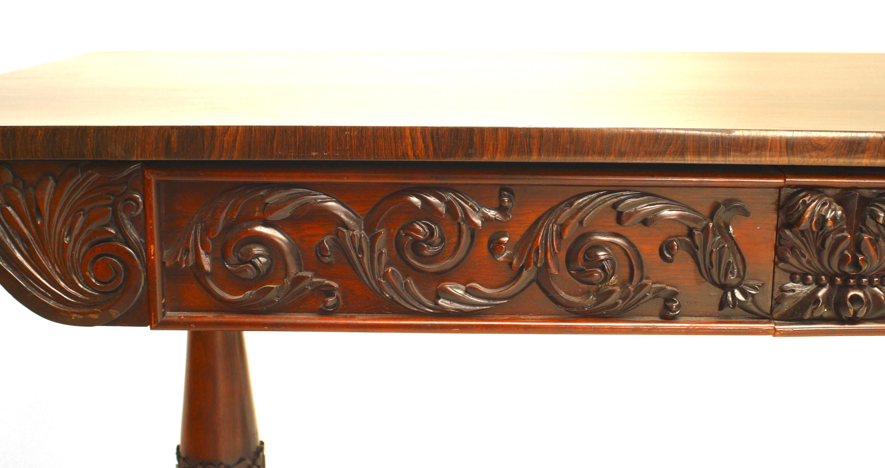 English William IV (circa 1835) rosewood davenport table desk with carved apron and supported on 2 pedestals connected with a stretcher and 2 drawers..