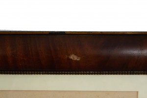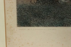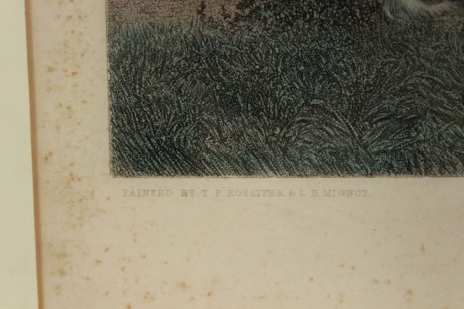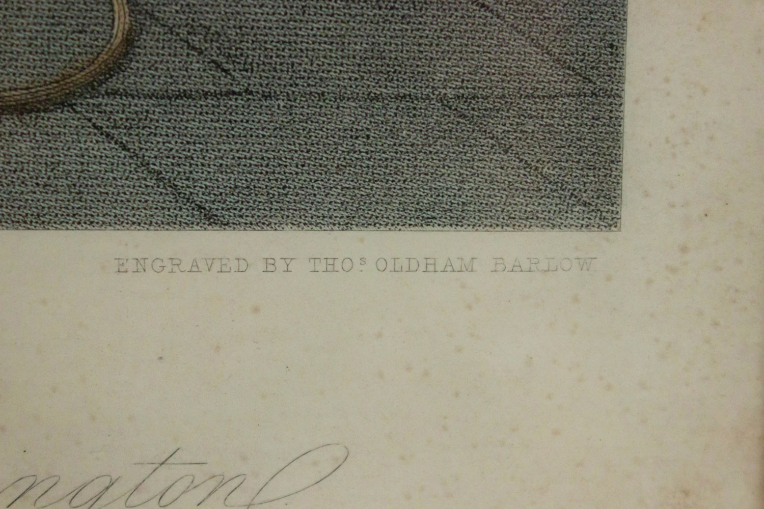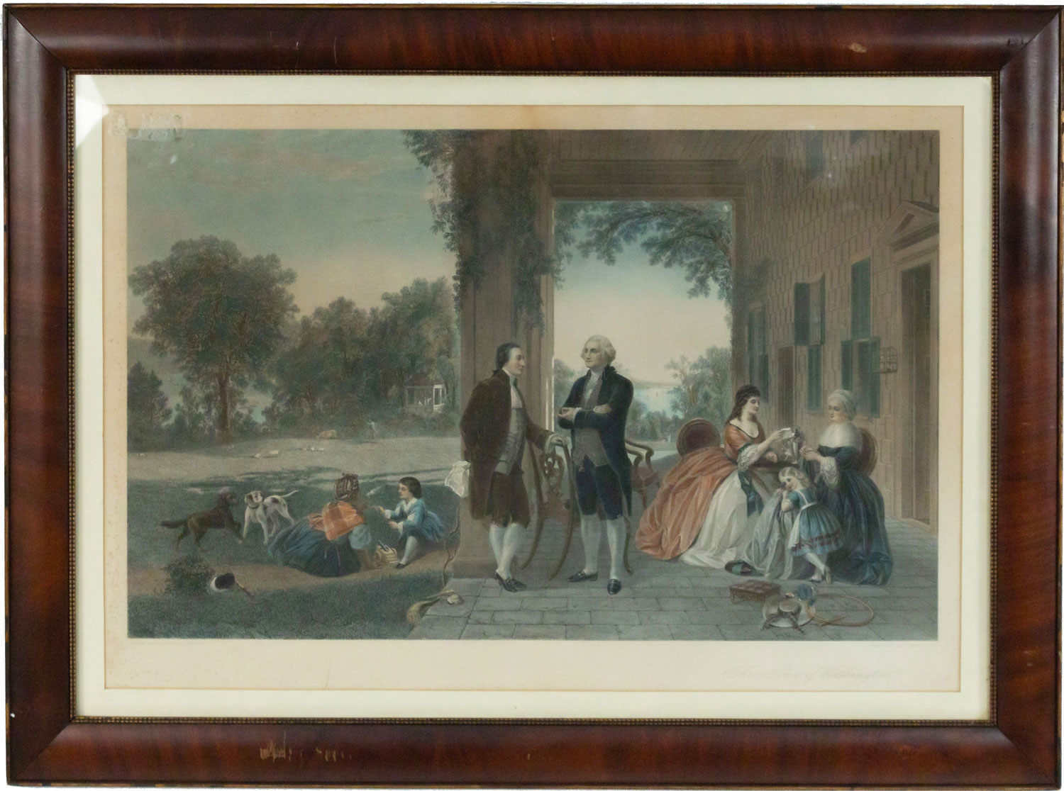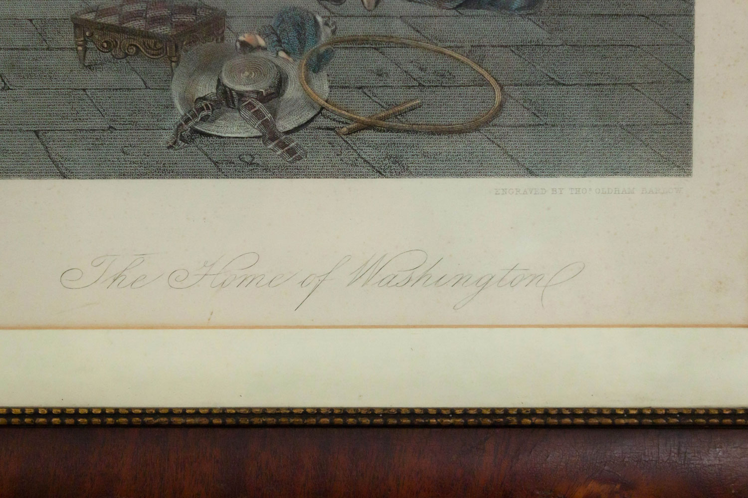 Color engraving of George Washington's home. Pastoral scene of the Washington's family sitting on the porch outside. Signed on right side: "Engraved by: THO OLDHAM BARLOW". Dark wooden frame with attached picture wire.
