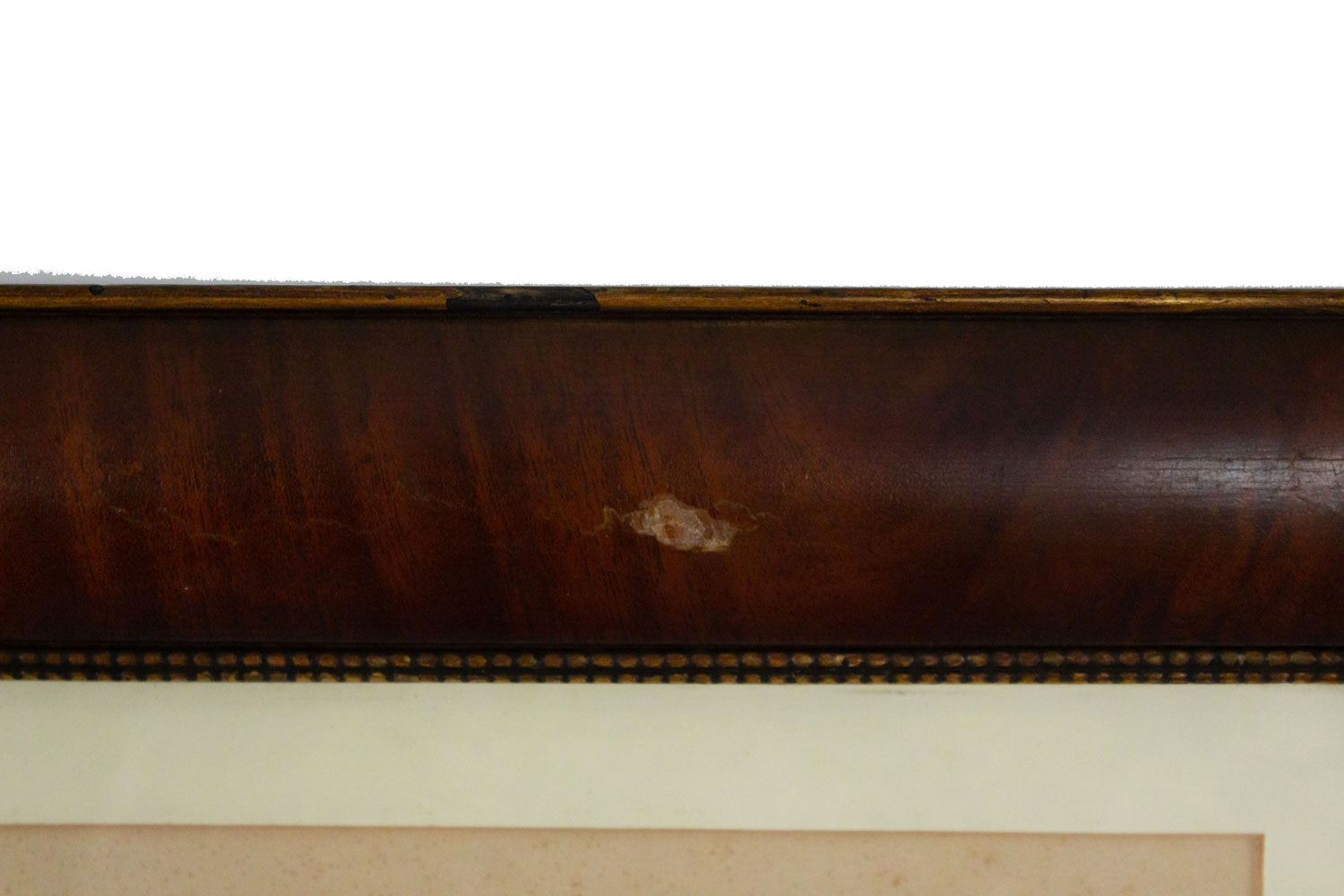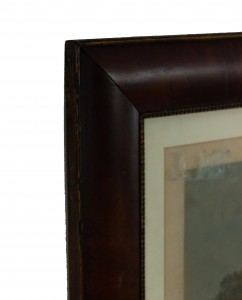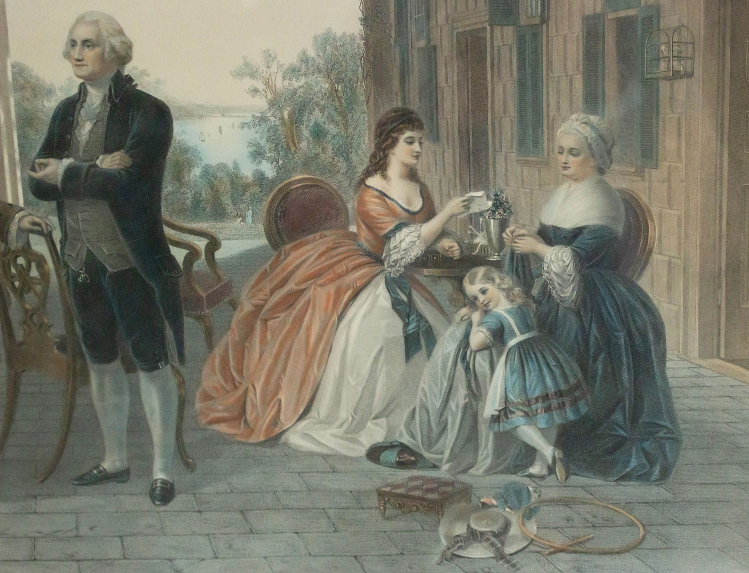Color engraving of George Washington's home. Pastoral scene of the Washington's family sitting on the porch outside. Signed on right side: "Engraved by: THO OLDHAM BARLOW". Dark wooden frame with attached picture wire..