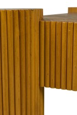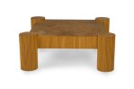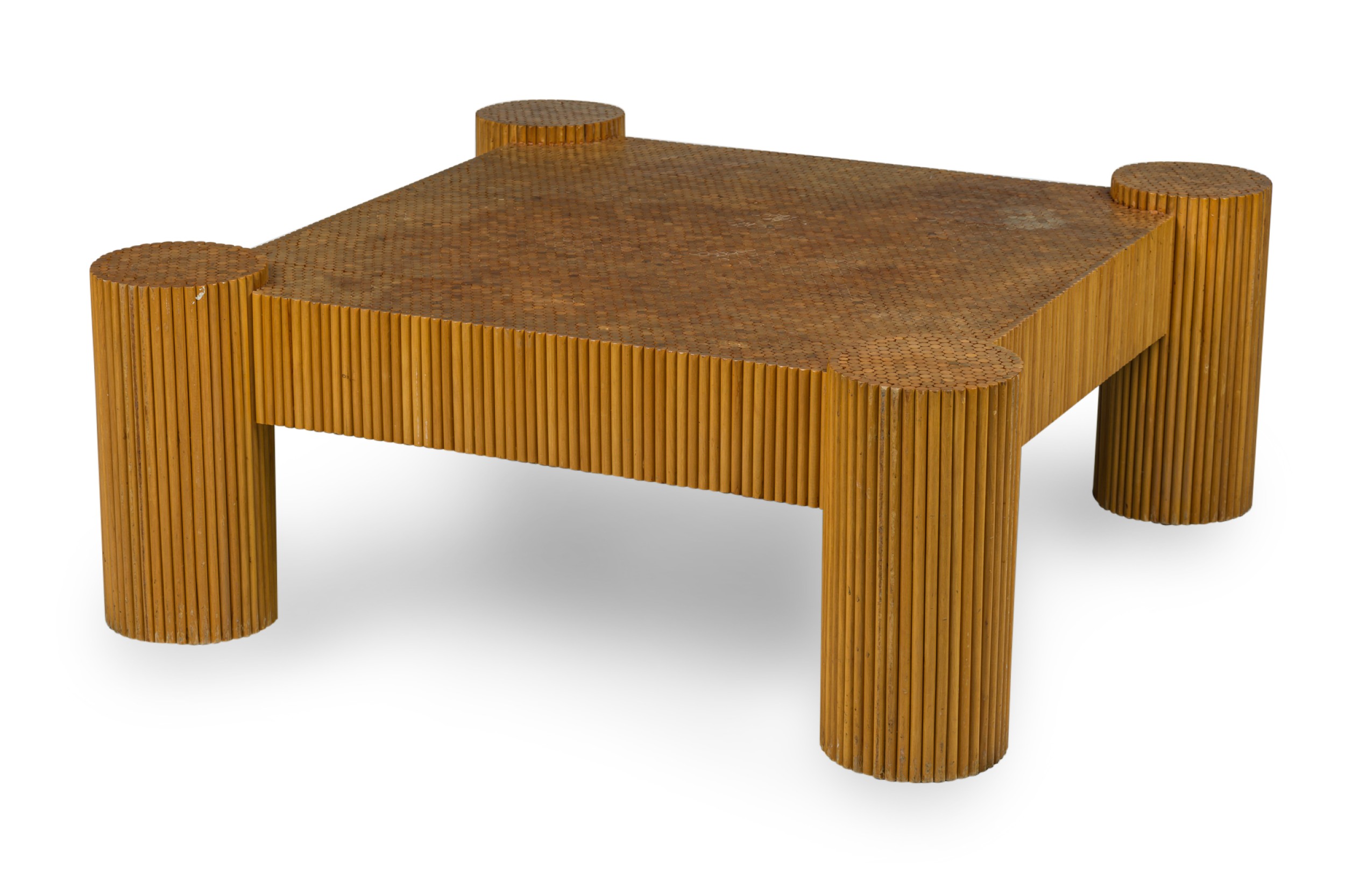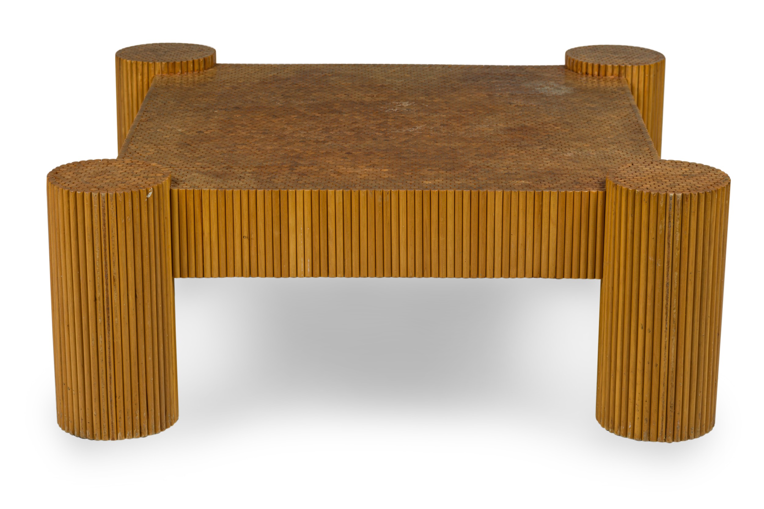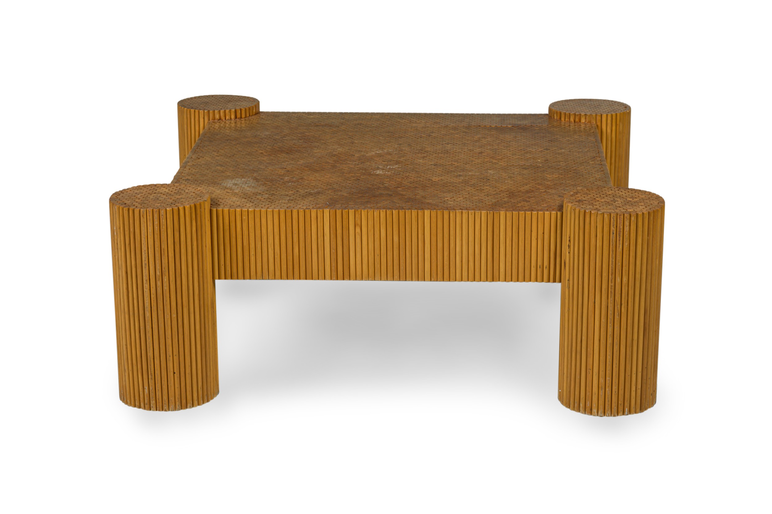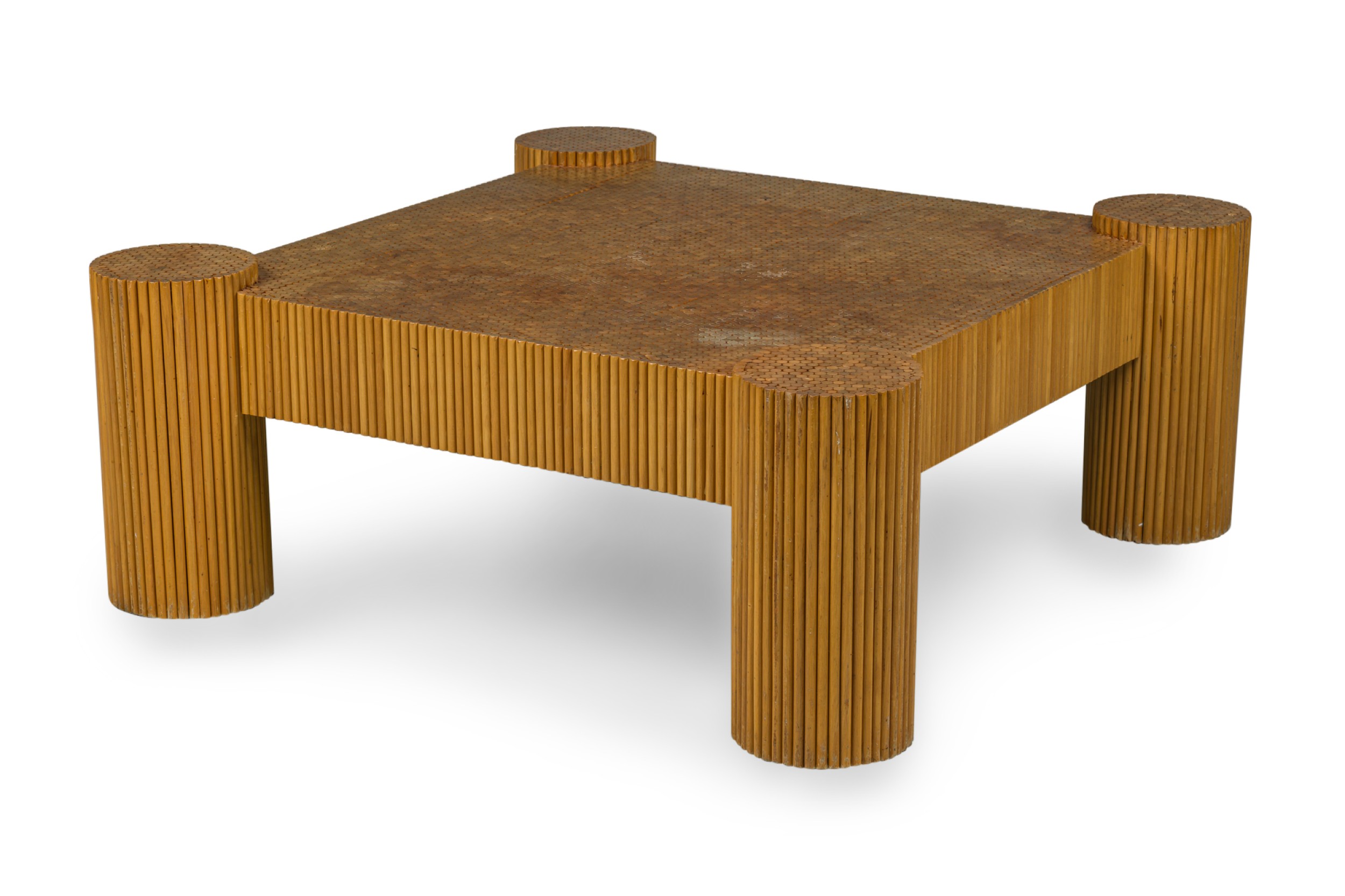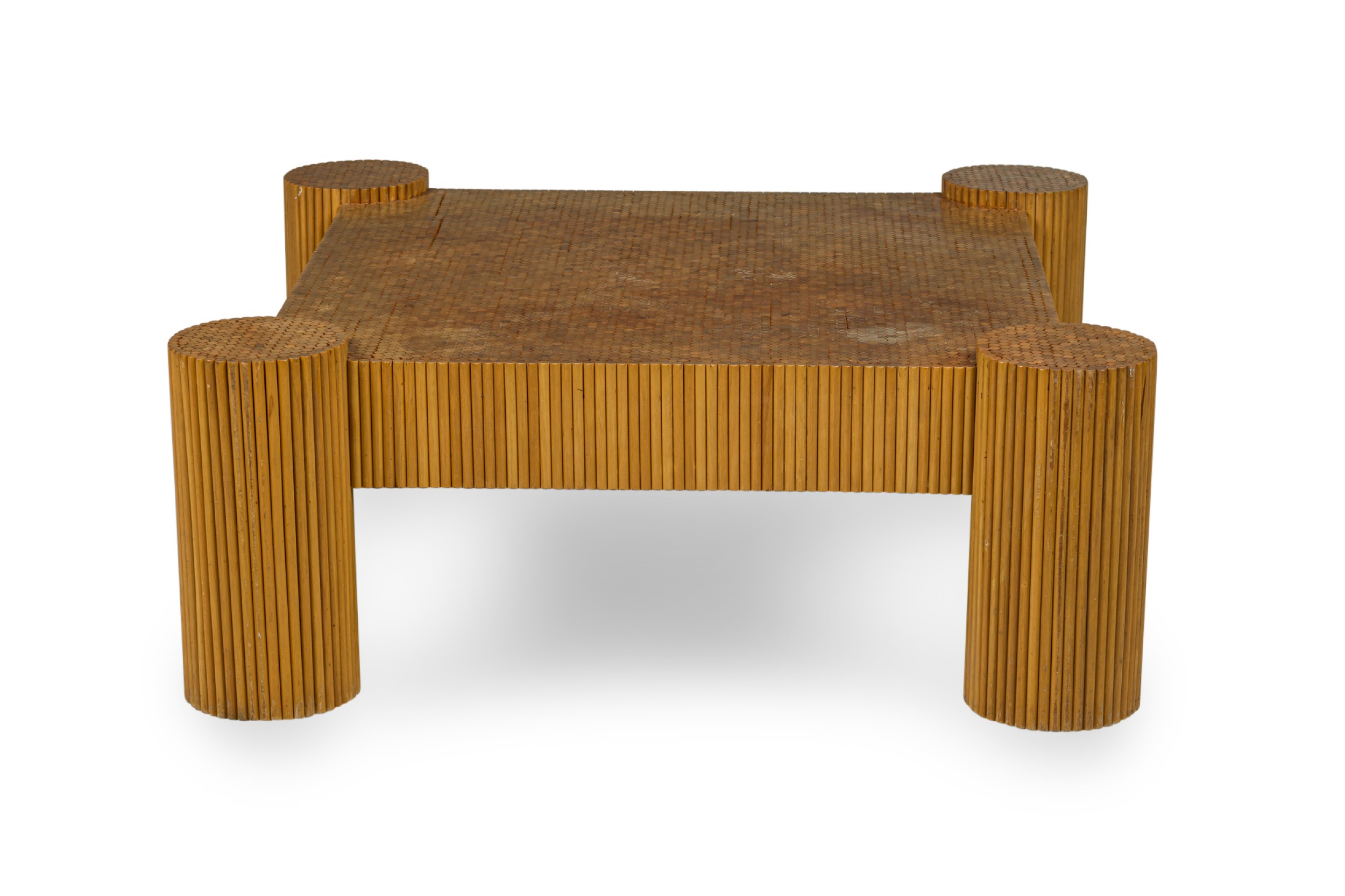 American Mid-Century Modern coffee table with square top and four exterior cylindrical legs comprised of bonded bamboo dowels. (ERNEST C. MASI).