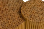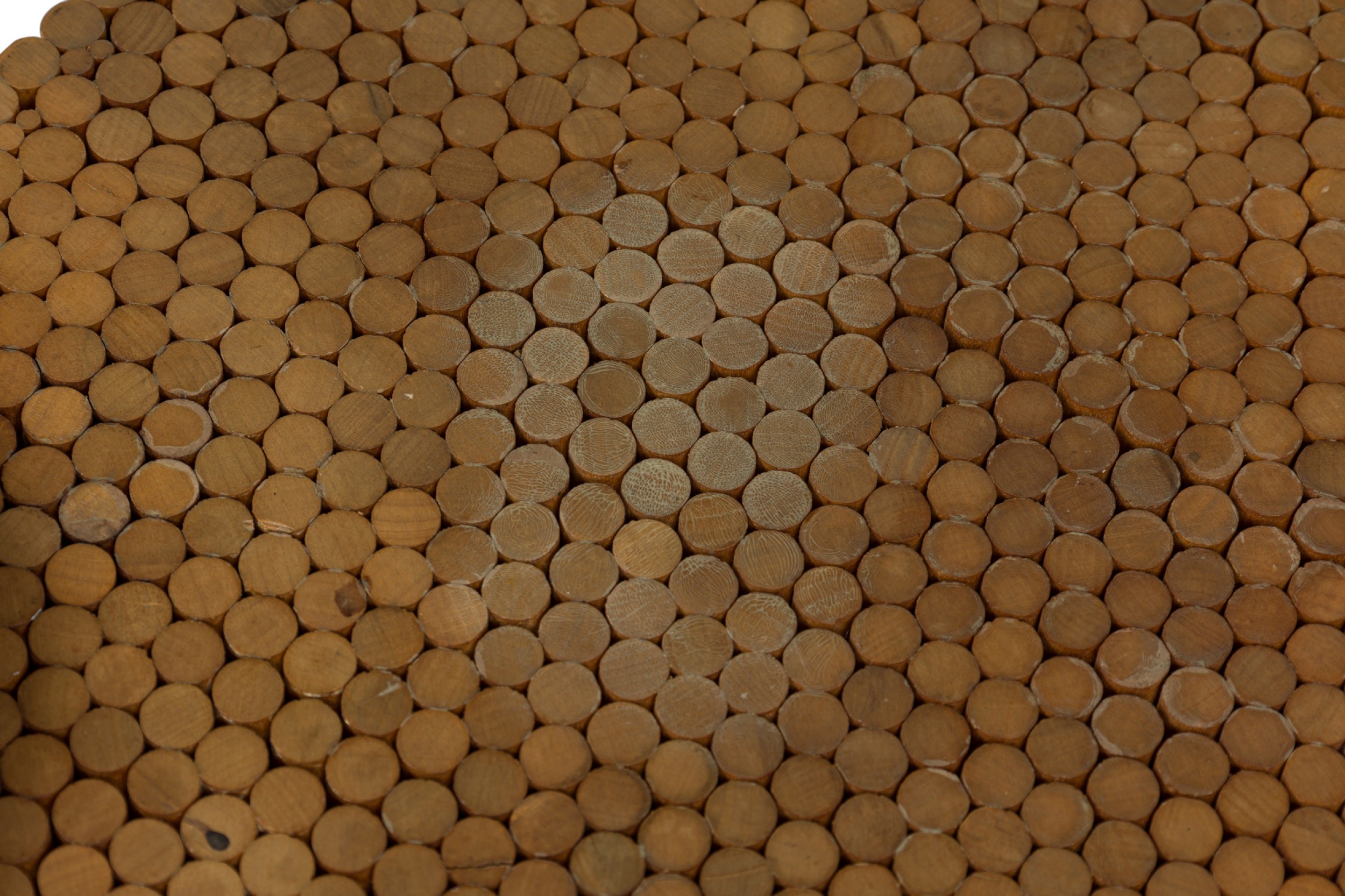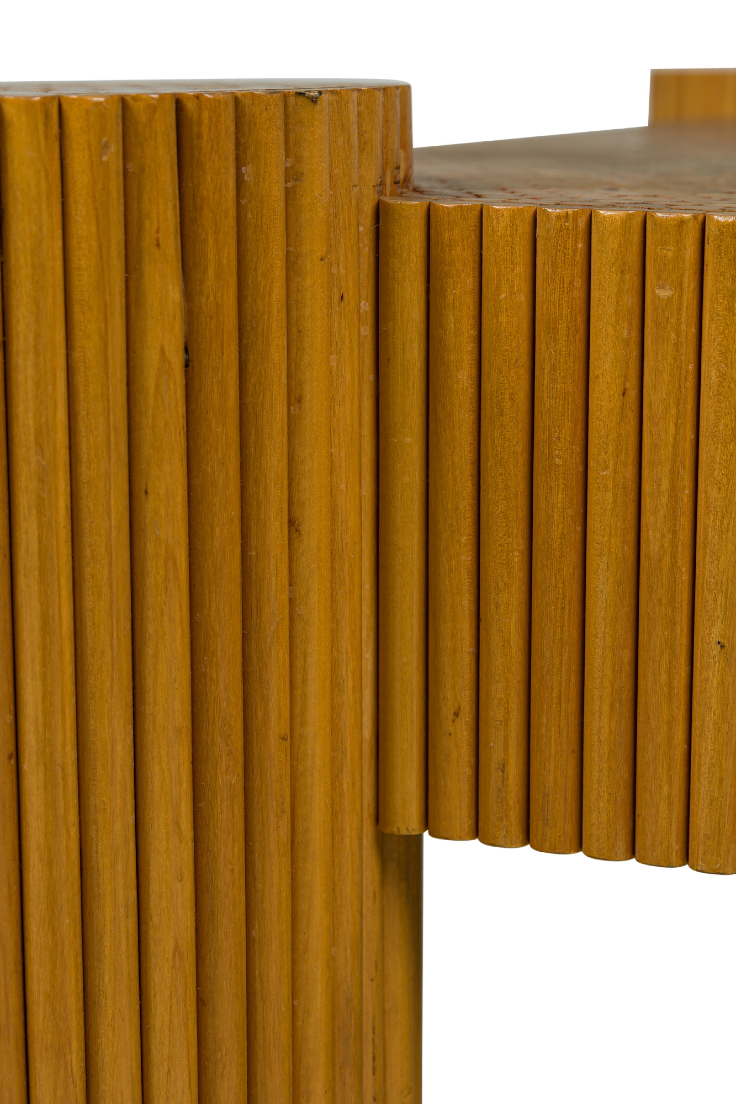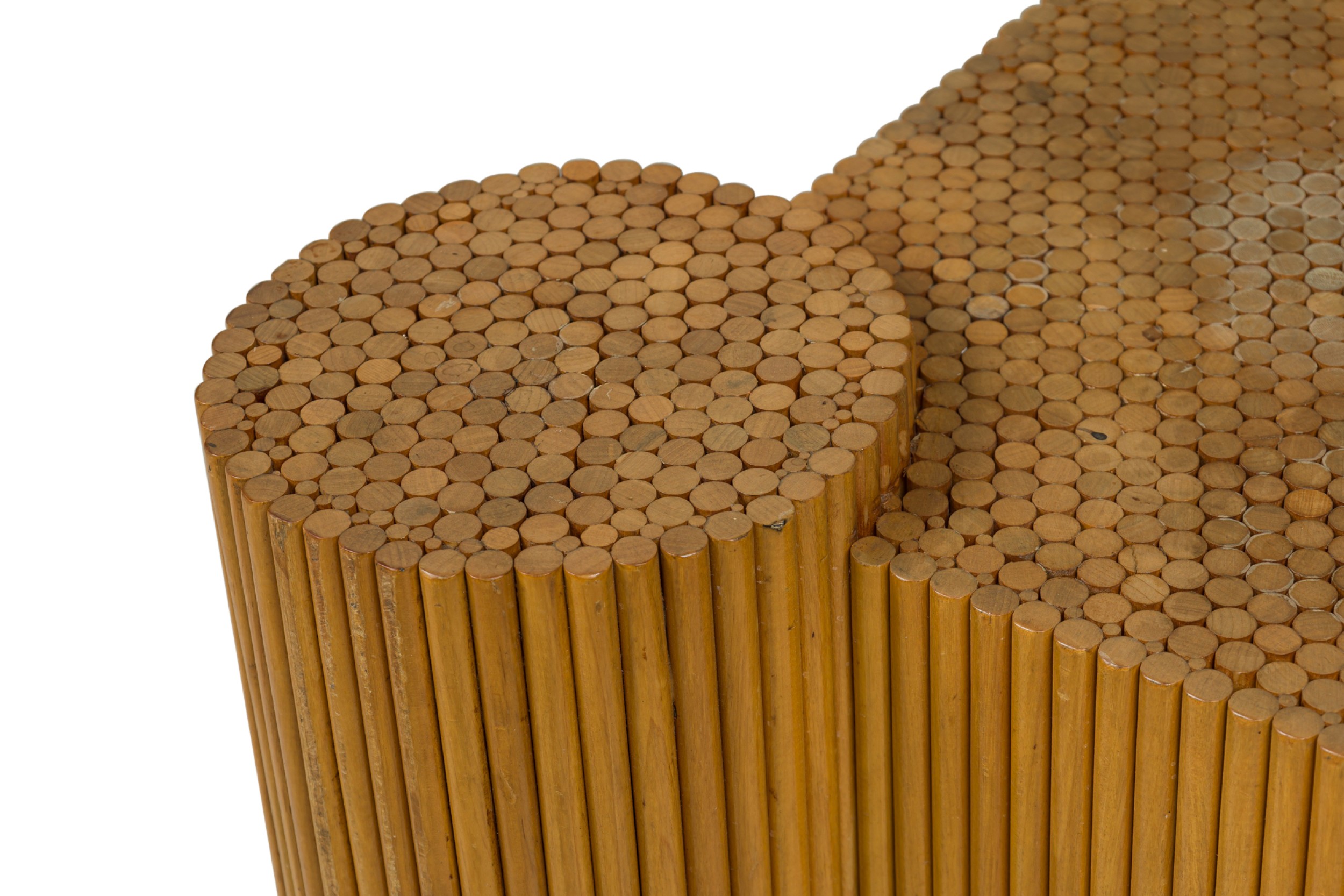 American Mid-Century Modern coffee table with square top and four exterior cylindrical legs comprised of bonded bamboo dowels. (ERNEST C. MASI)