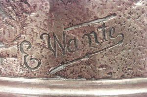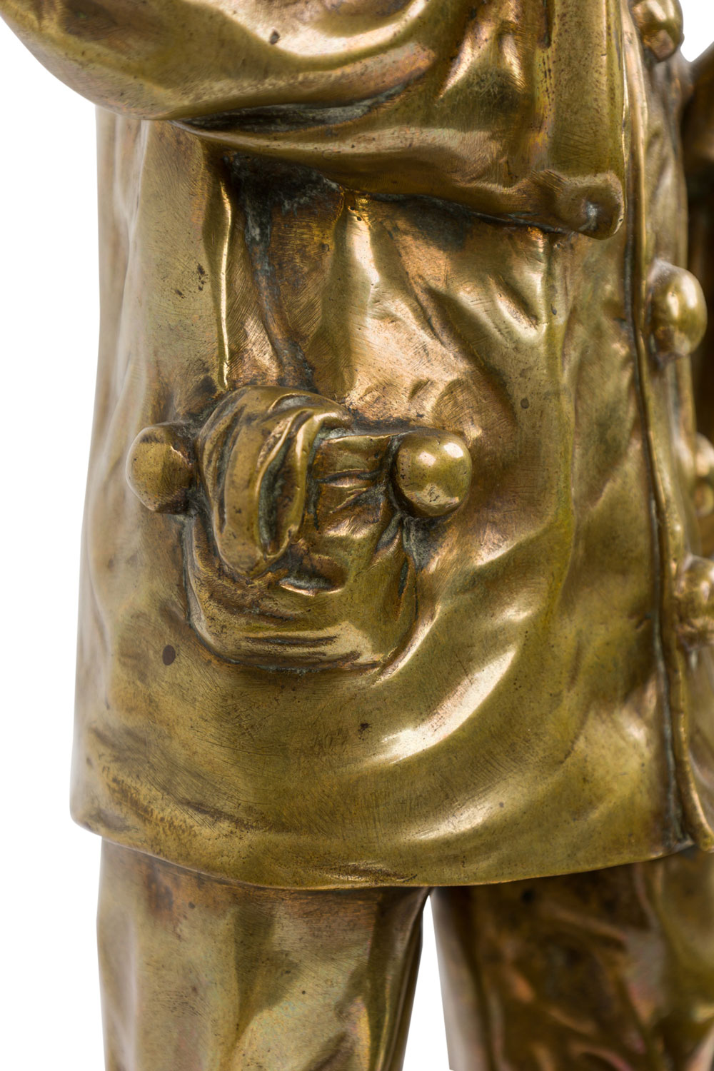 Continental Belgian (late 19th Century) bronze figure of Pierrot (possiblyJean-Gaspard Deburau) dressed as a harlequin playing with a duck standing on a round base (signed, ERNEST WANTE).