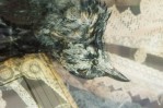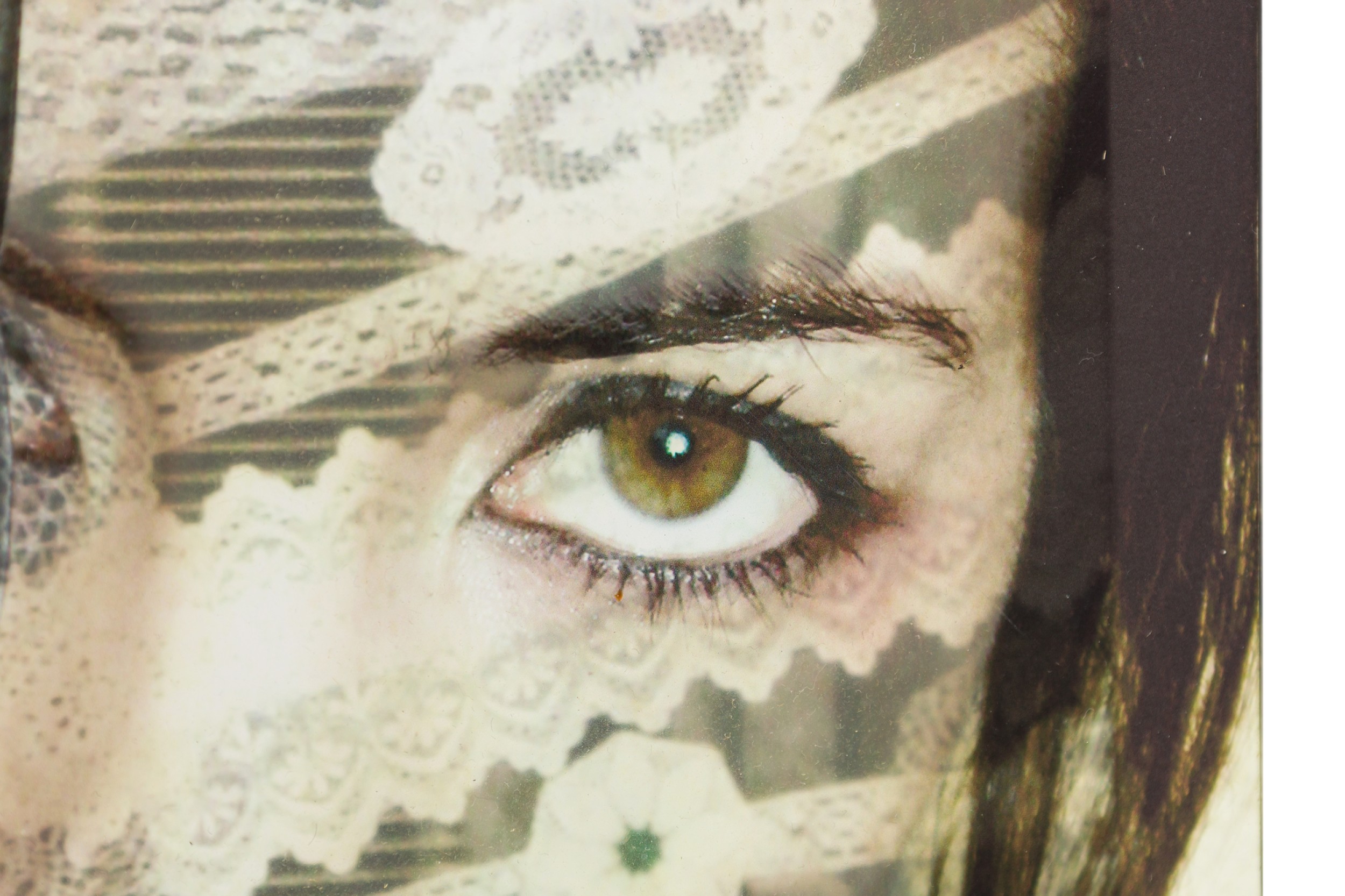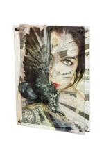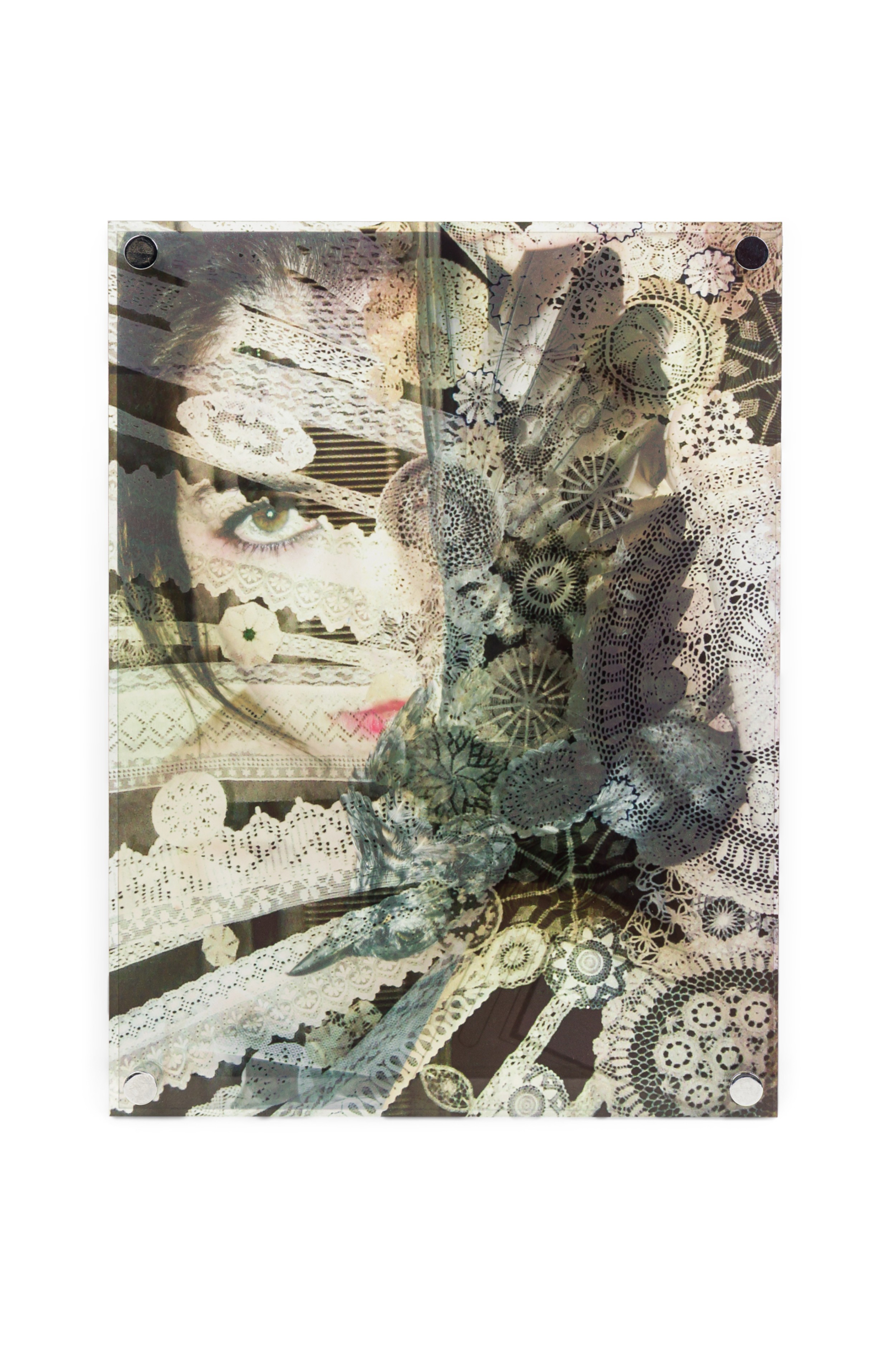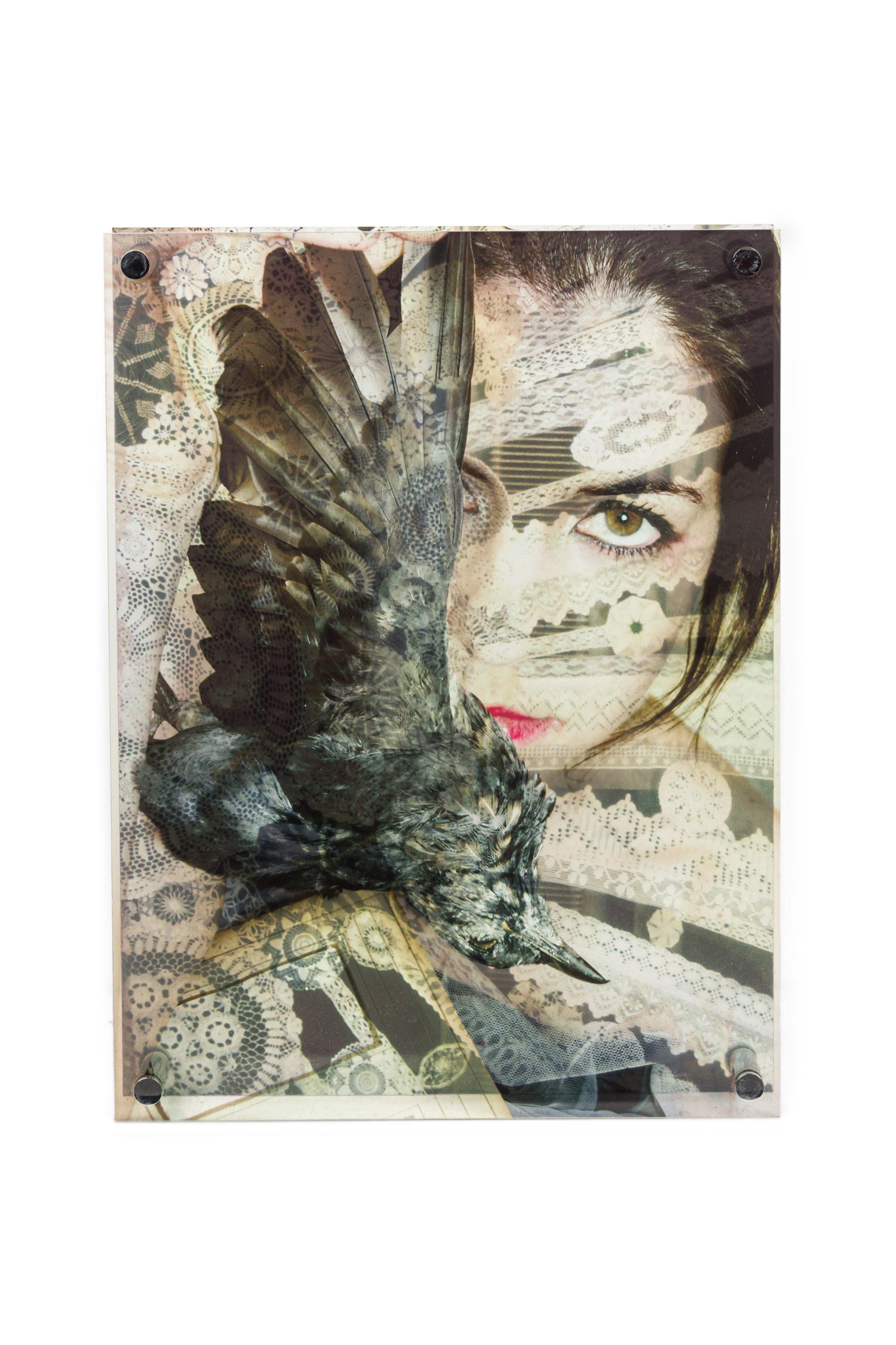 Contemporary mixed media free standing artwork consisting of 2 chromogenic prints on duraflex foil mounted on plexiglass spaced apart to create a layered composition of a female face slightly obscured by a crow and laced background (EVA PETRIC).