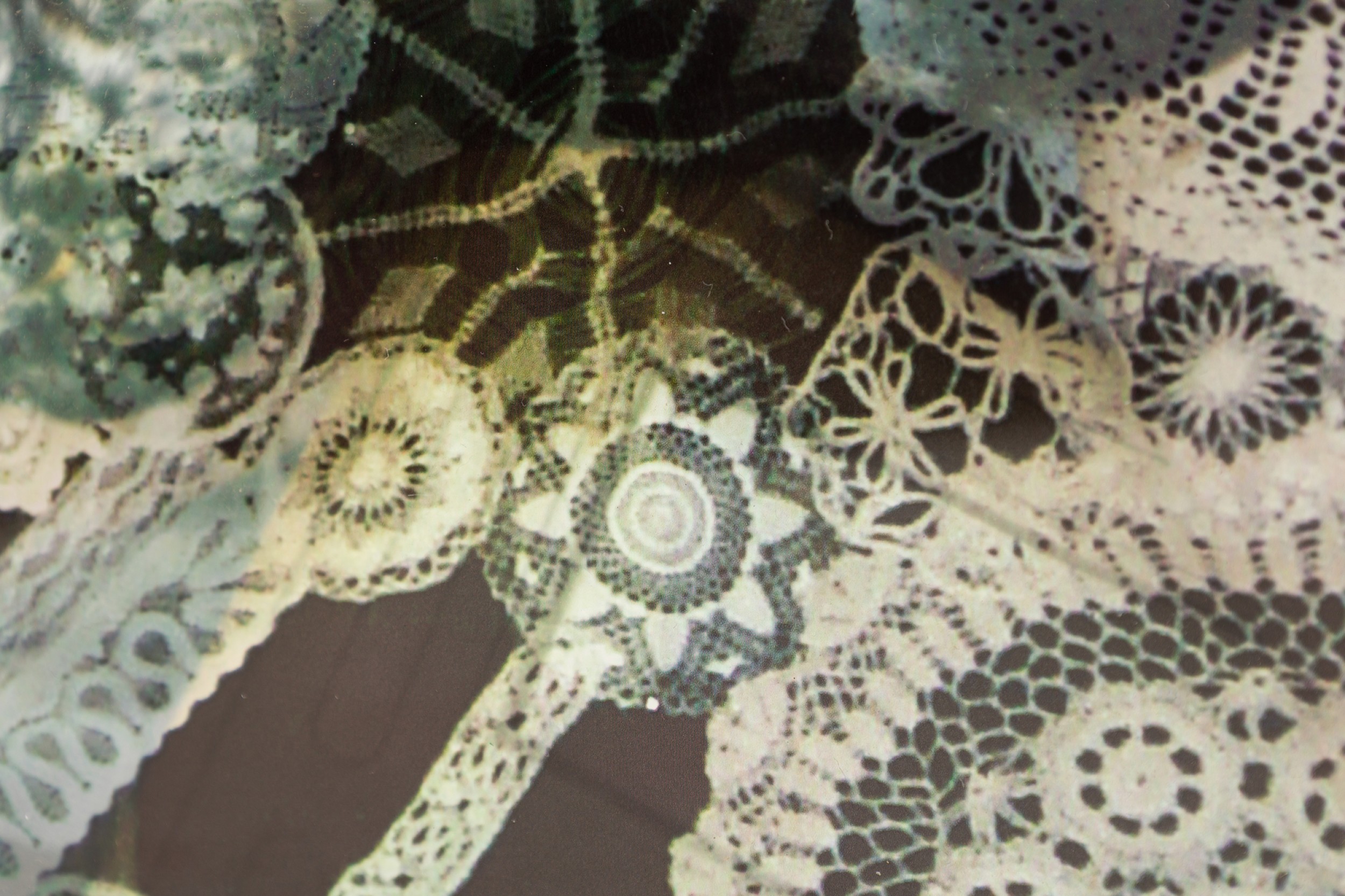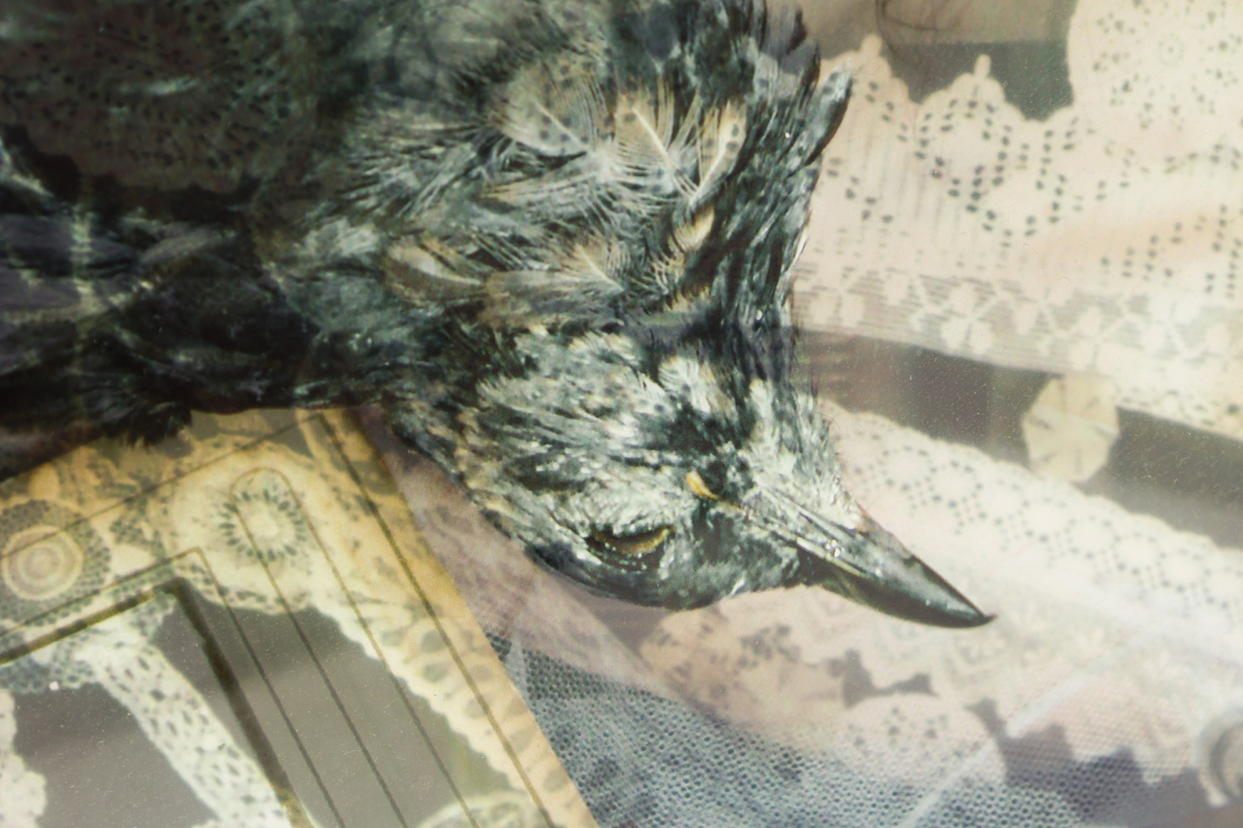 Contemporary mixed media free standing artwork consisting of 2 chromogenic prints on duraflex foil mounted on plexiglass spaced apart to create a layered composition of a female face slightly obscured by a crow and laced background (EVA PETRIC)