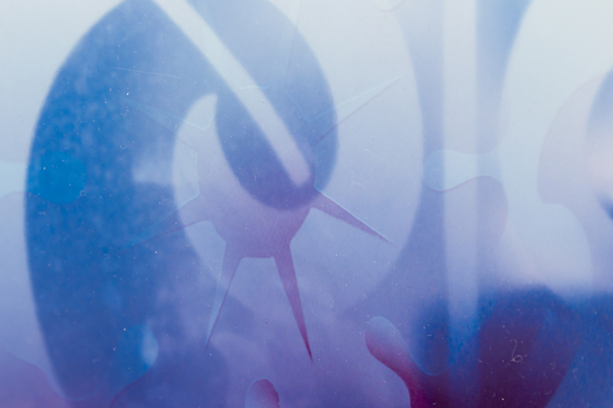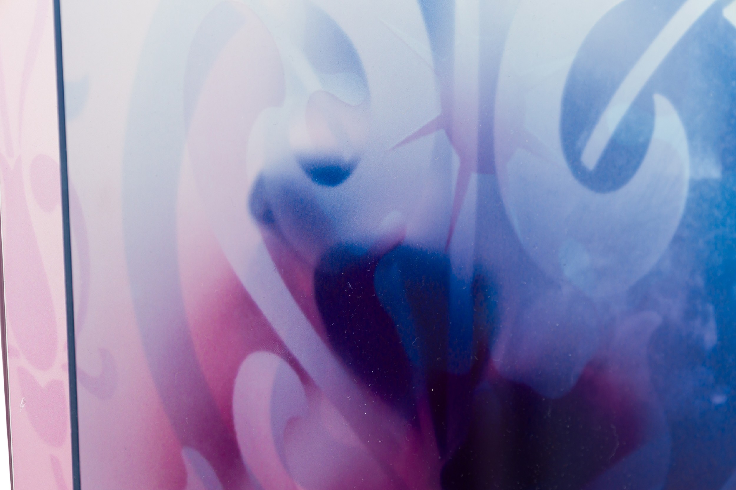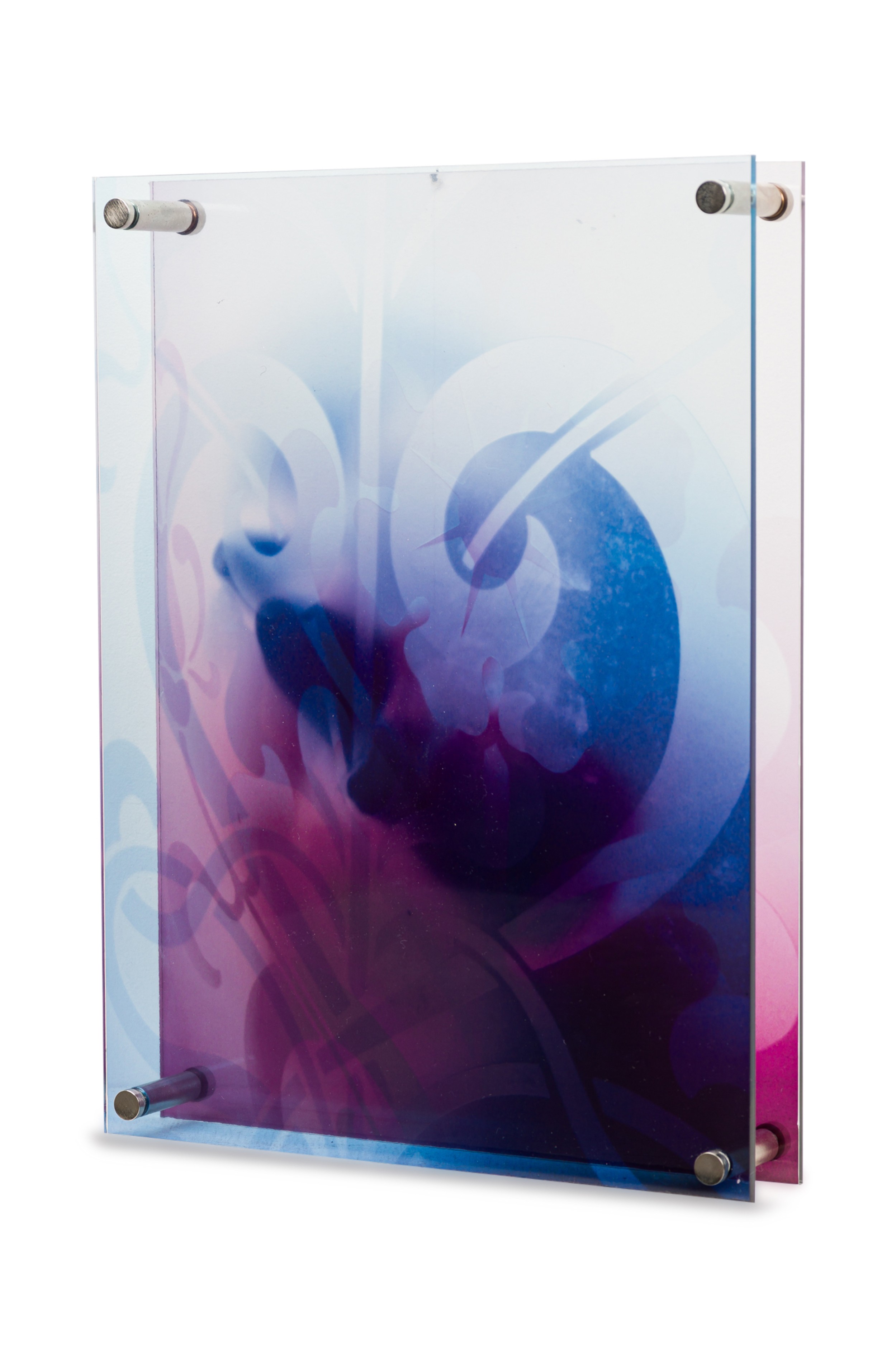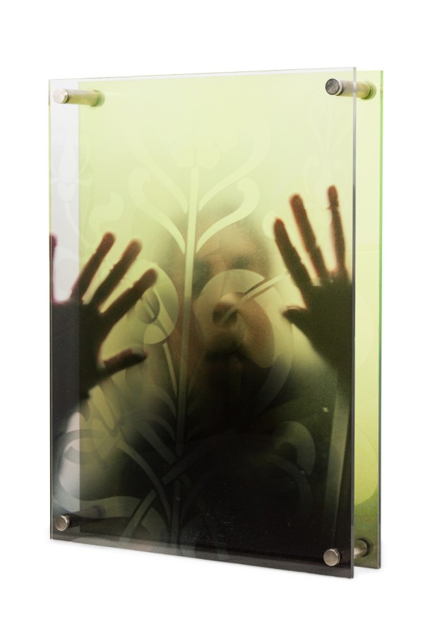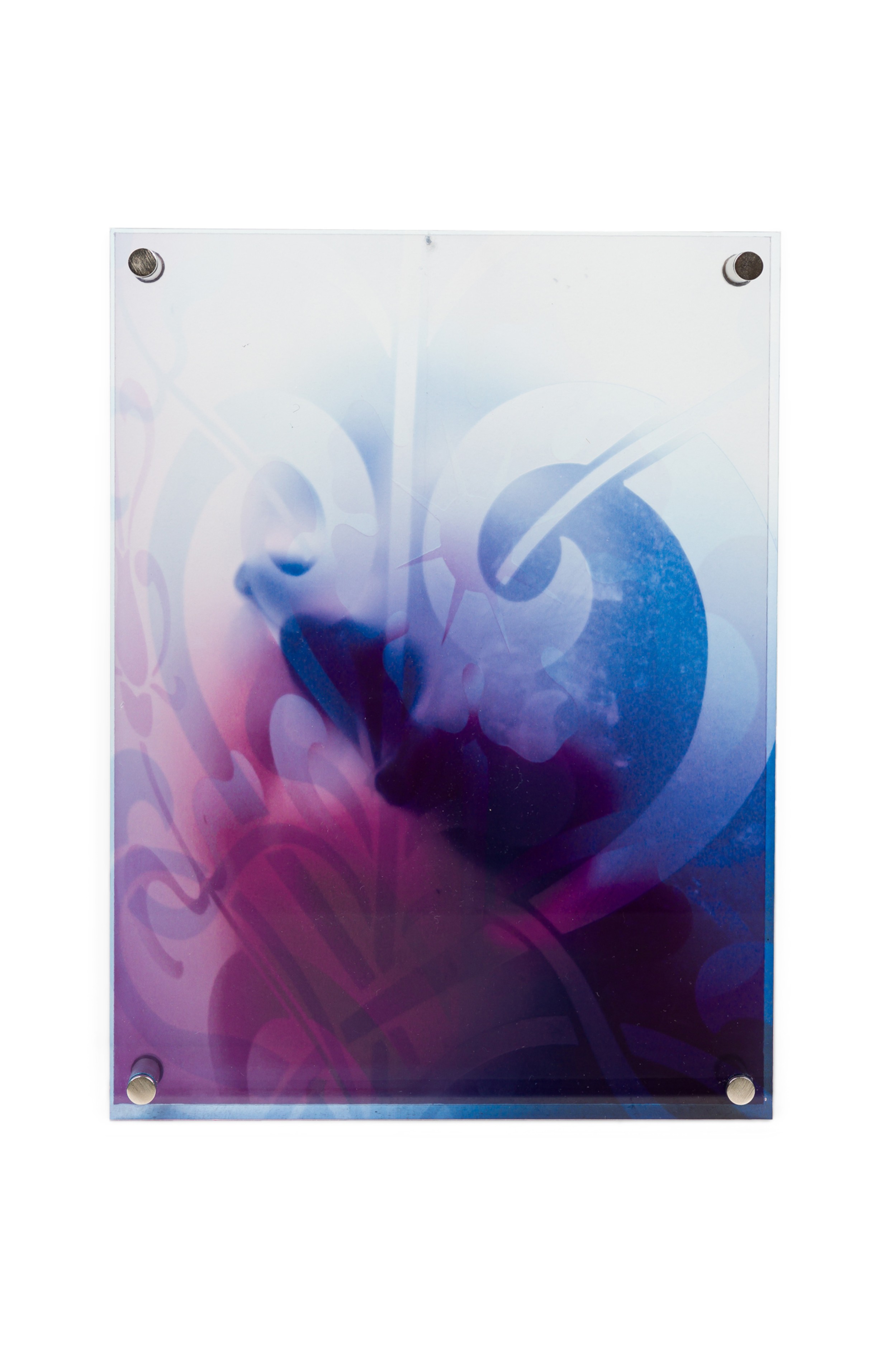 Contemporary mixed media free standing artwork consisting of 2 chromogenic prints on duraflex foil mounted on plexiglass spaced apart to create a layered composition of red and blue floral design and a distorted face (EVA PETRIC).