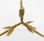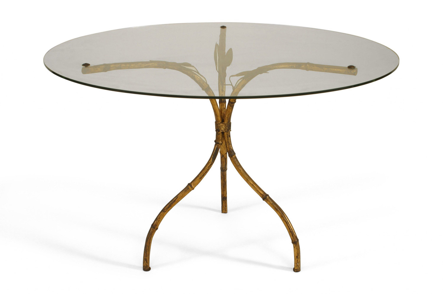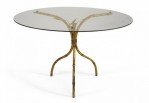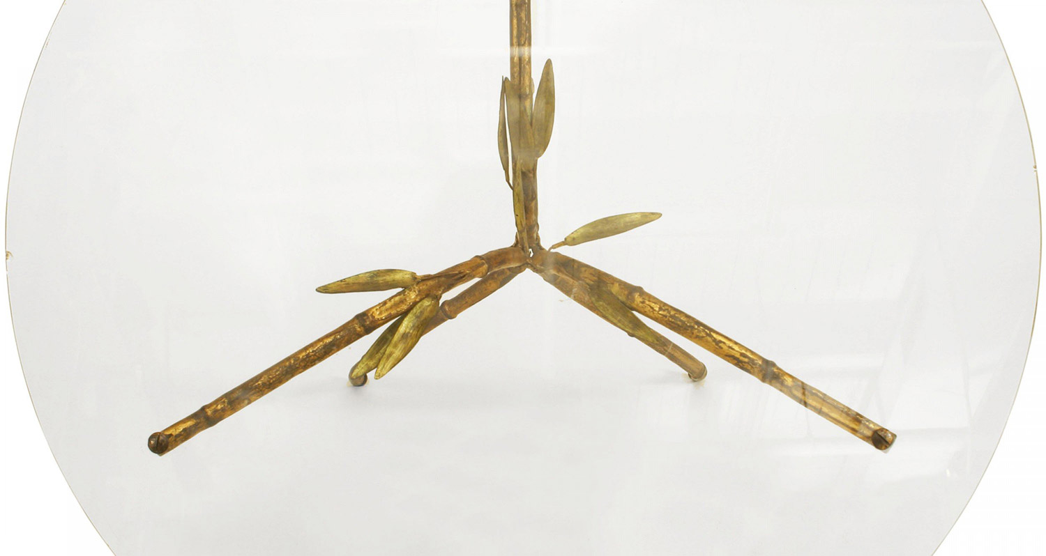 Faux Bamboo (1940s) gilt metal coffee table with three legs trimmed with metal leaves and round glass top.