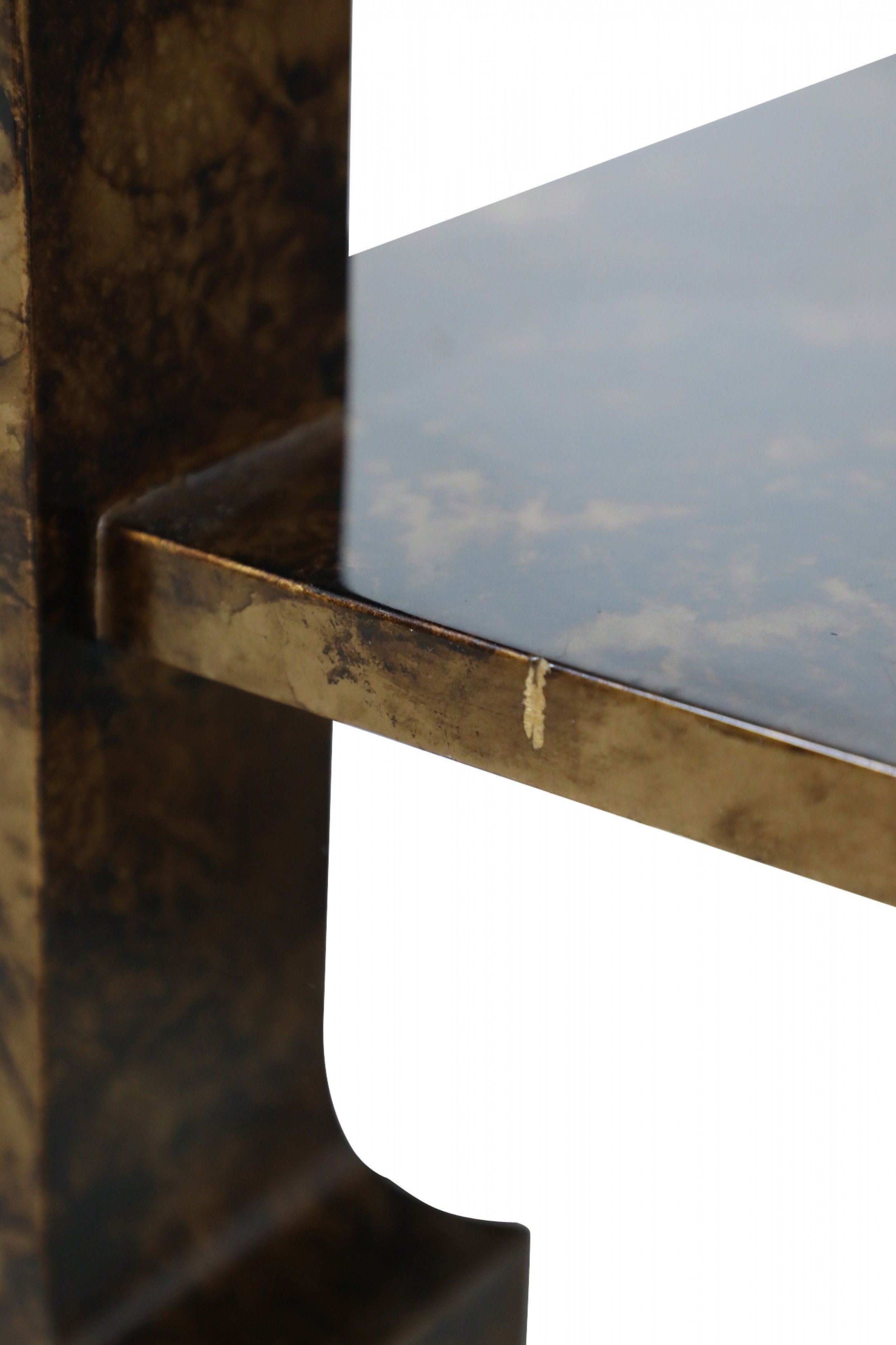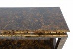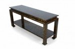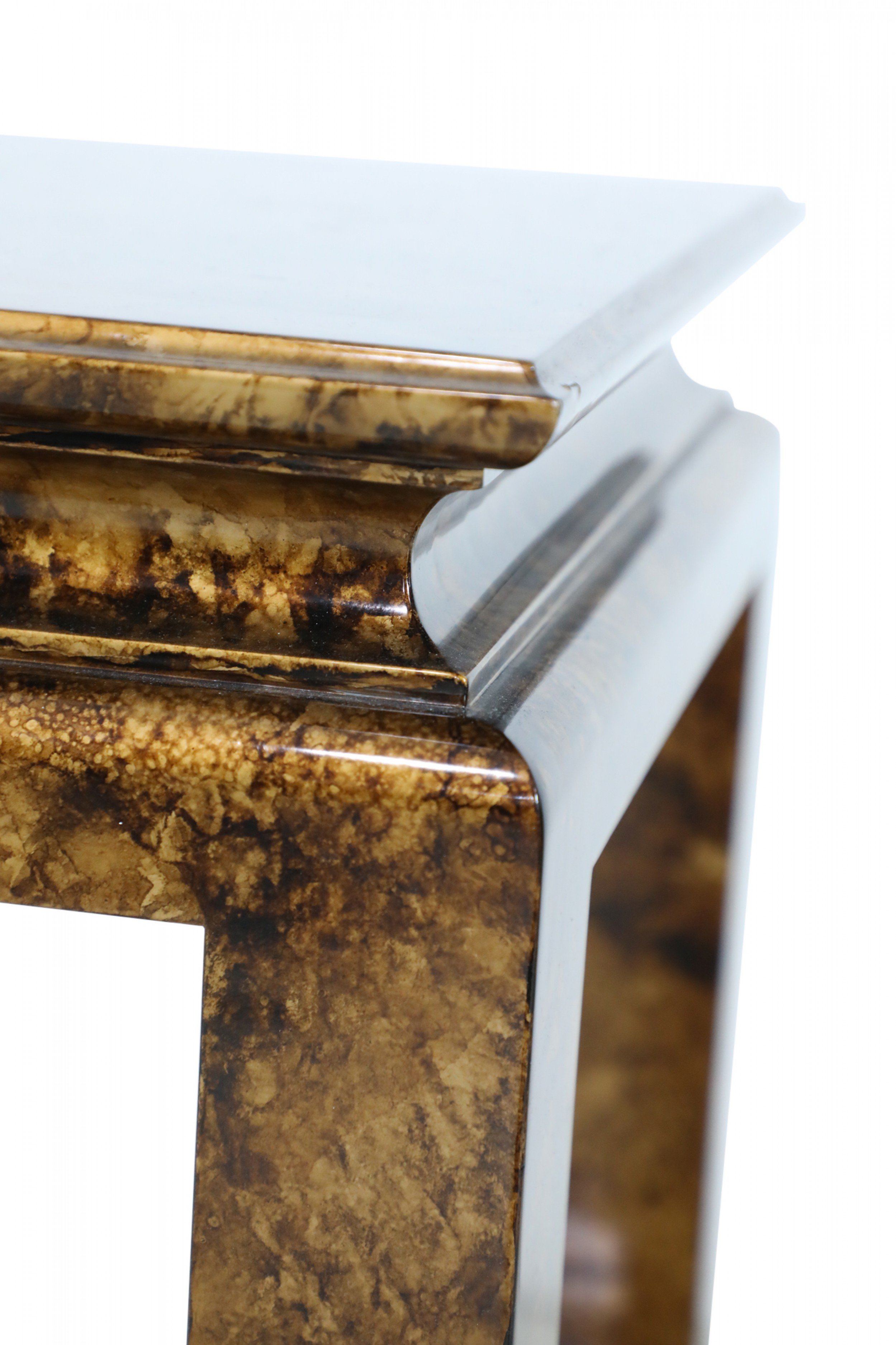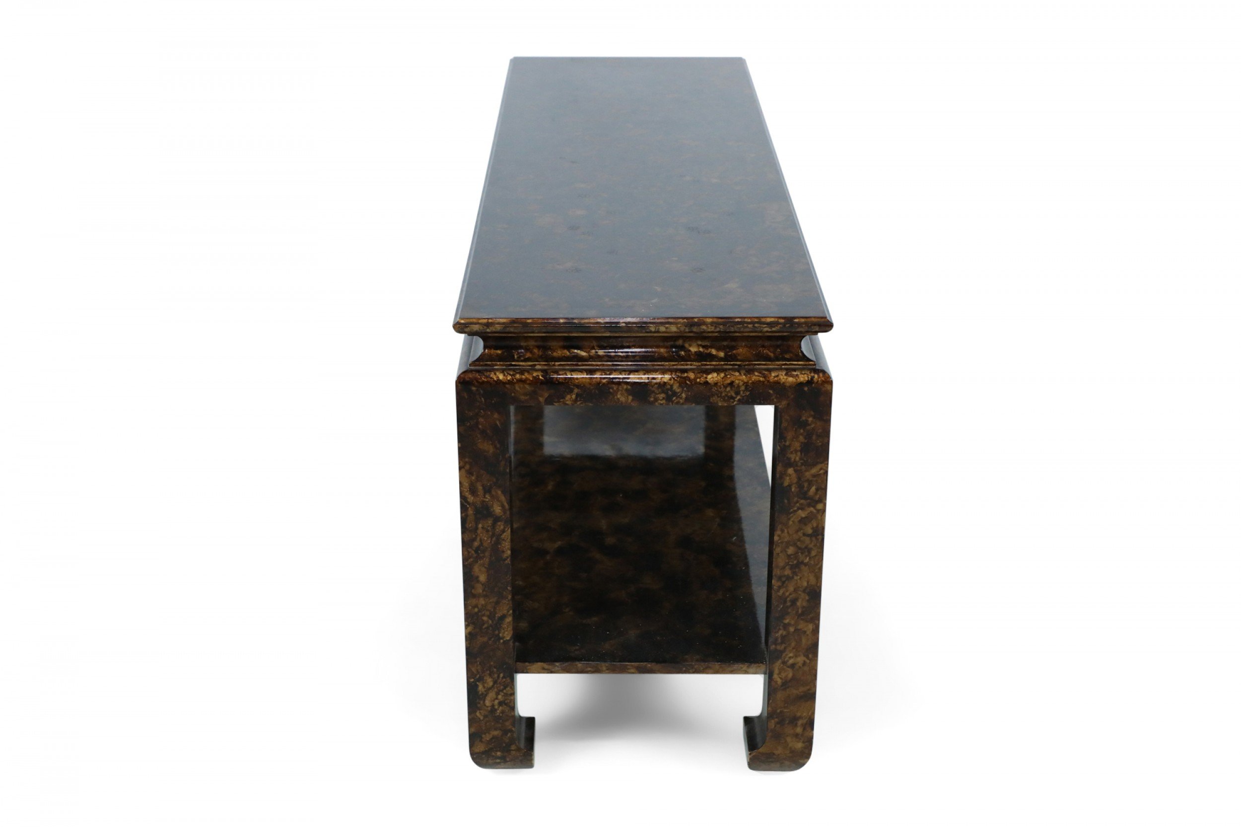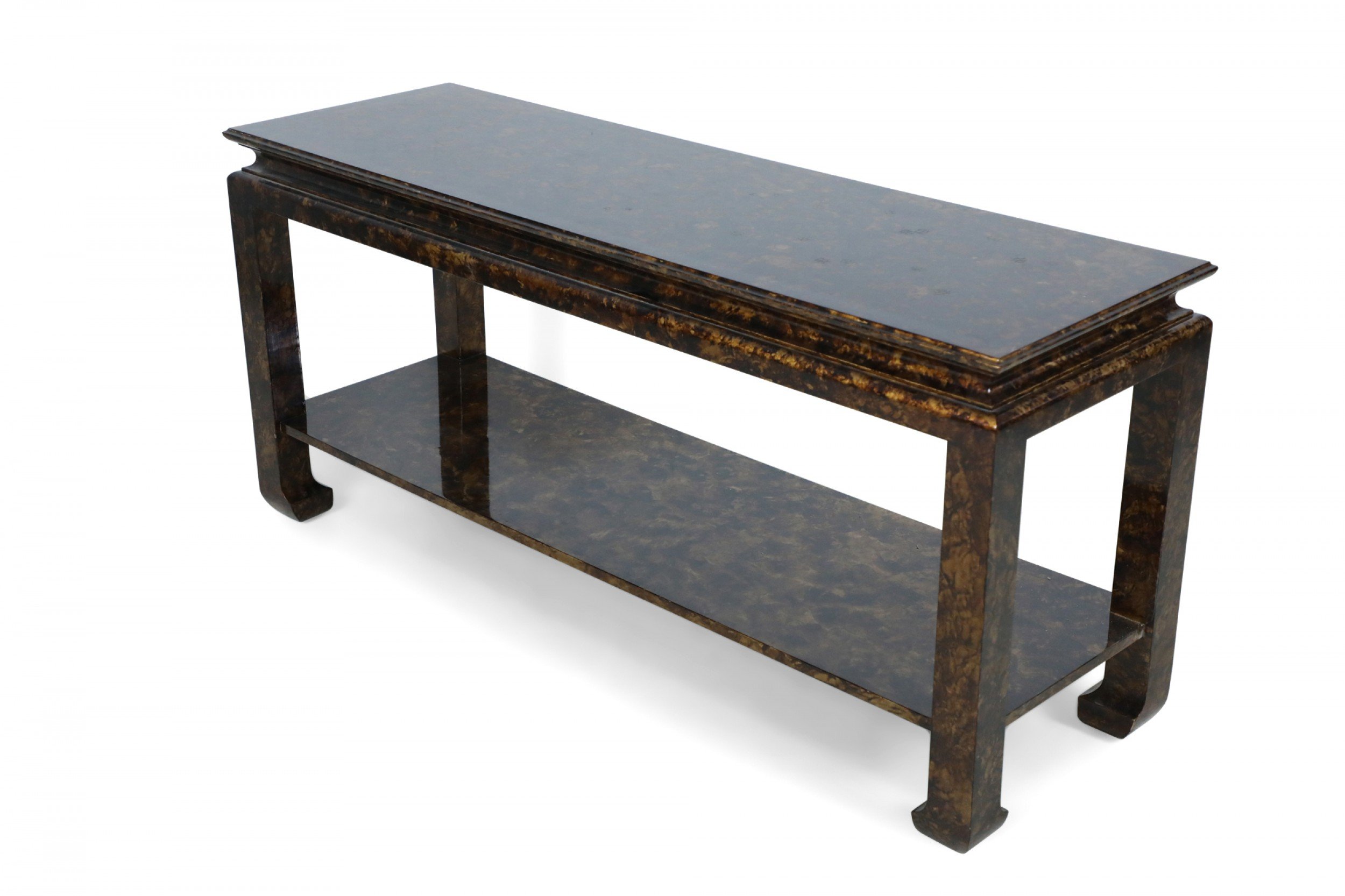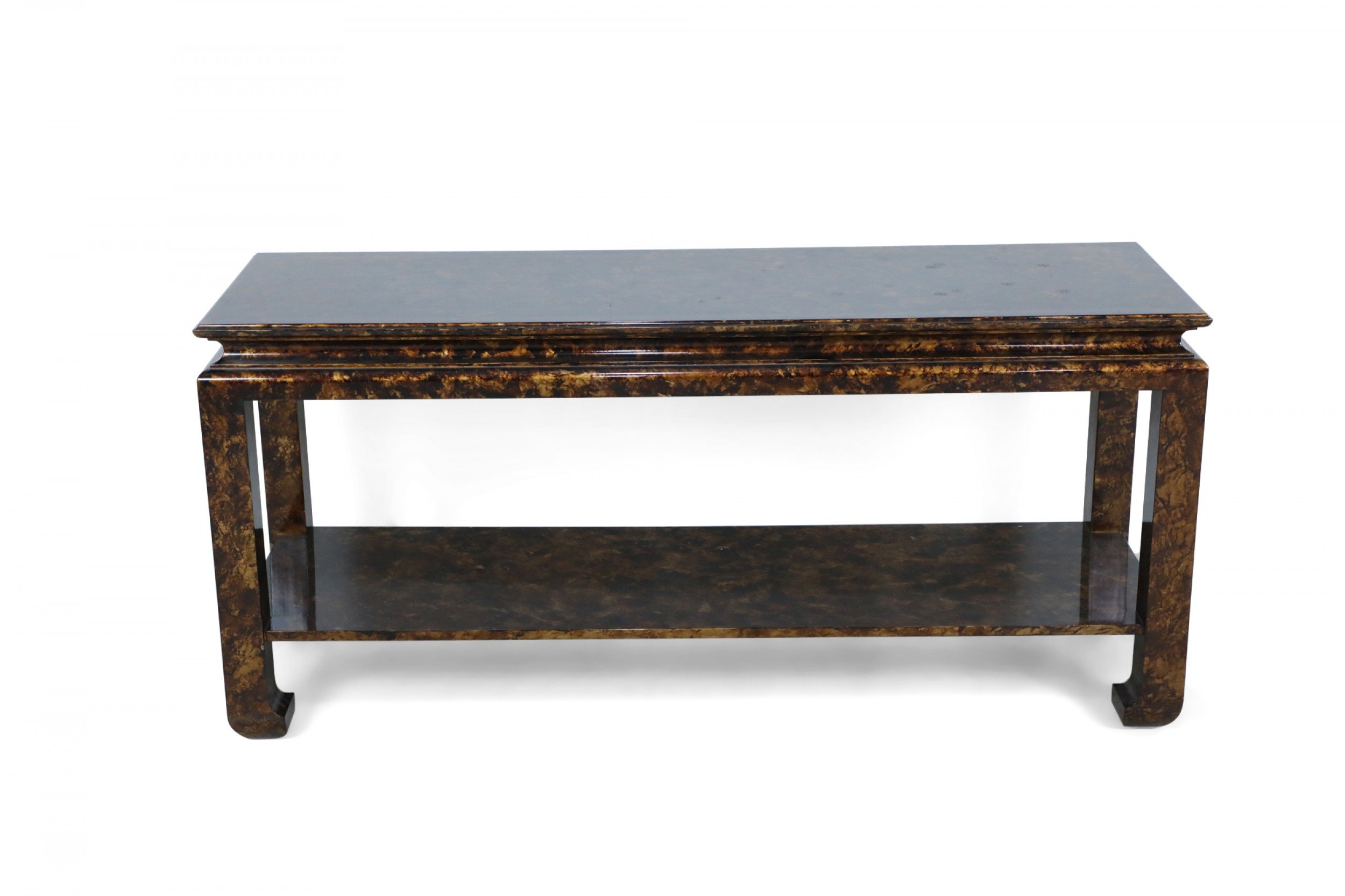 Mid-Century Chinoiserie style rectangular console table with a faux tortoise shell veneer, high gloss lacquered finish, and lower shelf.