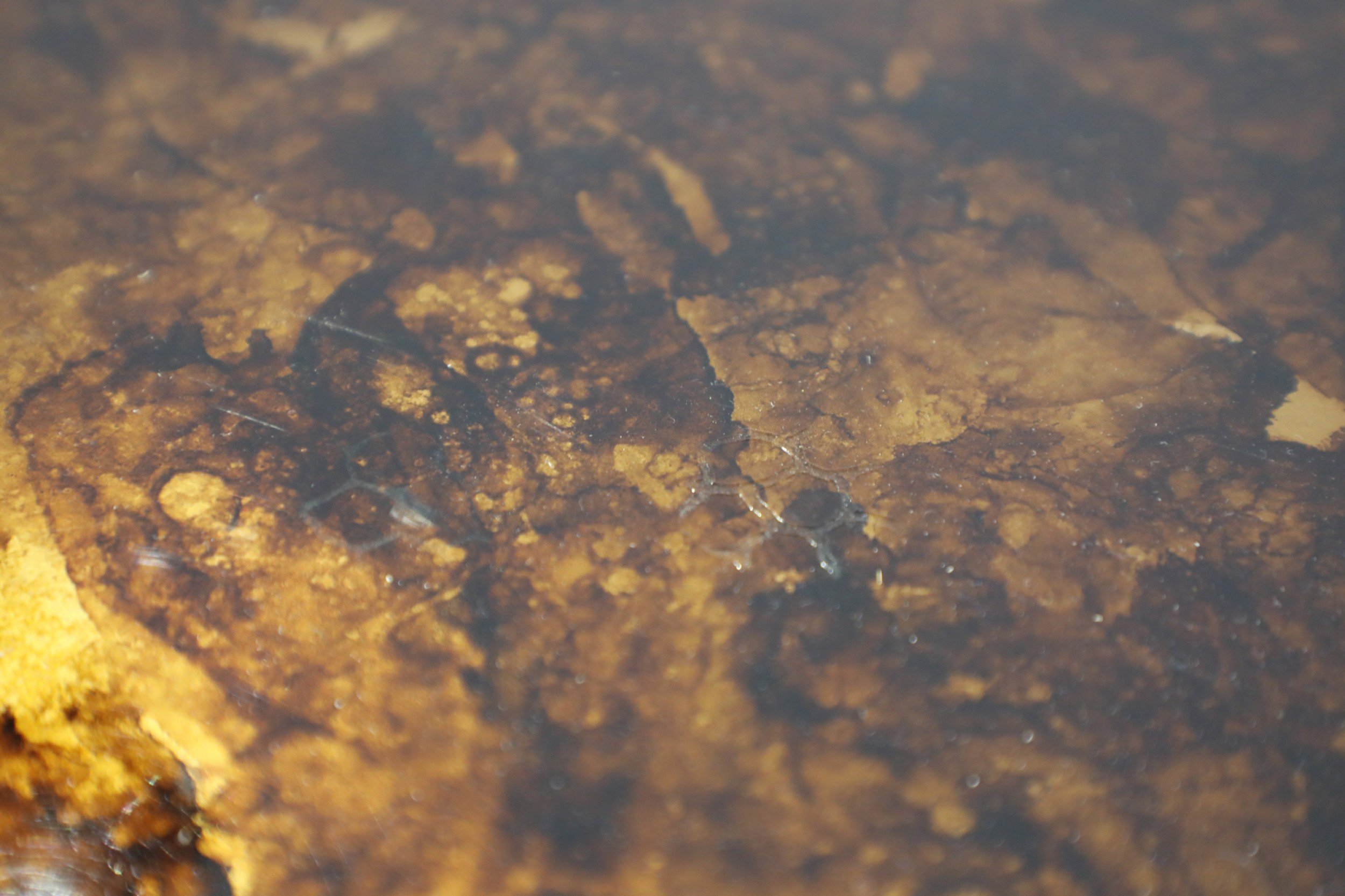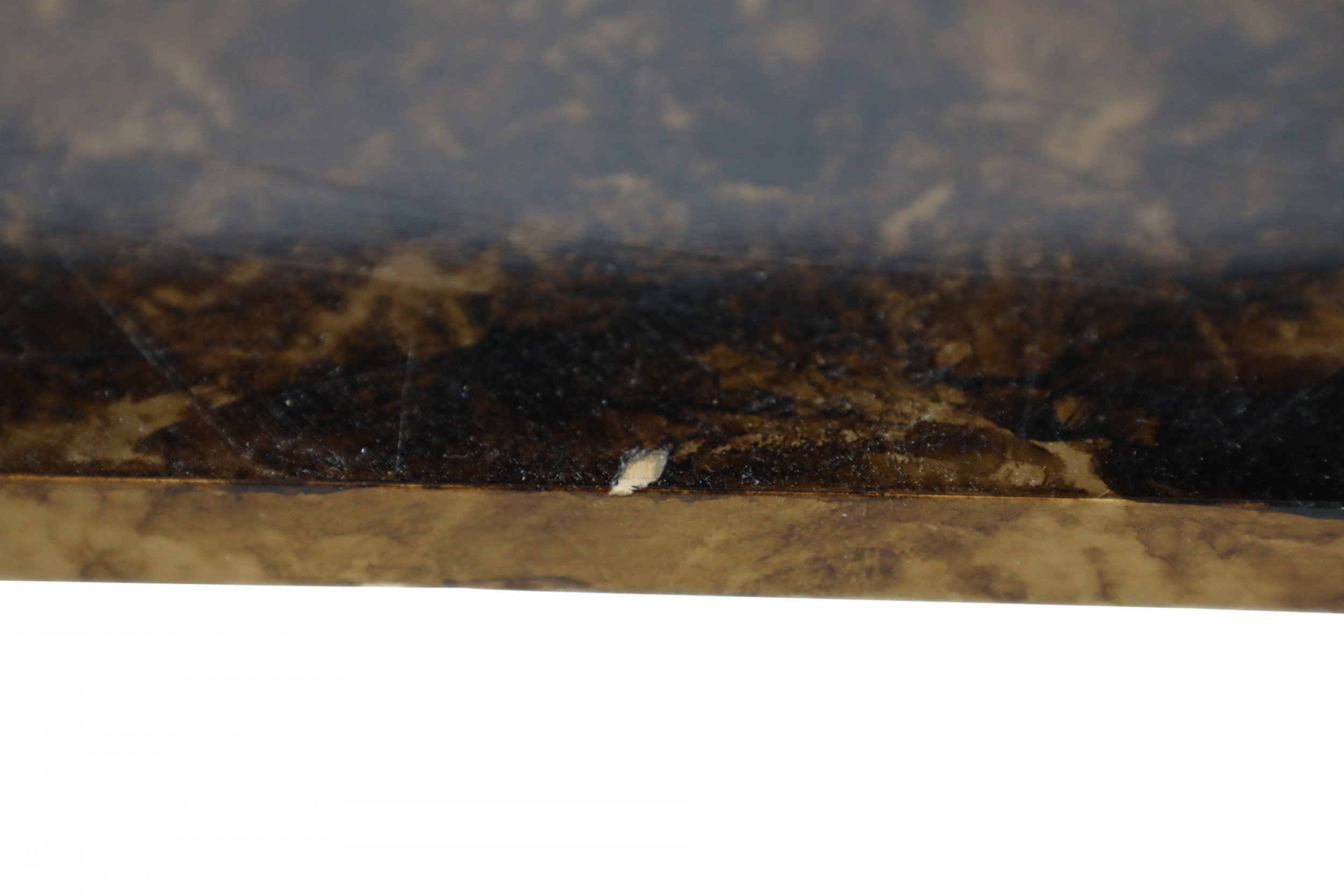 Style: Mid-Century Materials & Techniques: Veneer, wood, tortoise-shell Category: Tables, Dining Room Condition: Small hexagonal impressions left in top lacquer finish in several places.