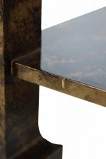 Mid-Century Chinoiserie style rectangular console table with a faux tortoise shell veneer, high gloss lacquered finish, and lower shelf..