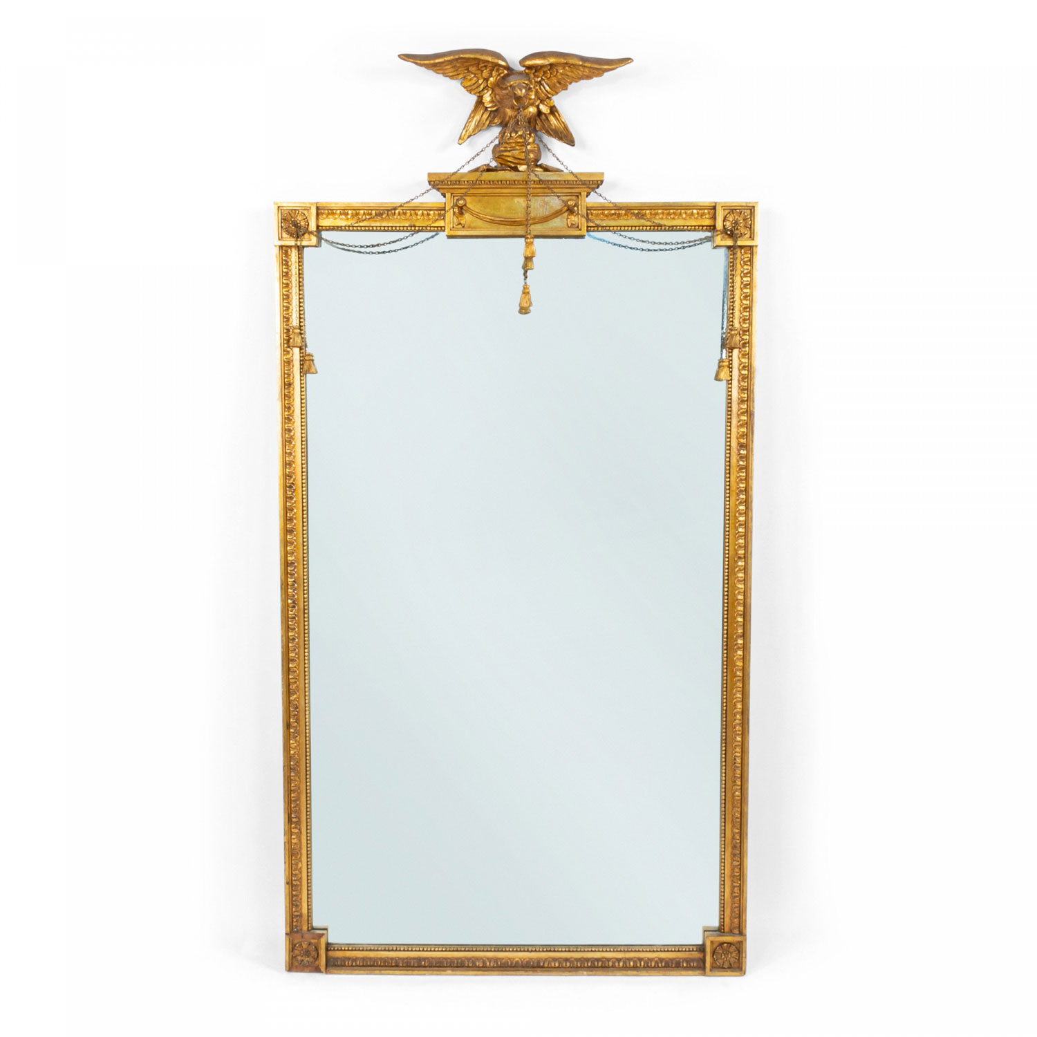 American Federal (19th Century) rectangular giltwood wall mirror surmounted on a stepped platform with a carved gilt eagle holding metal chain swags over an an egg and dart design frame with floral medallions in each corner.