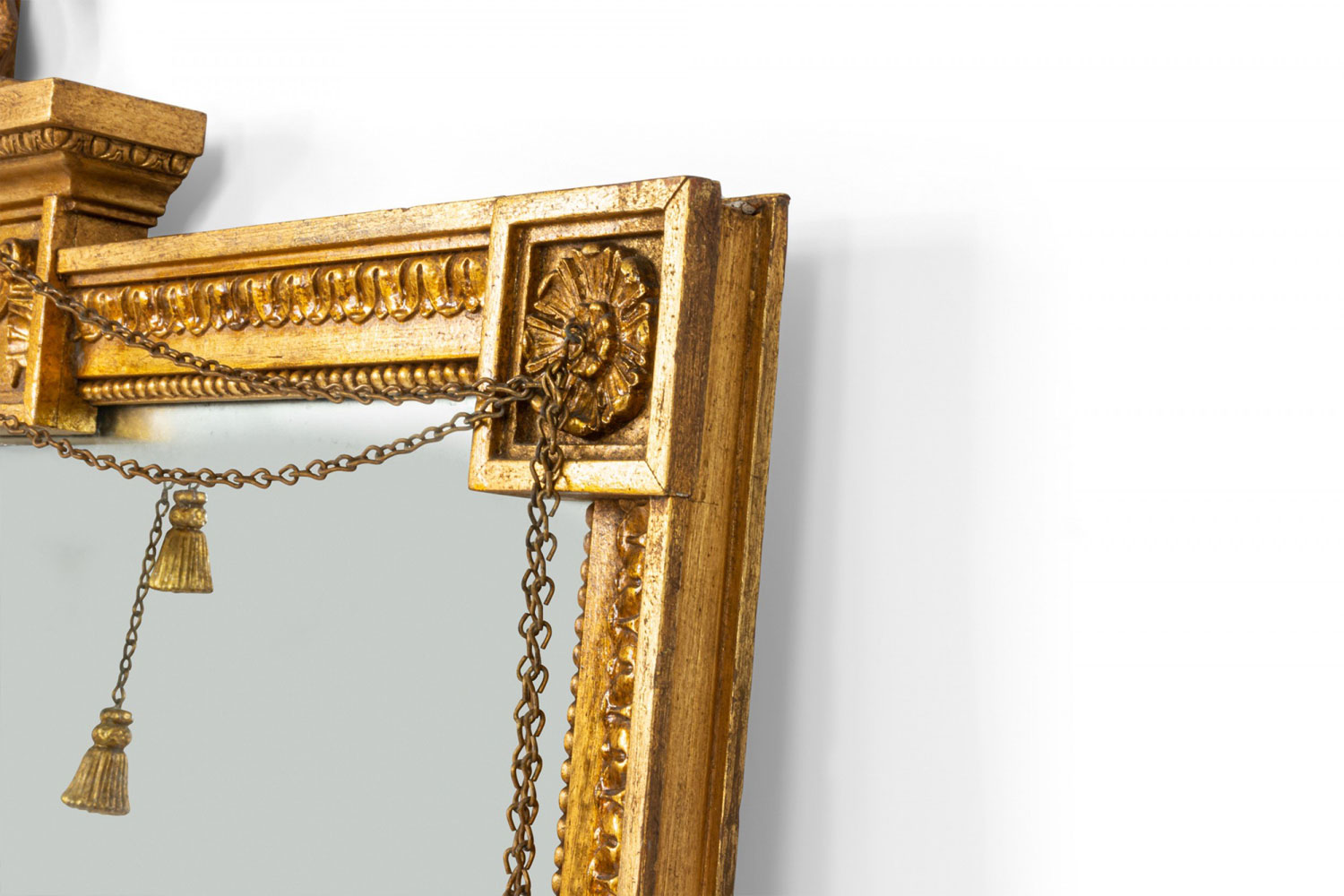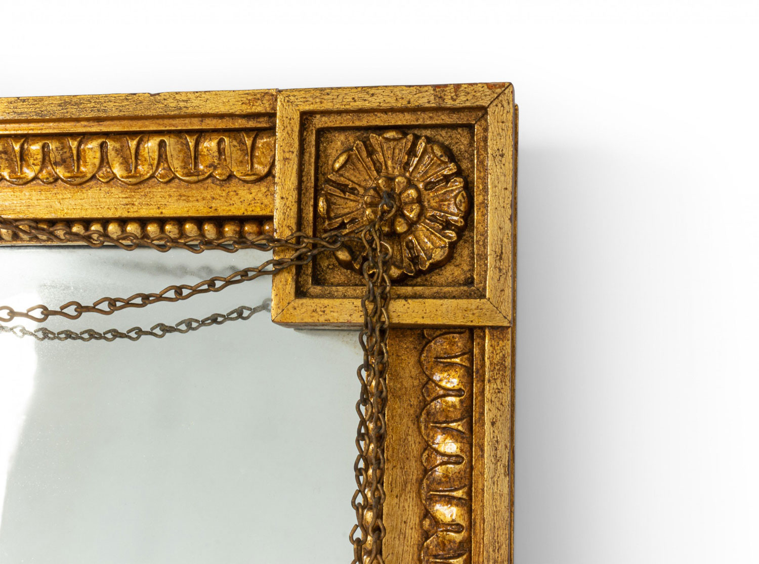 American Federal (19th Century) rectangular giltwood wall mirror surmounted on a stepped platform with a carved gilt eagle holding metal chain swags over an an egg and dart design frame with floral medallions in each corner..