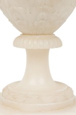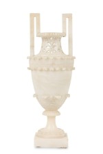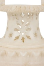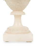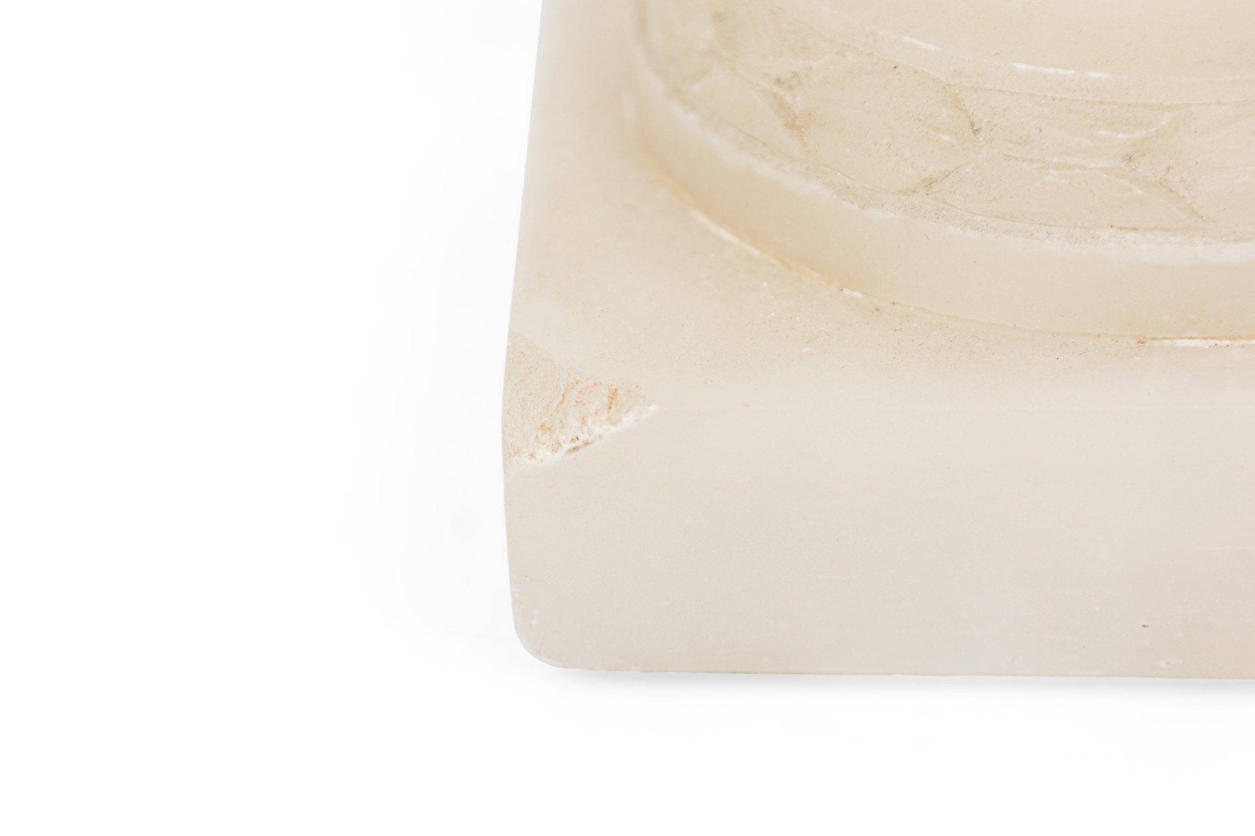 Italian Neo-Classic Fine Alabaster Grand Tour (19th Century) Urn with carved floral details and filigree design top section having 2 handles and resting on a square base (1 handle repaired; small chip on base.