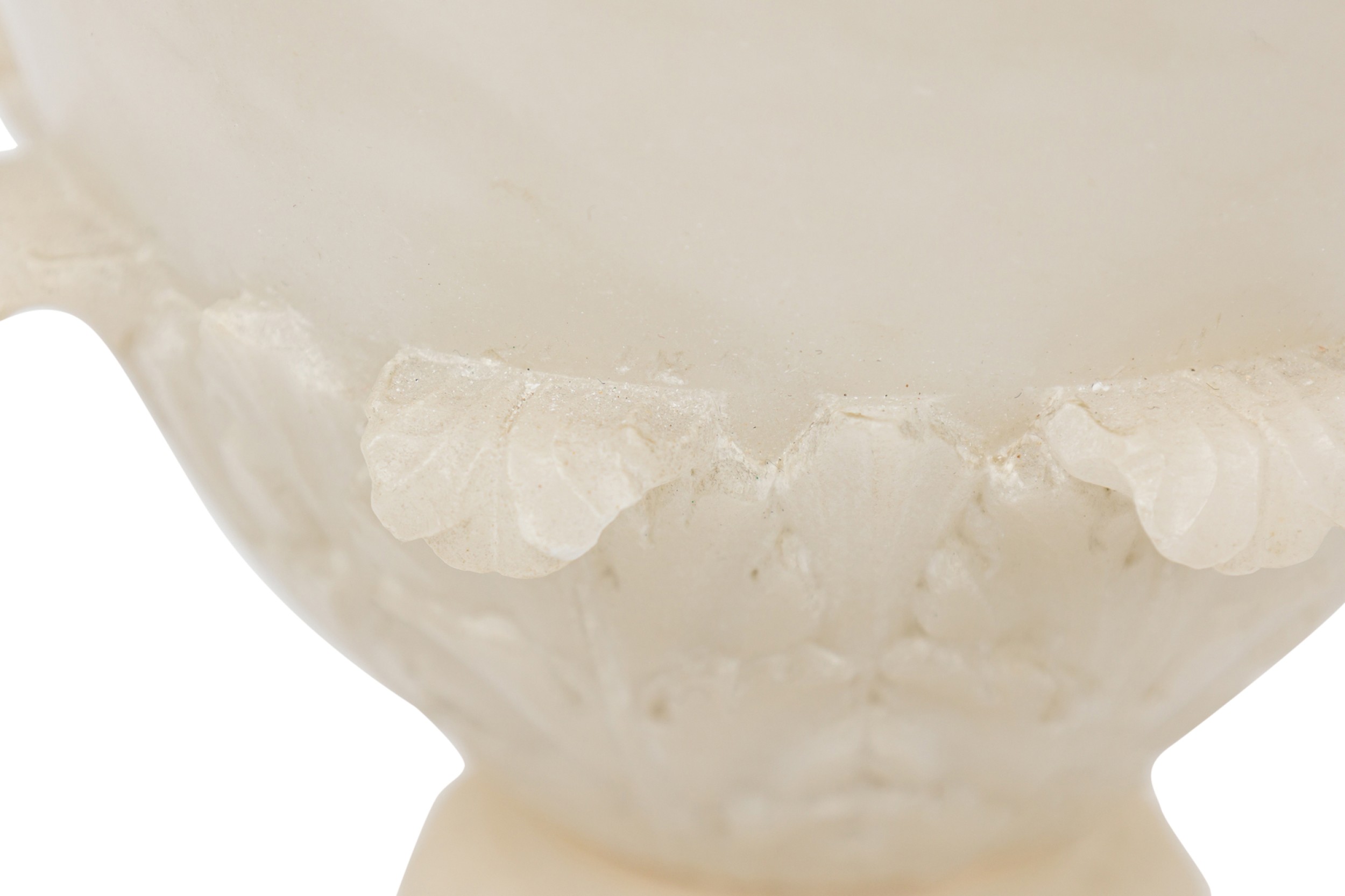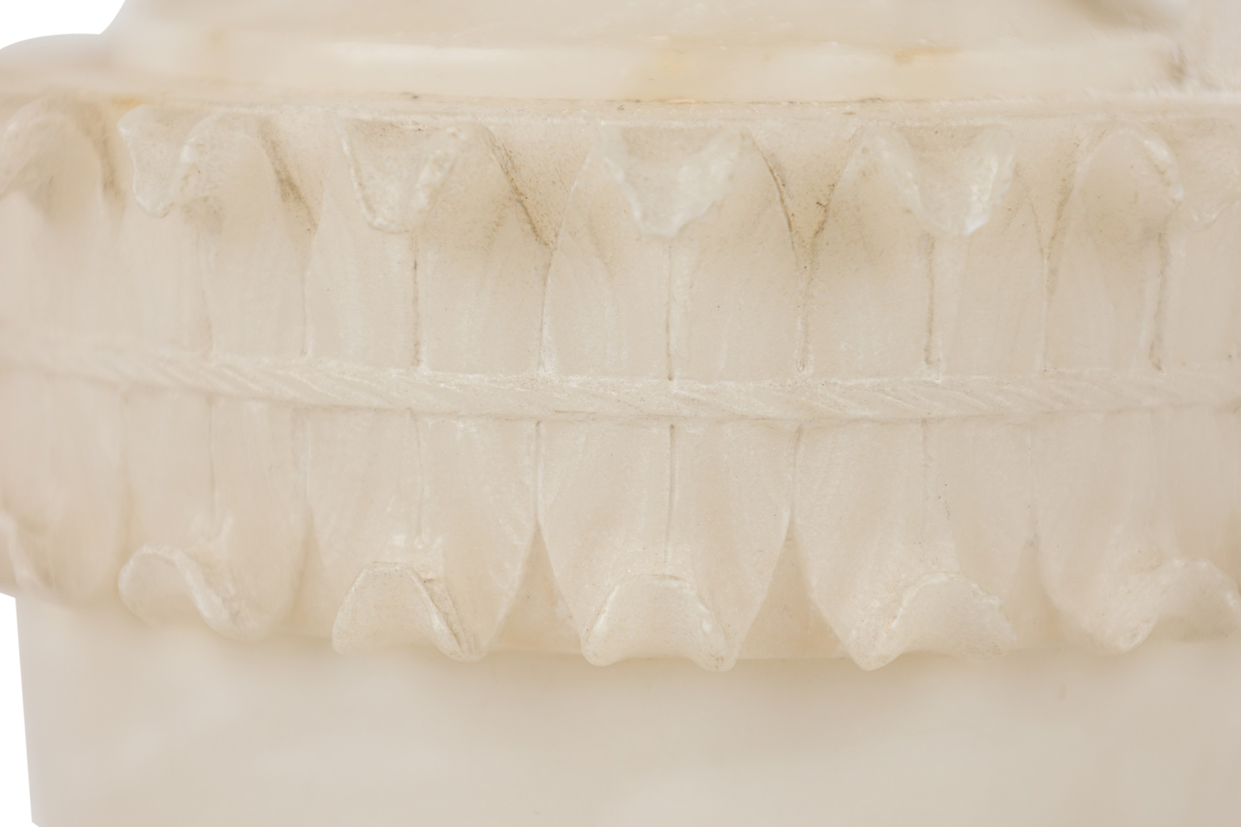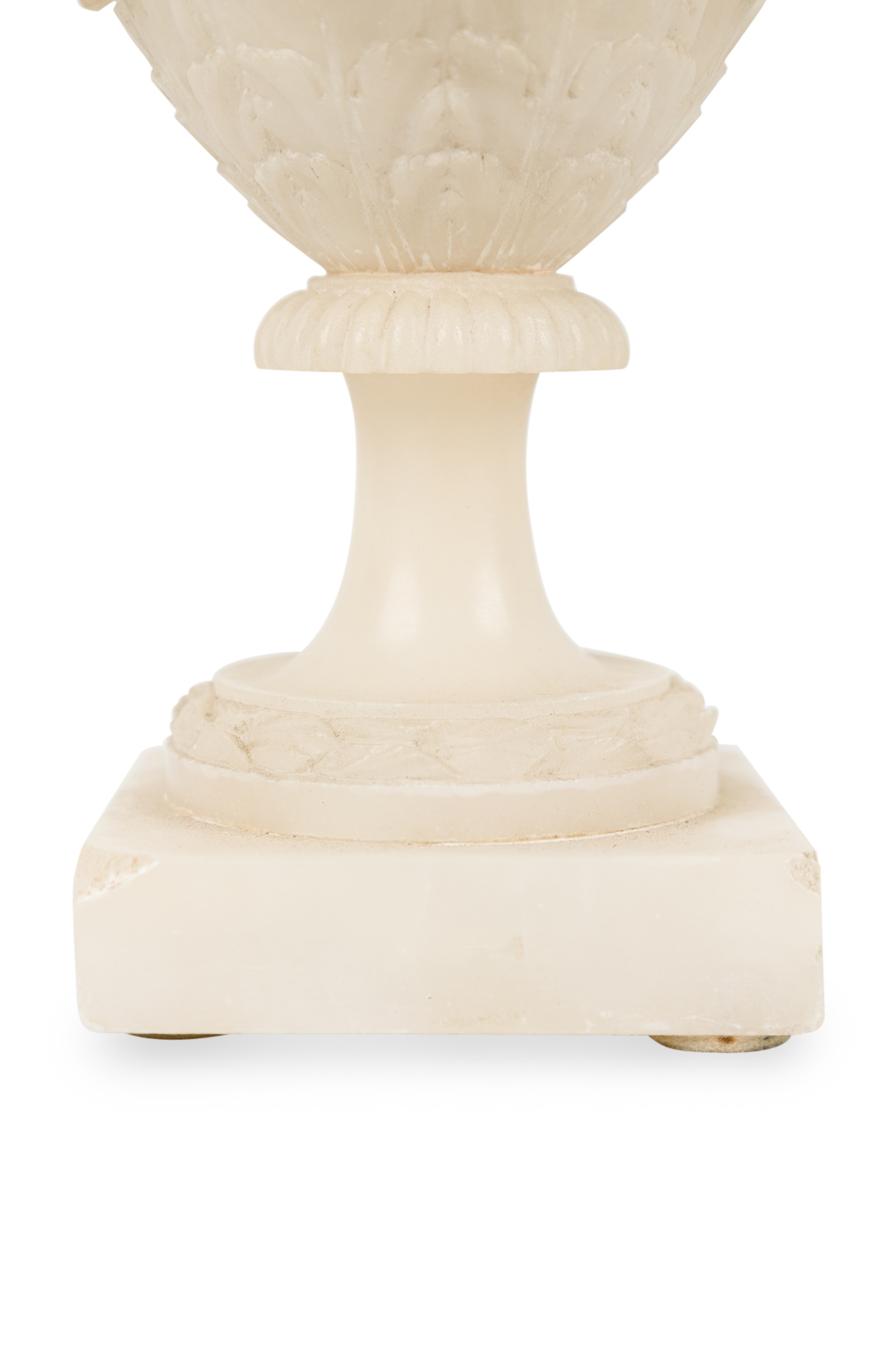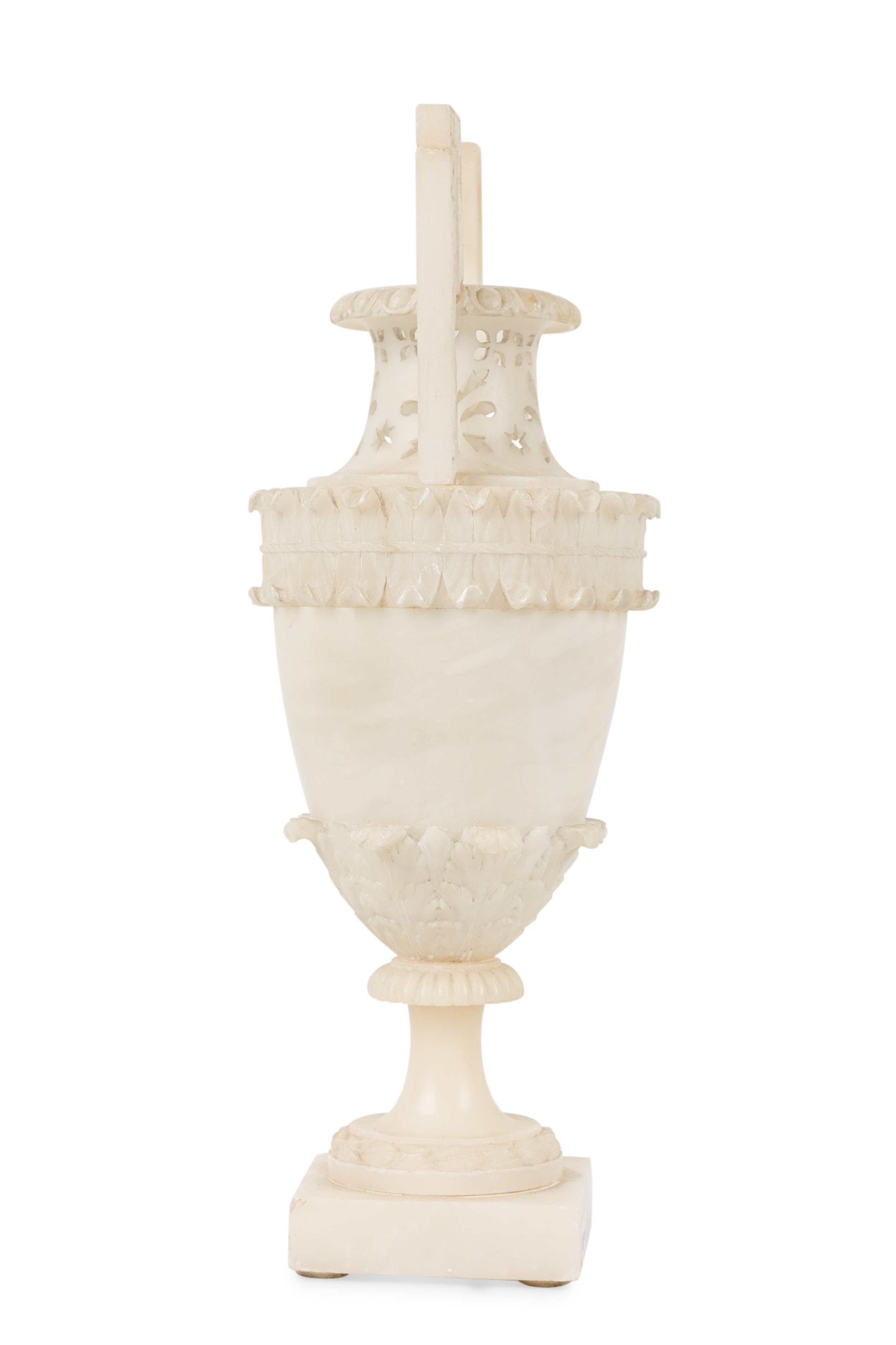 Italian Neo-Classic Fine Alabaster Grand Tour (19th Century) Urn with carved floral details and filigree design top section having 2 handles and resting on a square base (1 handle repaired; small chip on base