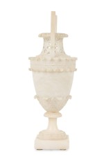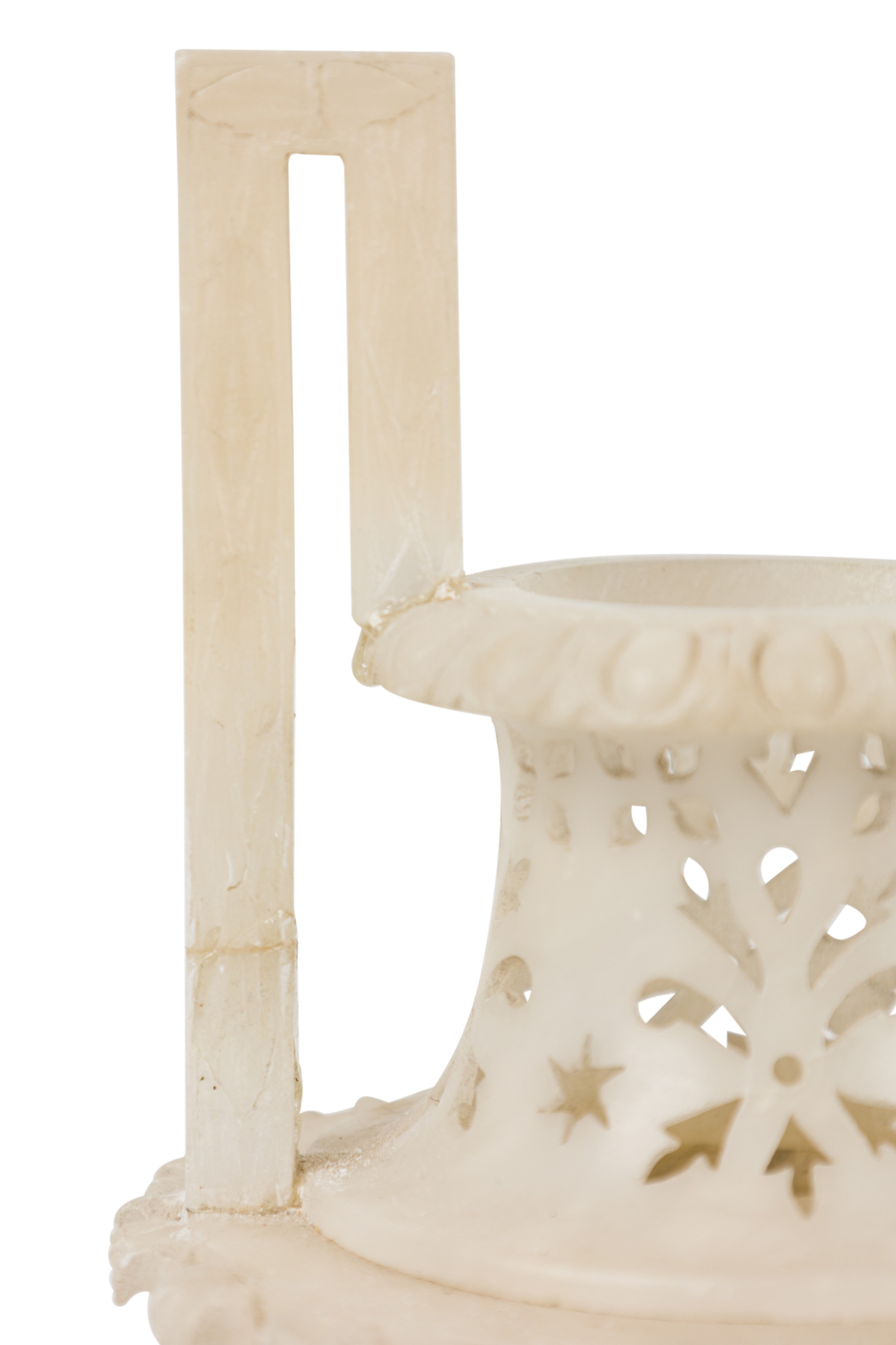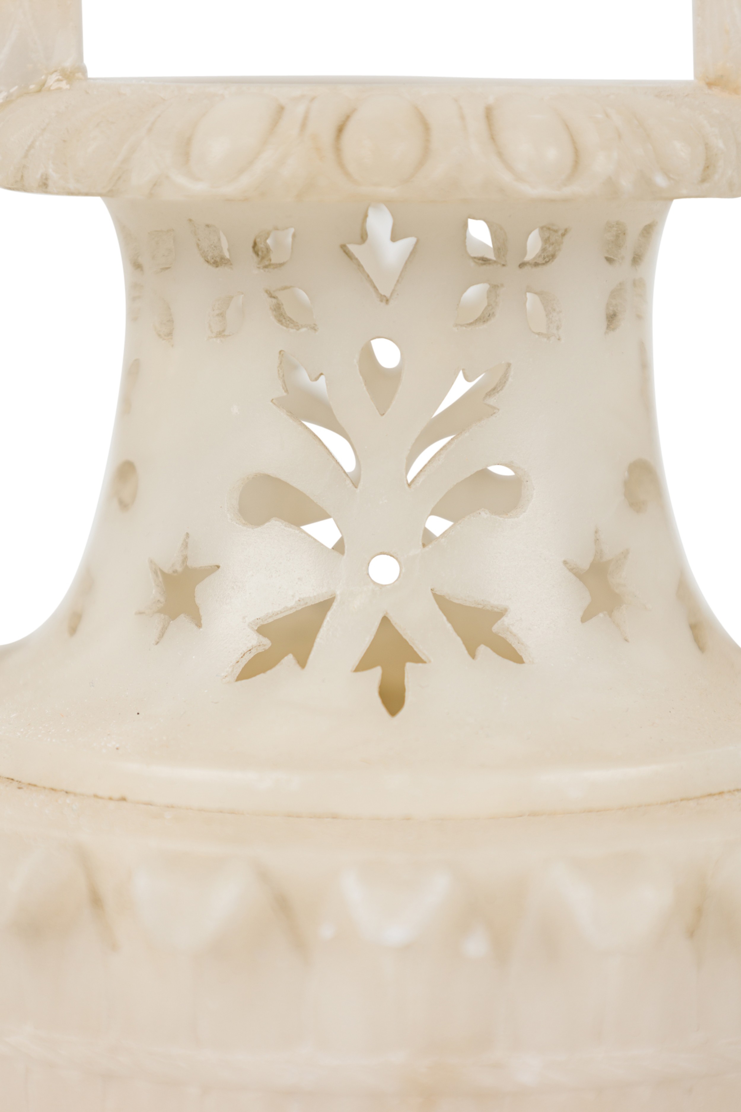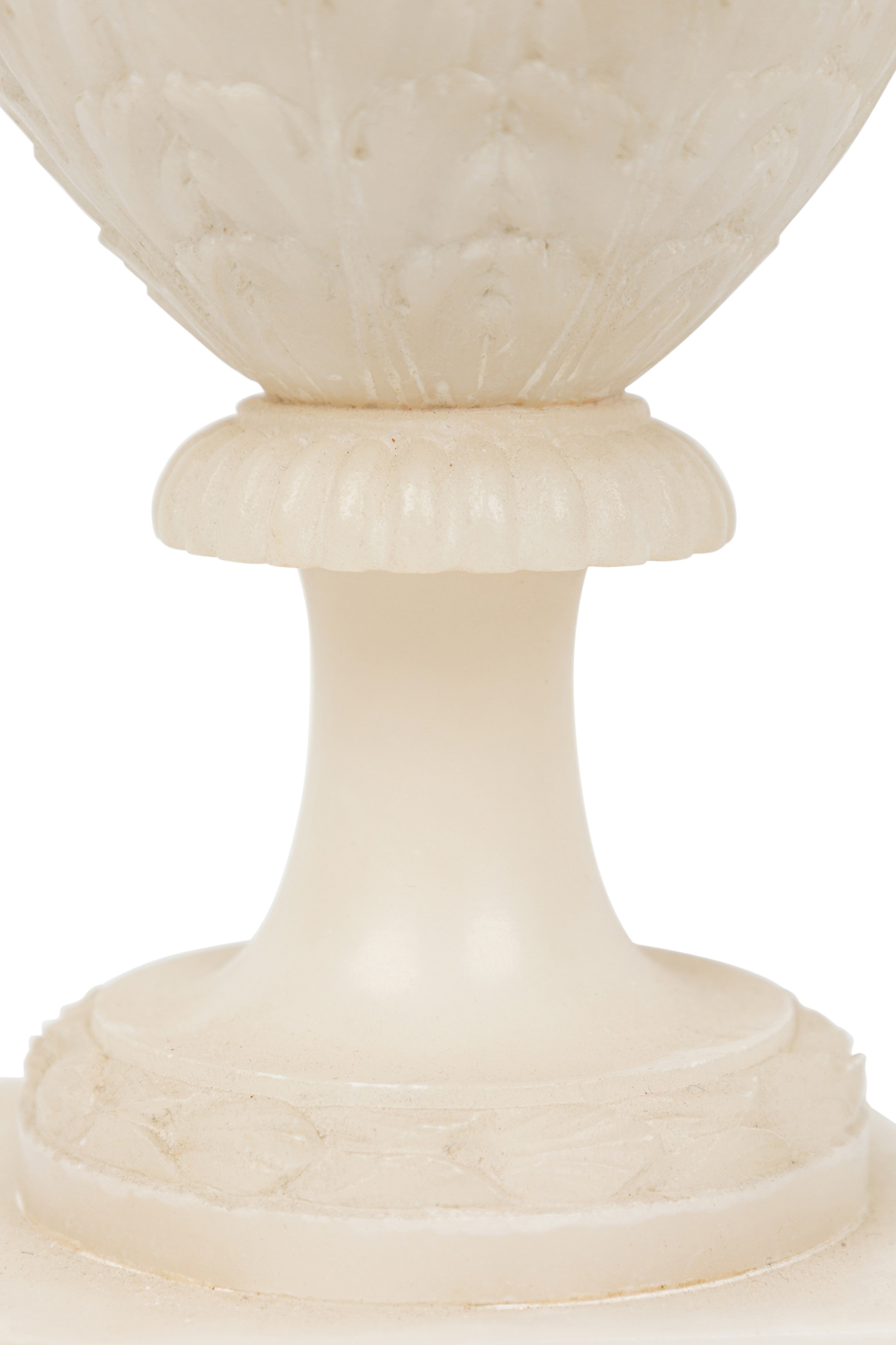 Italian Neo-Classic Fine Alabaster Grand Tour (19th Century) Urn with carved floral details and filigree design top section having 2 handles and resting on a square base (1 handle repaired; small chip on base