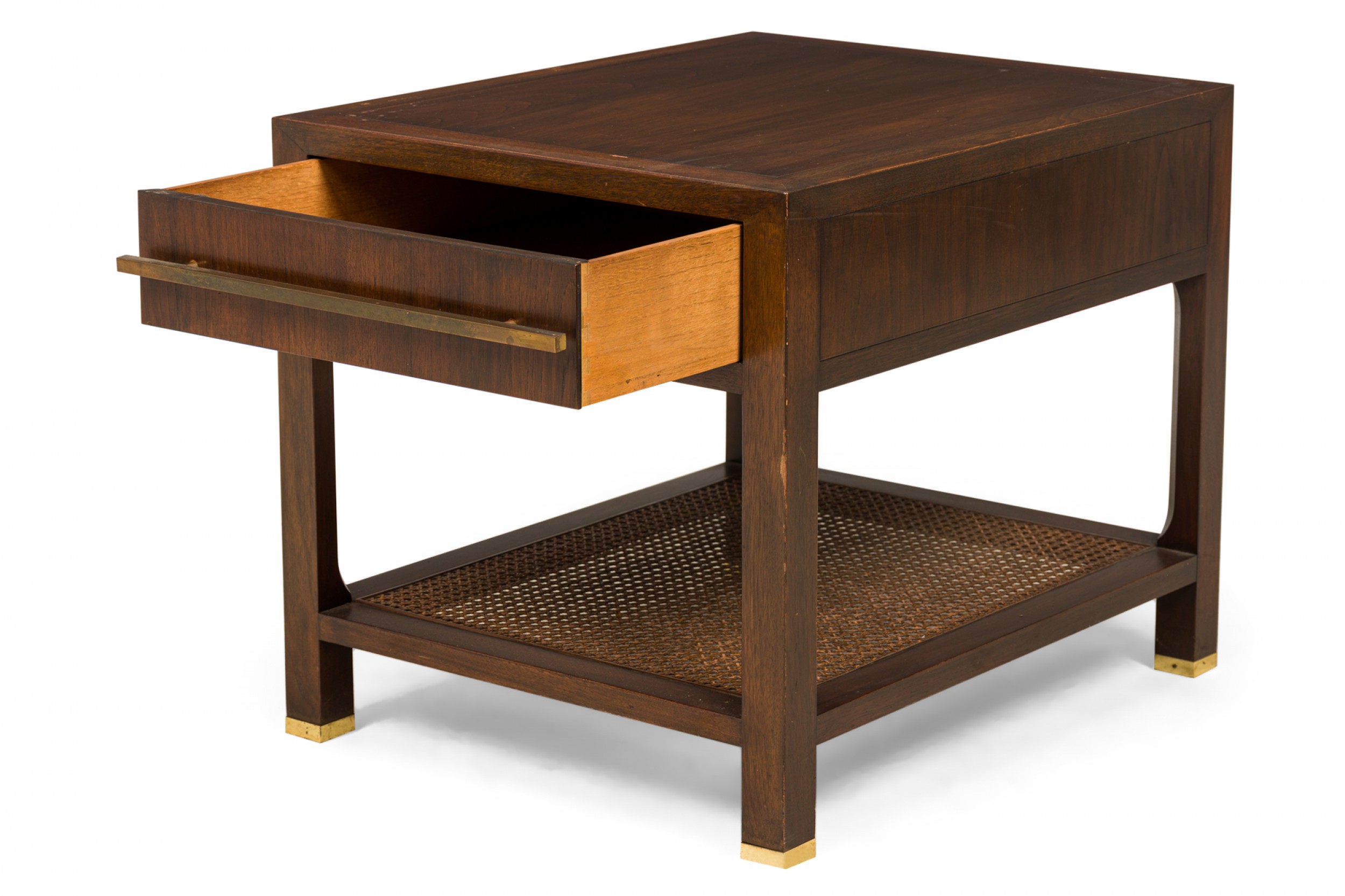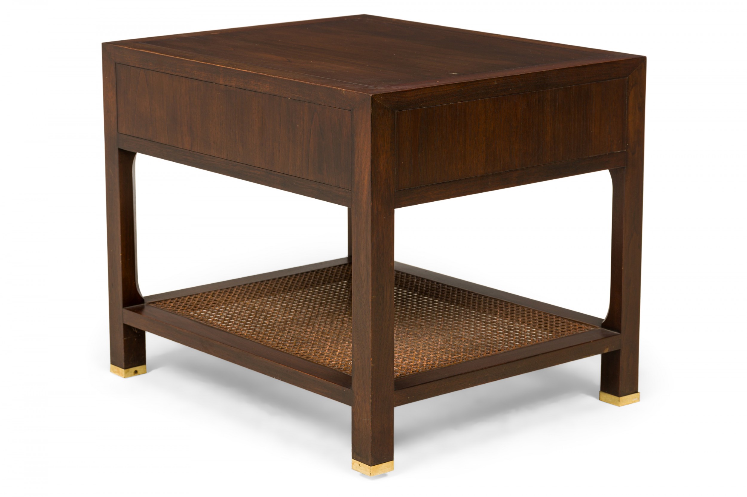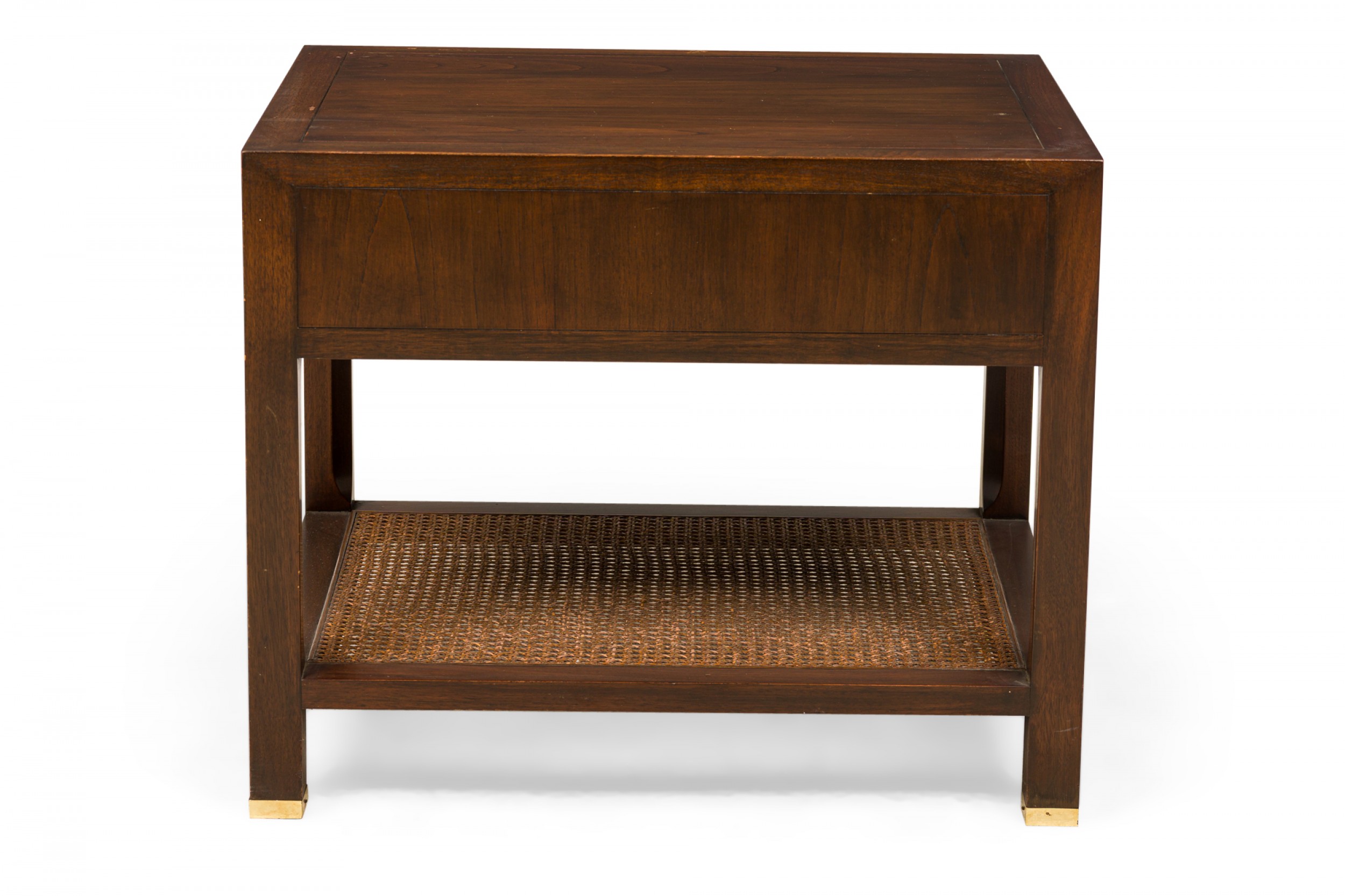Danish Mid-Century rectangular side / end table with a dark stained and lacquered wooden frame, single drawer with antiqued brass bar drawer pull, and lower caned shelf, resting on four square feet with polished brass sabots. (FINN JUHL FOR BAKER FURNITURE COMPANY)