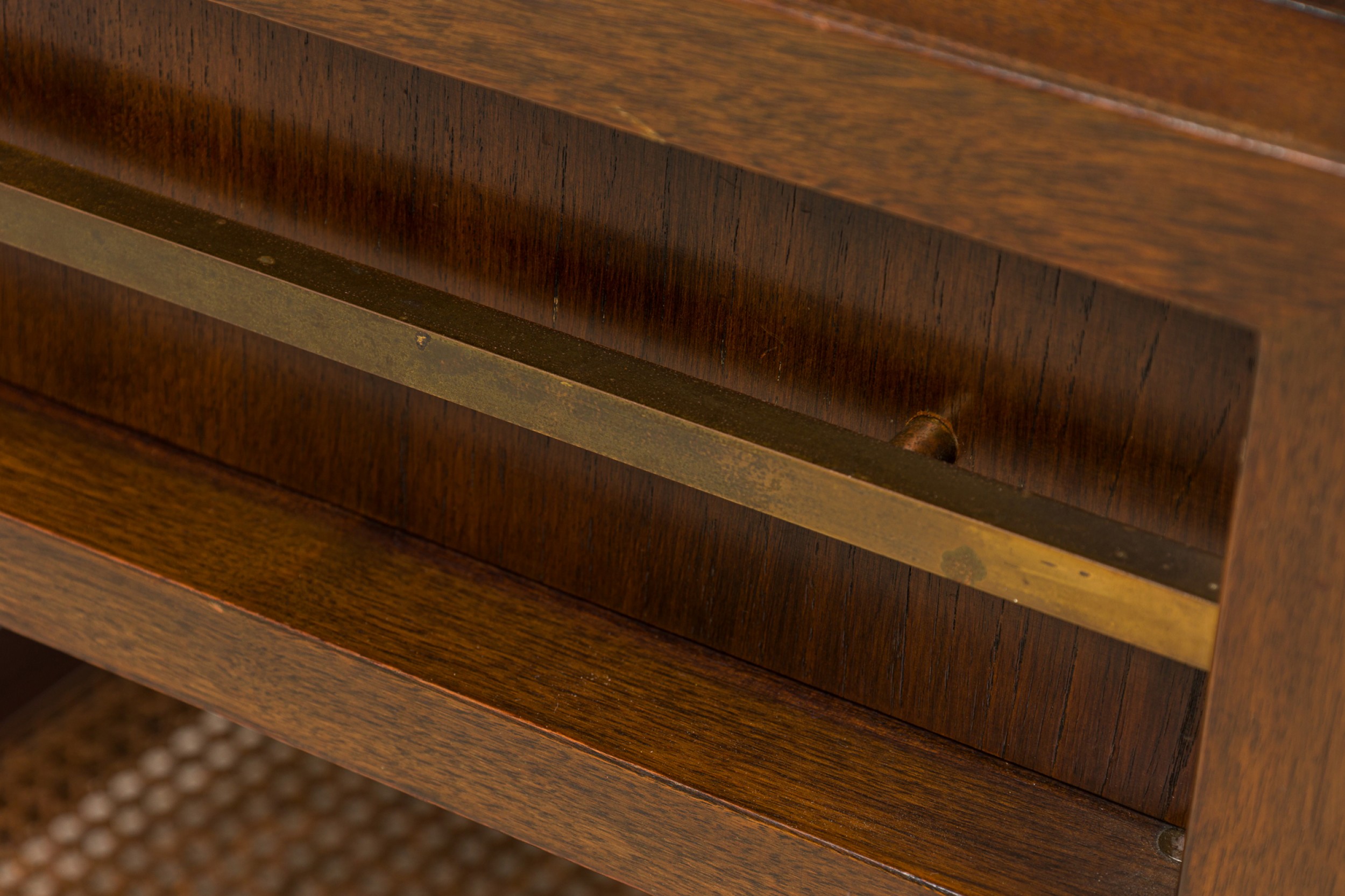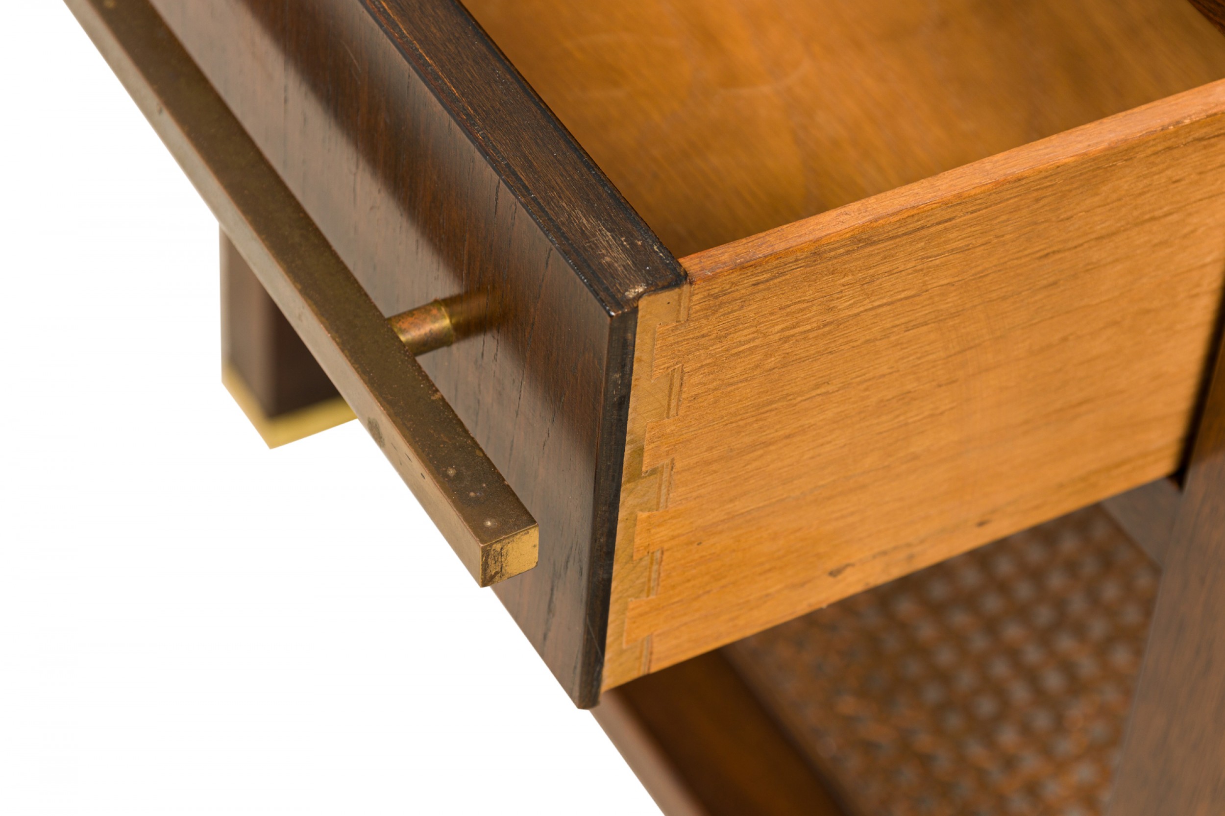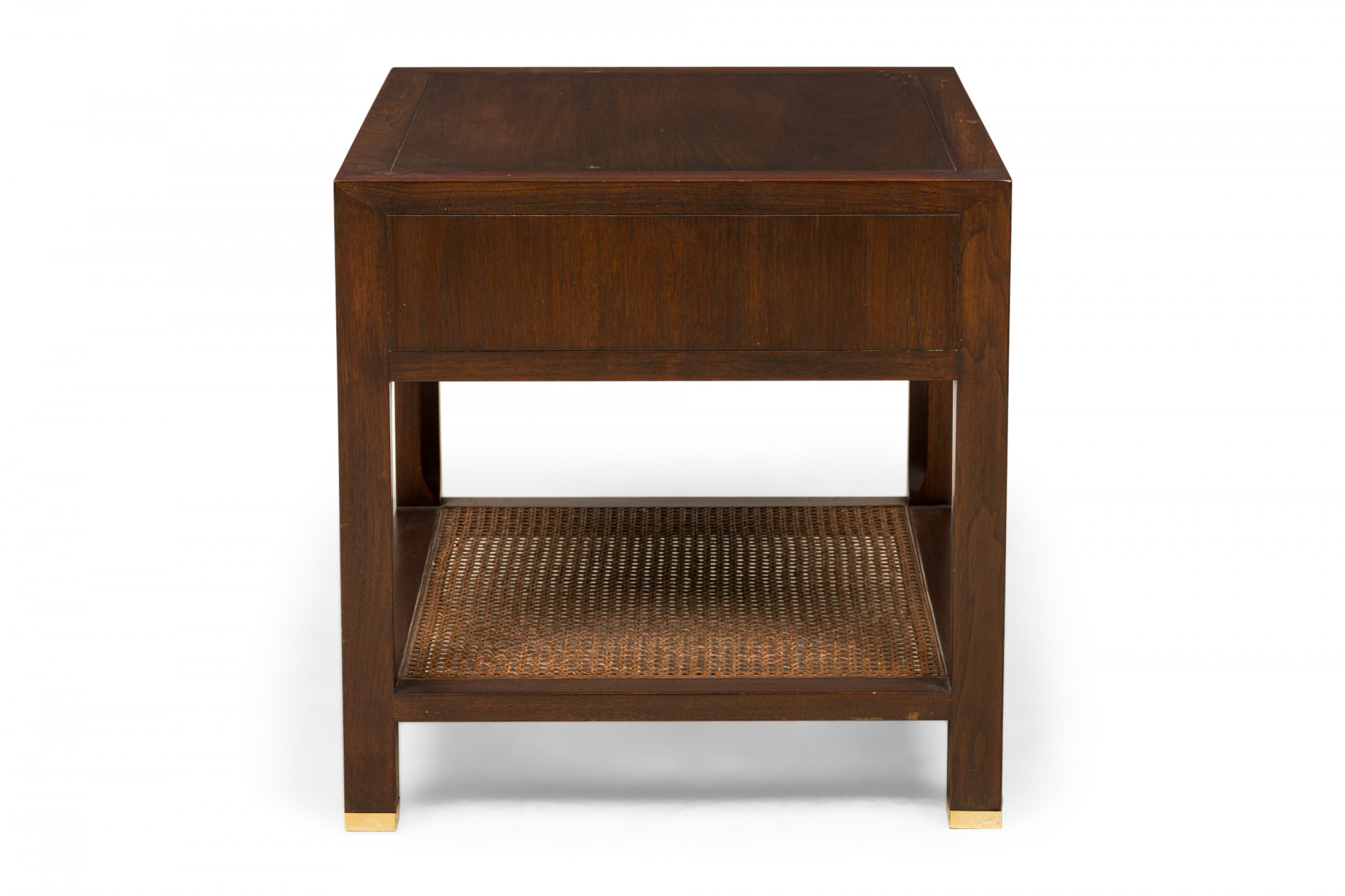 Danish Mid-Century rectangular side / end table with a dark stained and lacquered wooden frame, single drawer with antiqued brass bar drawer pull, and lower caned shelf, resting on four square feet with polished brass sabots. (FINN JUHL FOR BAKER FURNITURE COMPANY)