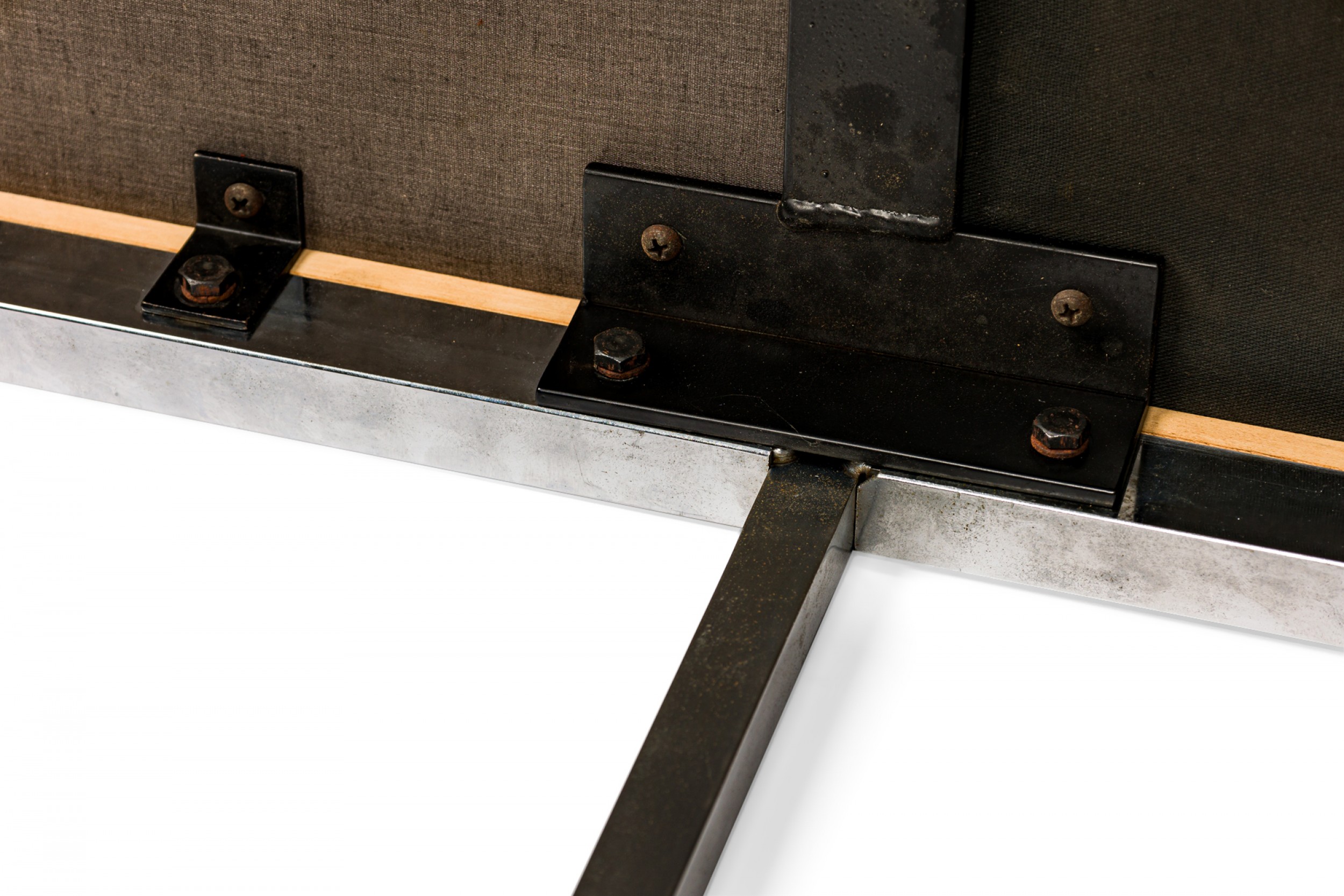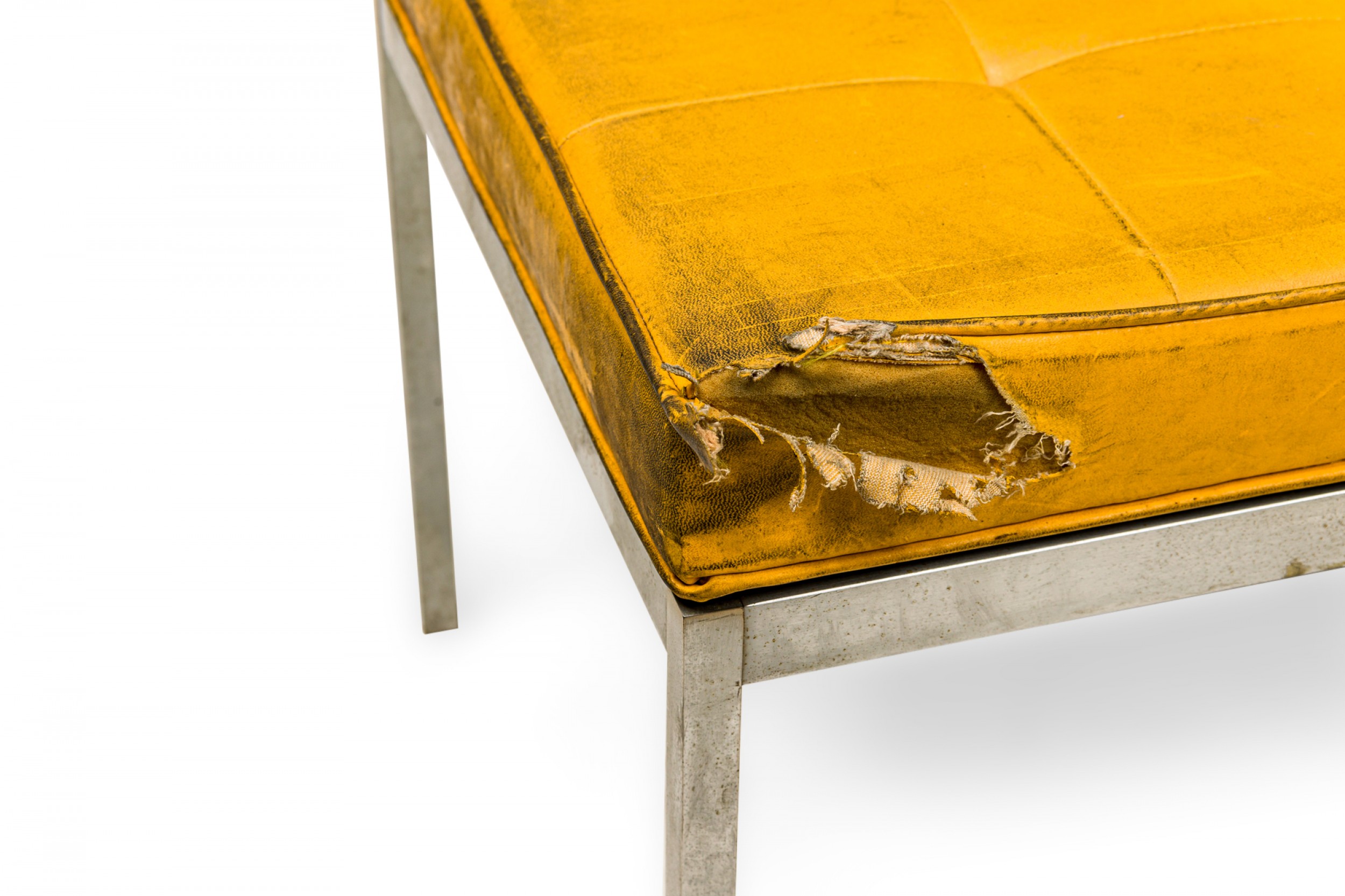 Style: Mid-Century Materials & Techniques: Chrome, metal, tufted, upholstered, vinyl Category: Seating Condition: Damage and stains to upholstery, tear in one corner. Fair; Minor structural damages