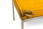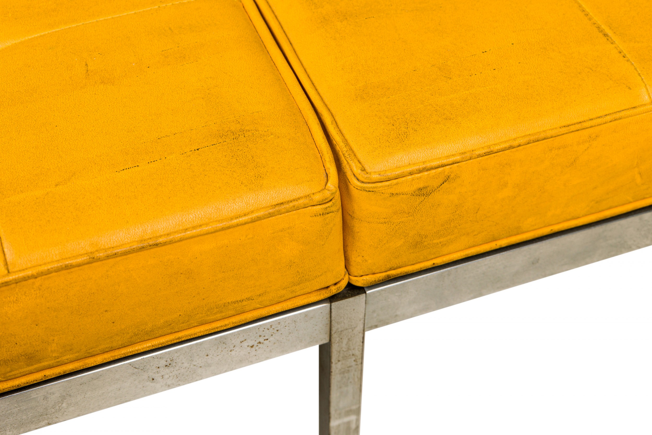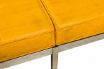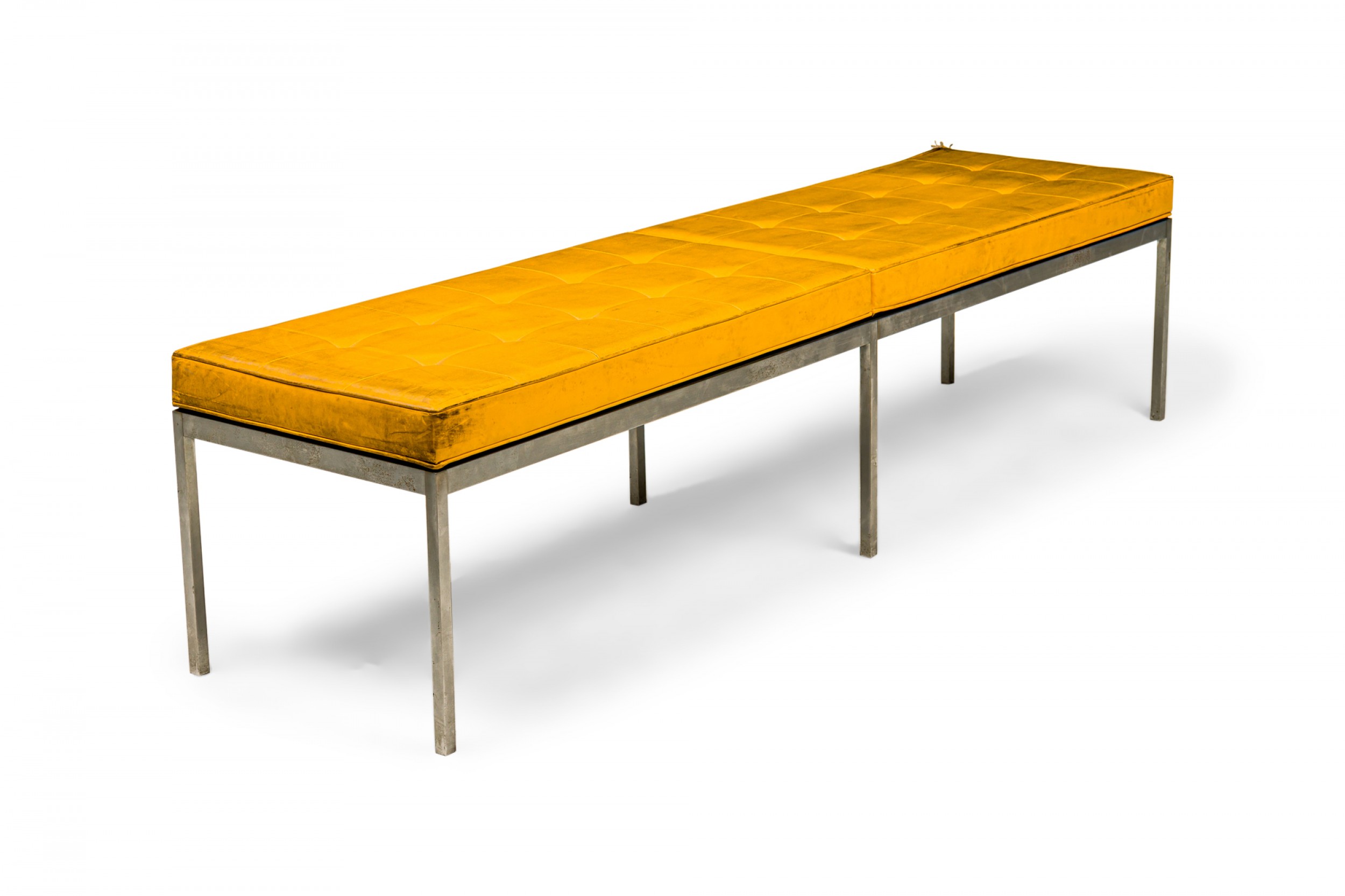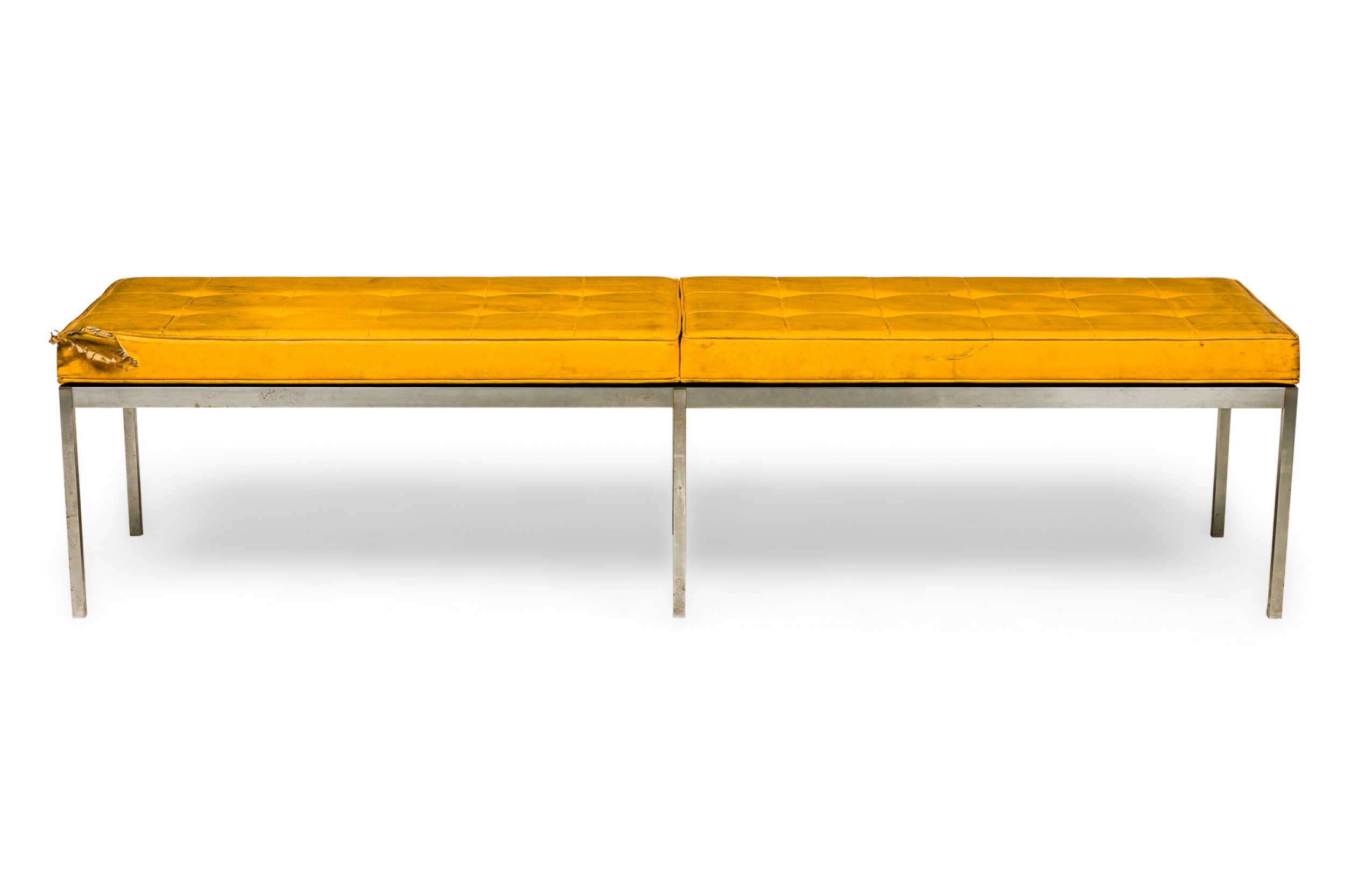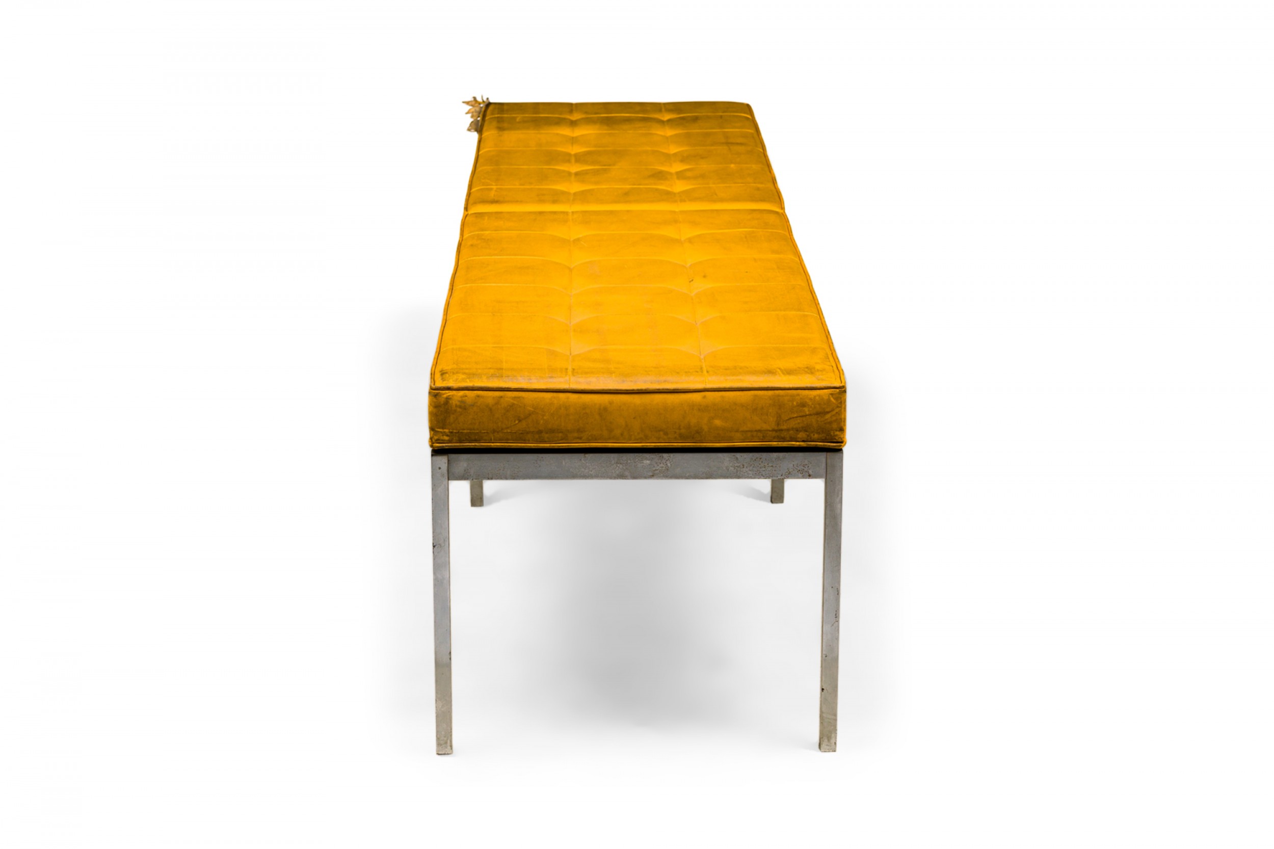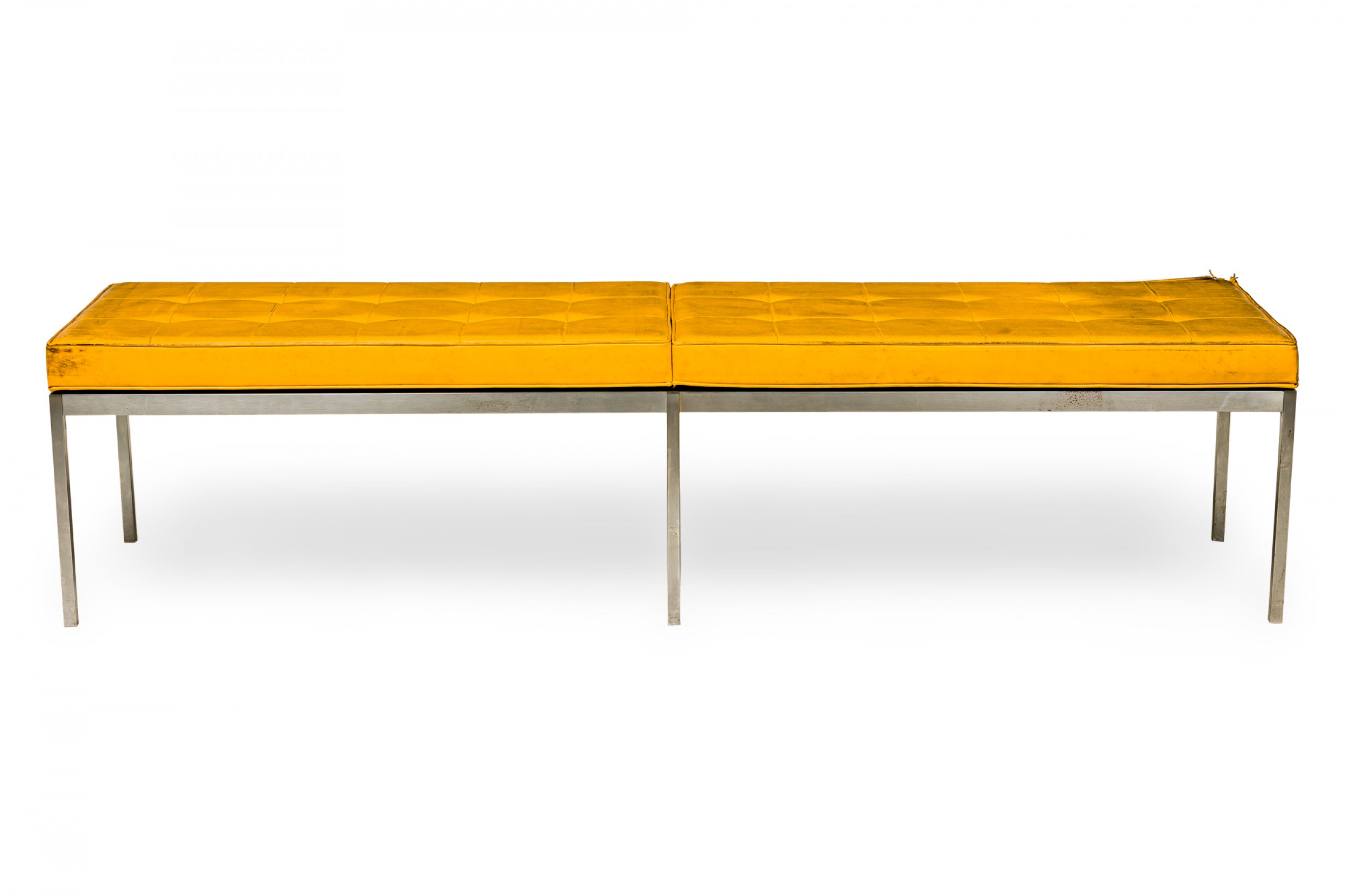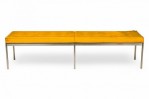 American Mid-Century museum bench with a button tufted yellow vinyl upholstered seat resting on a square chrome tube frame with 6 legs. (FLORENCE KNOLL FOR KNOLL INTERNATIONAL)