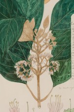 American Victorian (19th Century) watercolor, ink, and pencil botanical drawing depicting a Callicarpa Lanata plant in green tones against a beige background, matted in a beveled parcel gilt painted wood frame. (Part of large set: 063653A, Companion pieces available individually: 063653-063701).