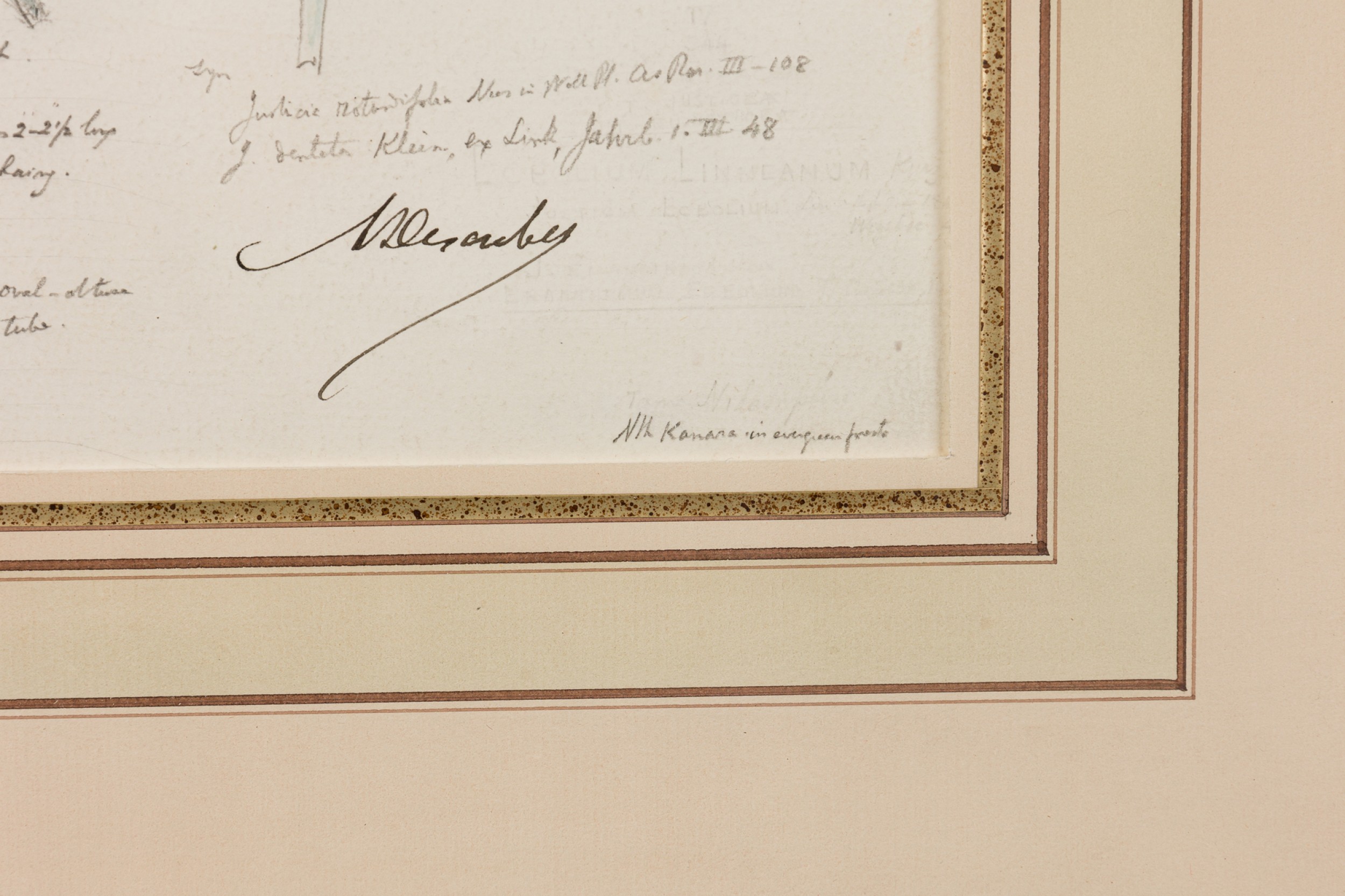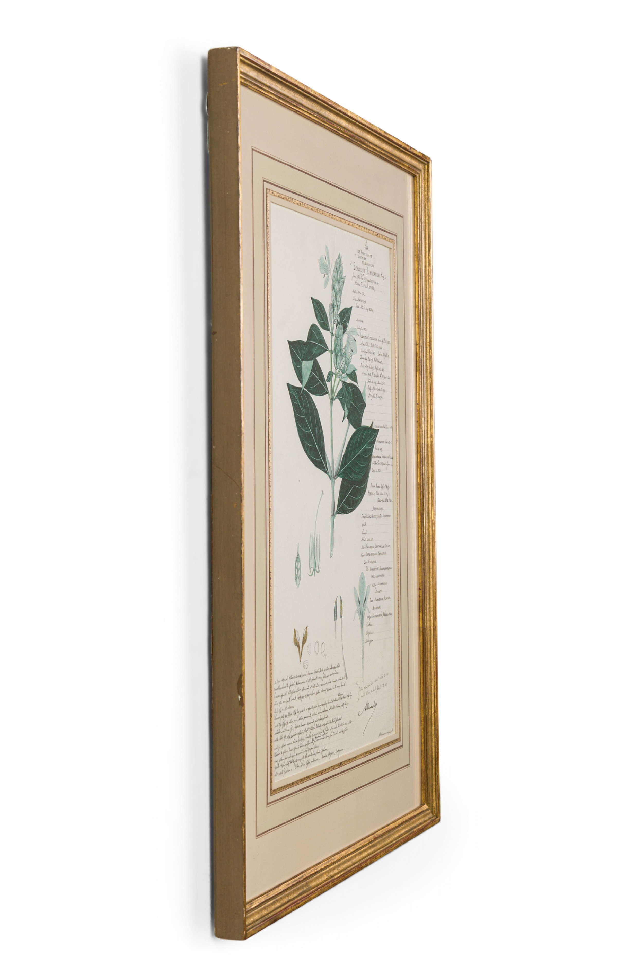 American Victorian (19th Century) watercolor, ink, and pencil botanical drawing depicting a Ecbolium Linneanum plant in green tones against a beige background, matted in a beveled parcel gilt painted wood frame. (Part of large set: 063653A, Companion pieces available individually: 063654-063701)