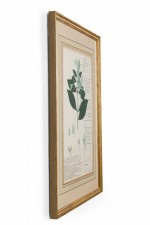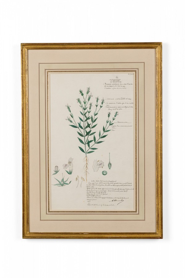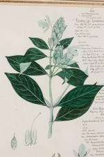 American Victorian (19th Century) watercolor, ink, and pencil botanical drawing depicting a Ecbolium Linneanum plant in green tones against a beige background, matted in a beveled parcel gilt painted wood frame. (Part of large set: 063653A, Companion pieces available individually: 063654-063701).