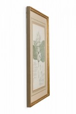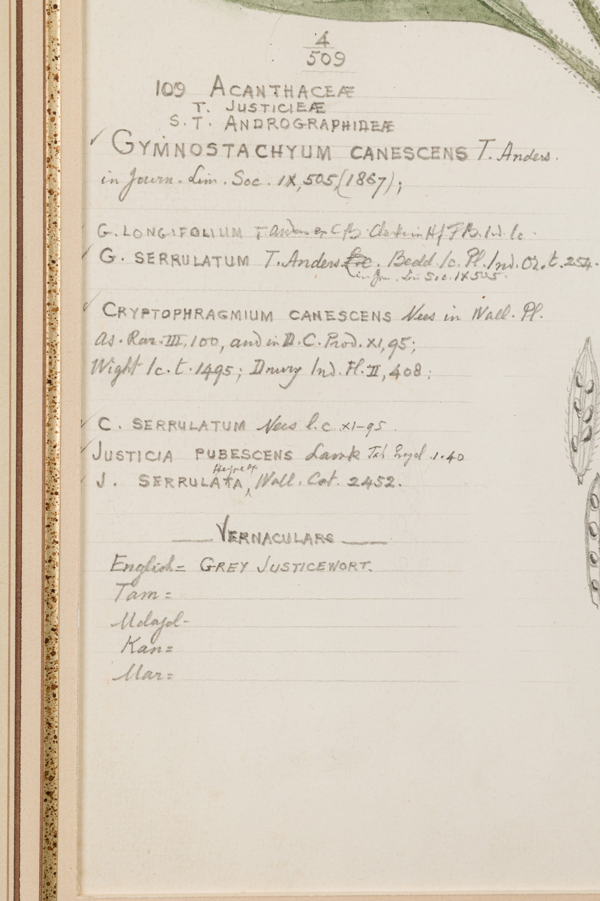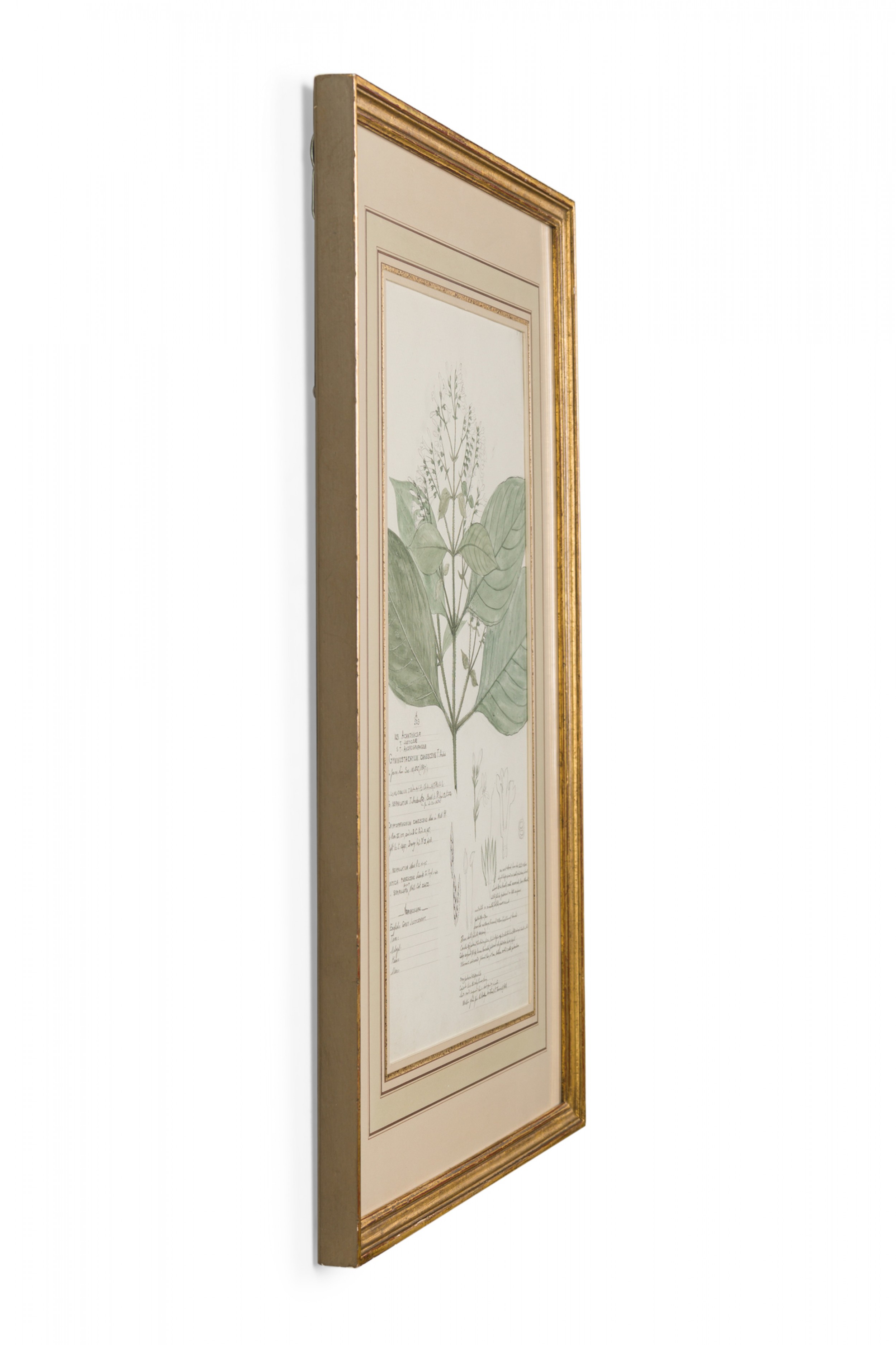 American Victorian (19th Century) watercolor, ink, and pencil botanical drawing depicting a Gymnostachyum Canescens plant in green tones against a beige background, matted in a beveled parcel gilt painted wood frame. (Part of large set: 063653A, Companion pieces available individually: 063653-063701).