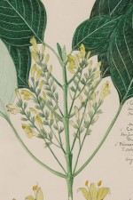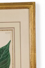 American Victorian (19th Century) watercolor, ink, and pencil botanical drawing depicting a Gymnostachyum Latifolium plant in green tones against a beige background, matted in a beveled parcel gilt painted wood frame. (Part of large set: 063653A, Companion pieces available individually: 063653-063701)