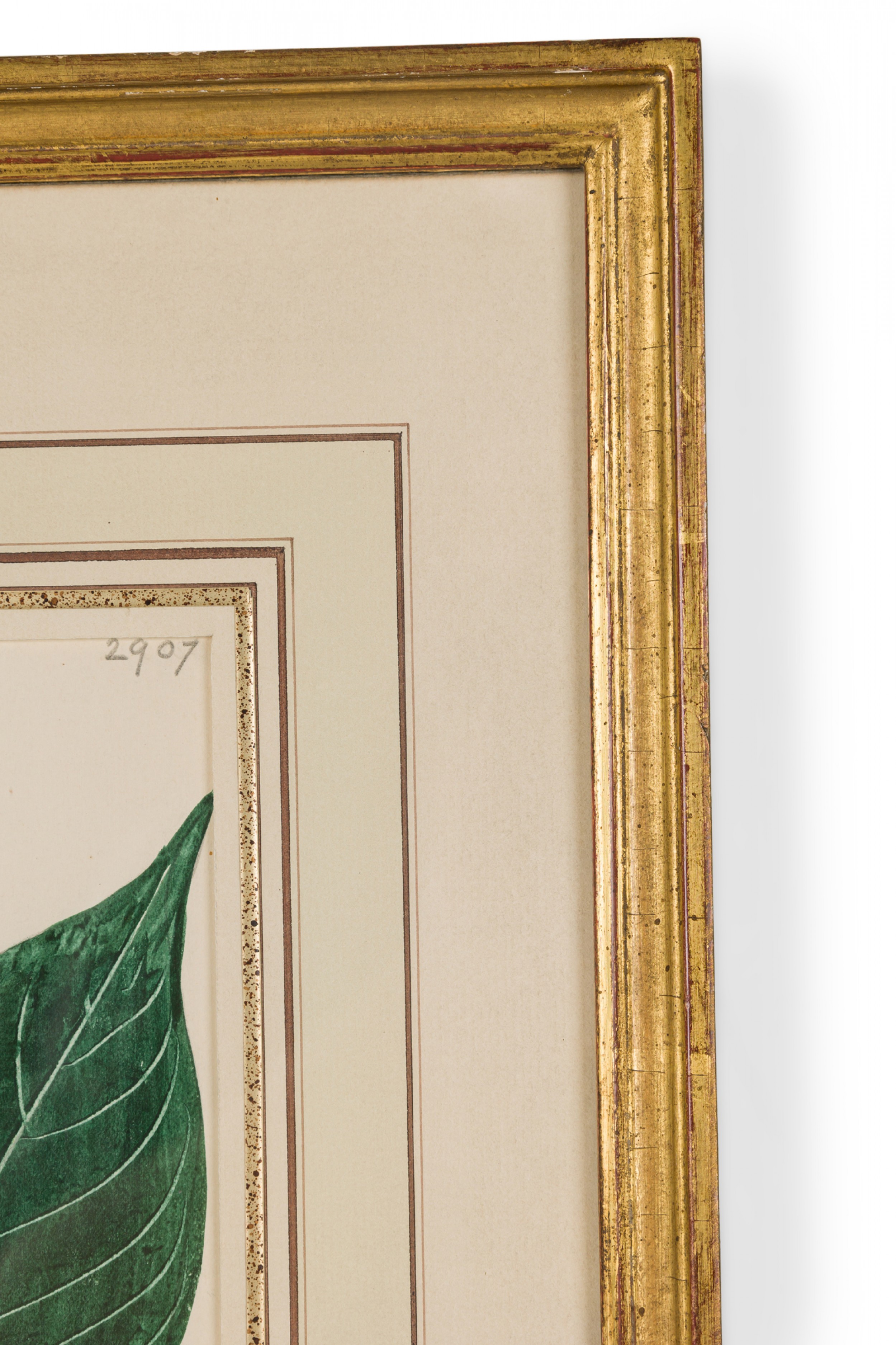 American Victorian (19th Century) watercolor, ink, and pencil botanical drawing depicting a Gymnostachyum Latifolium plant in green tones against a beige background, matted in a beveled parcel gilt painted wood frame. (Part of large set: 063653A, Companion pieces available individually: 063653-063701).