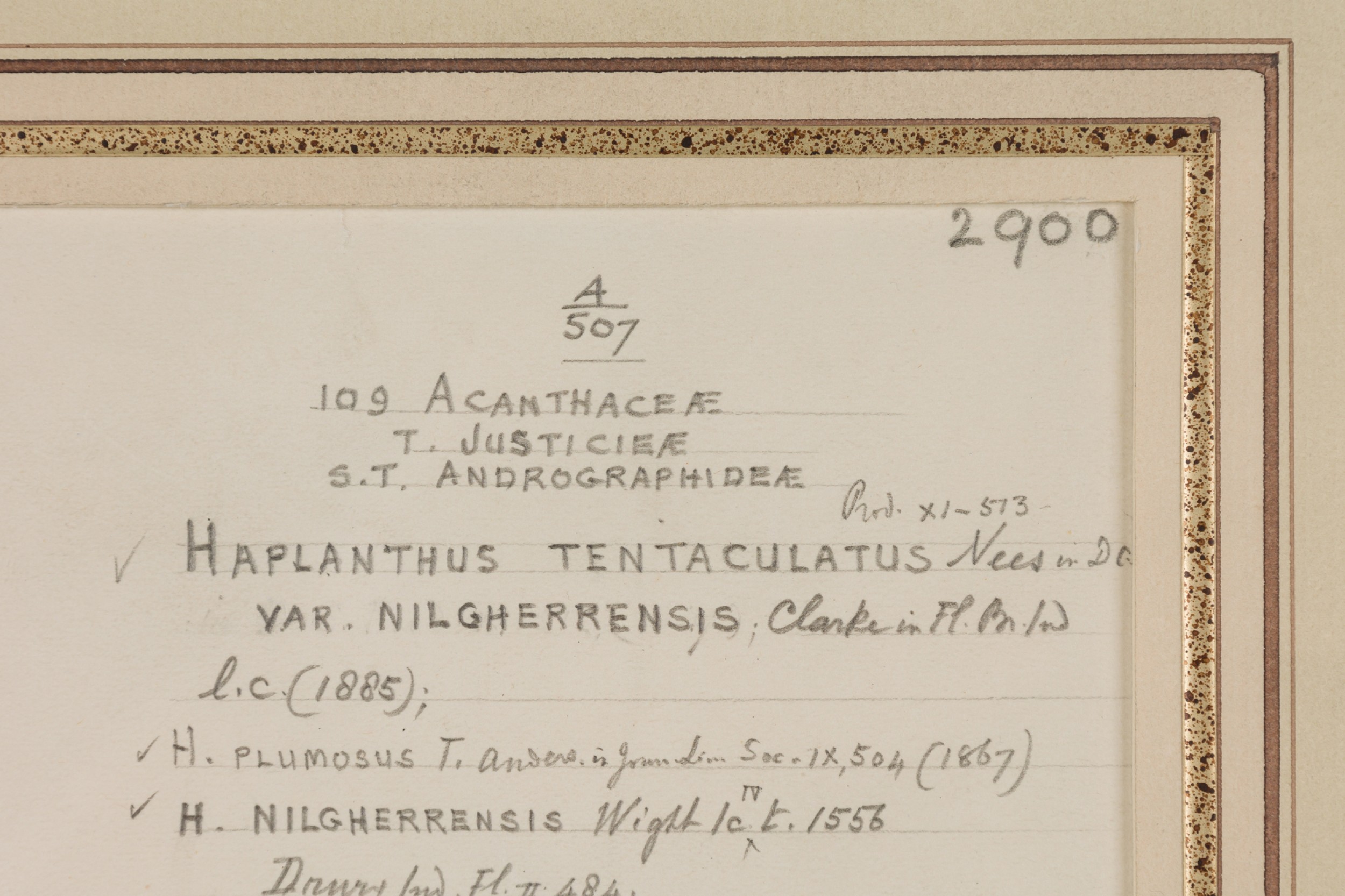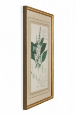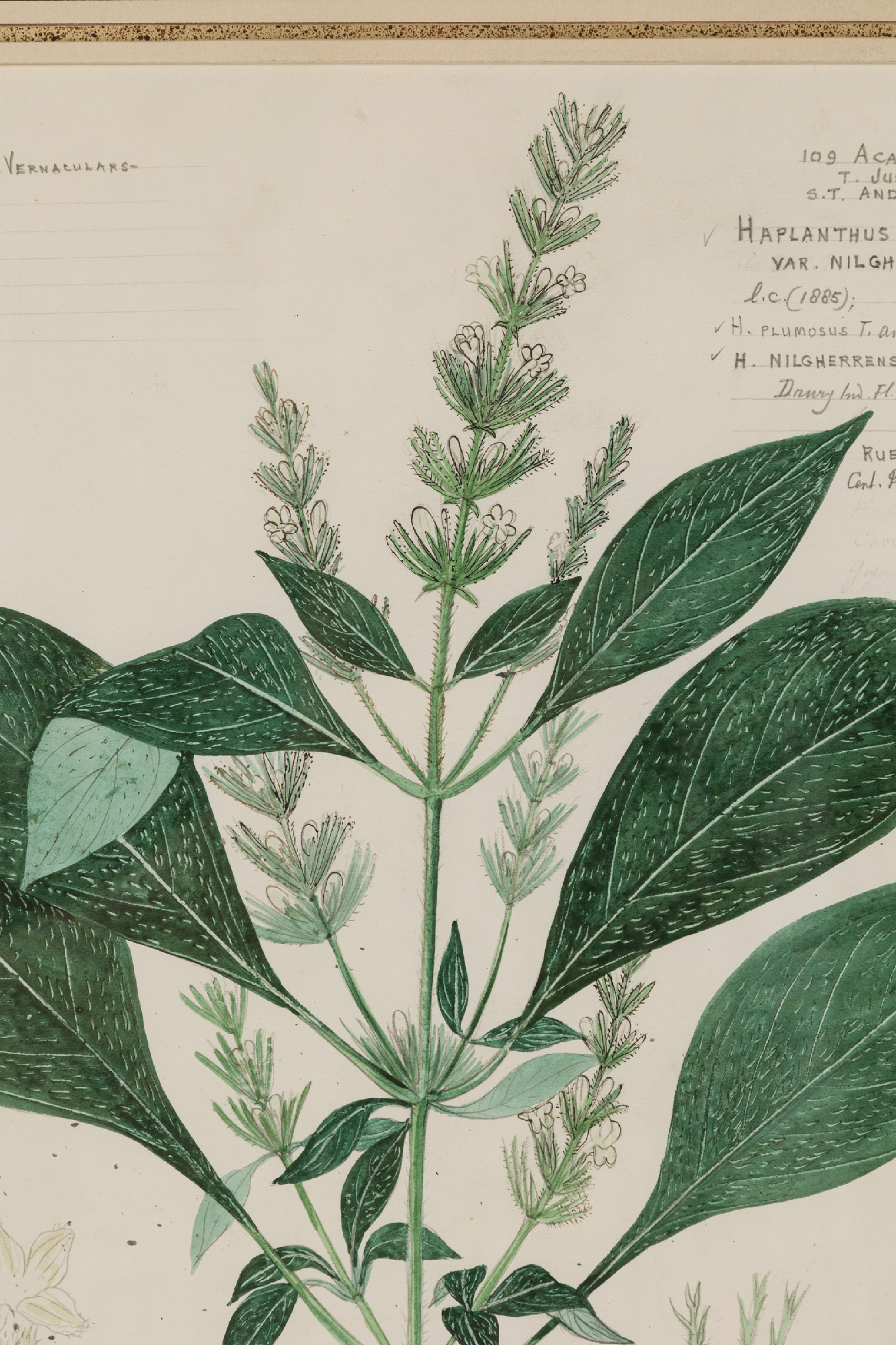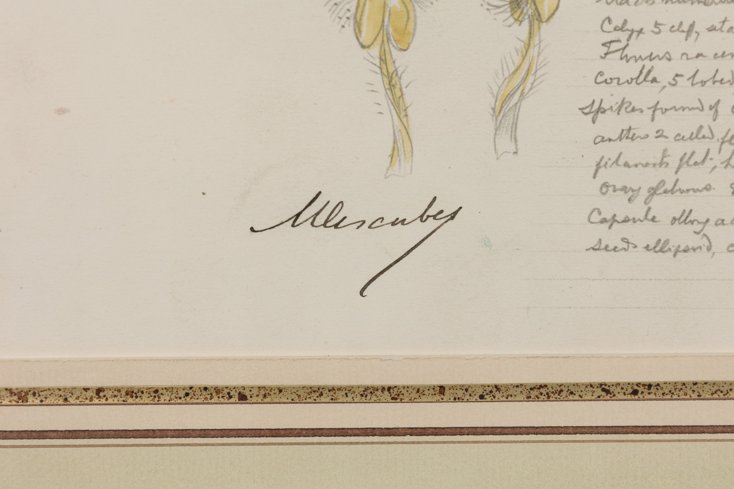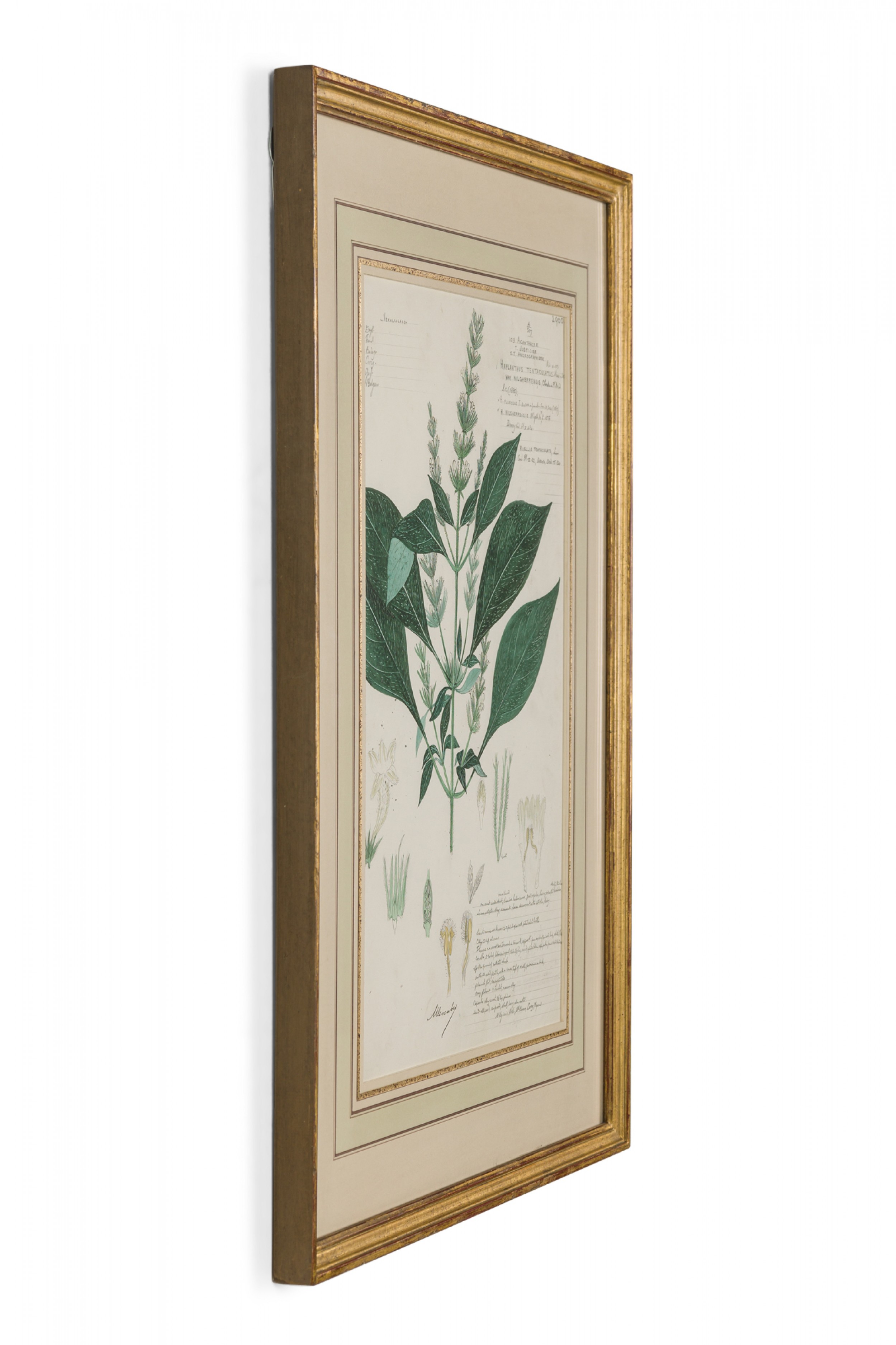 American Victorian (19th Century) watercolor, ink, and pencil botanical drawing depicting a Haplanthus Tentaculatus plant in green tones against a beige background, matted in a beveled parcel gilt painted wood frame. (Part of large set: 063653A, Companion pieces available individually: 063653-063701)