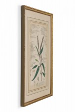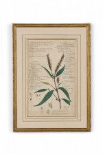 American Victorian (19th Century) watercolor, ink, and pencil botanical drawing depicting a Justicia Gendarussa plant in green tones against a beige background, matted in a beveled parcel gilt painted wood frame. (Part of large set: 063653A, Companion pieces available individually: 063653-063701).