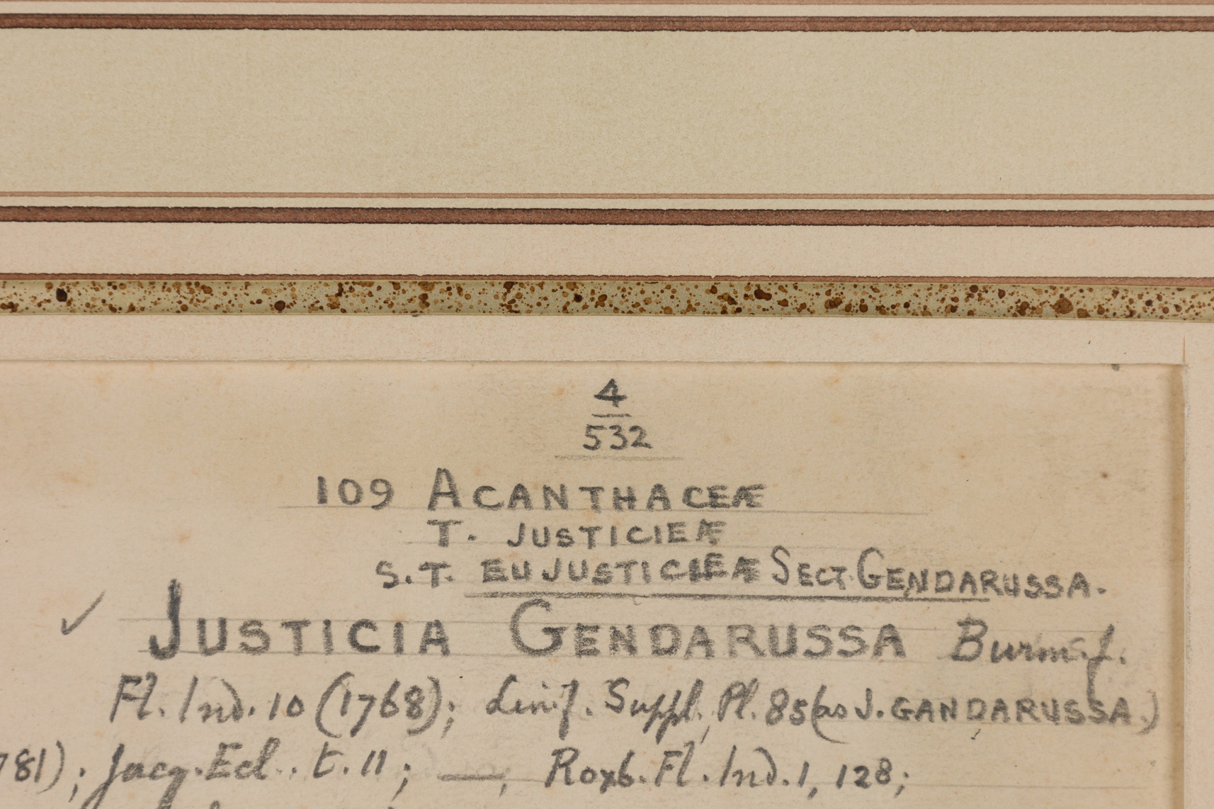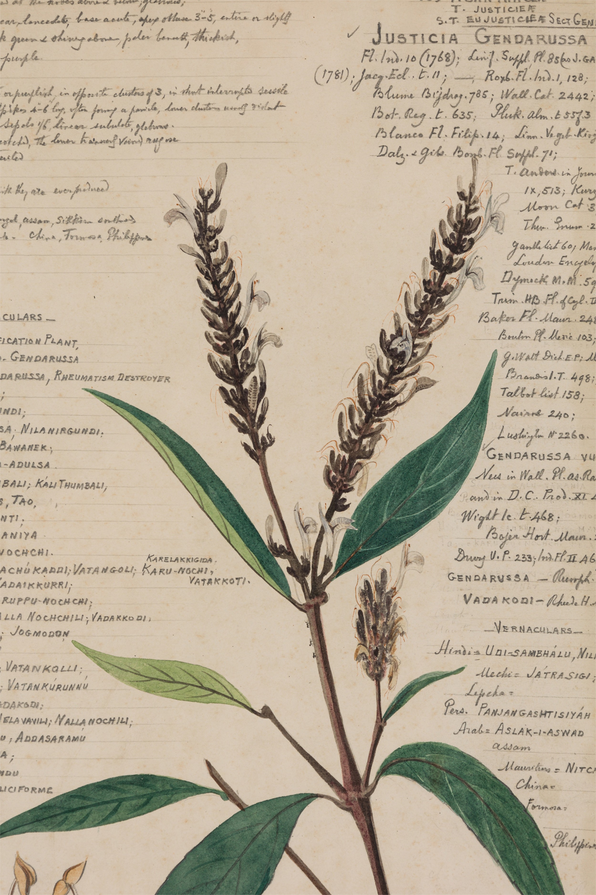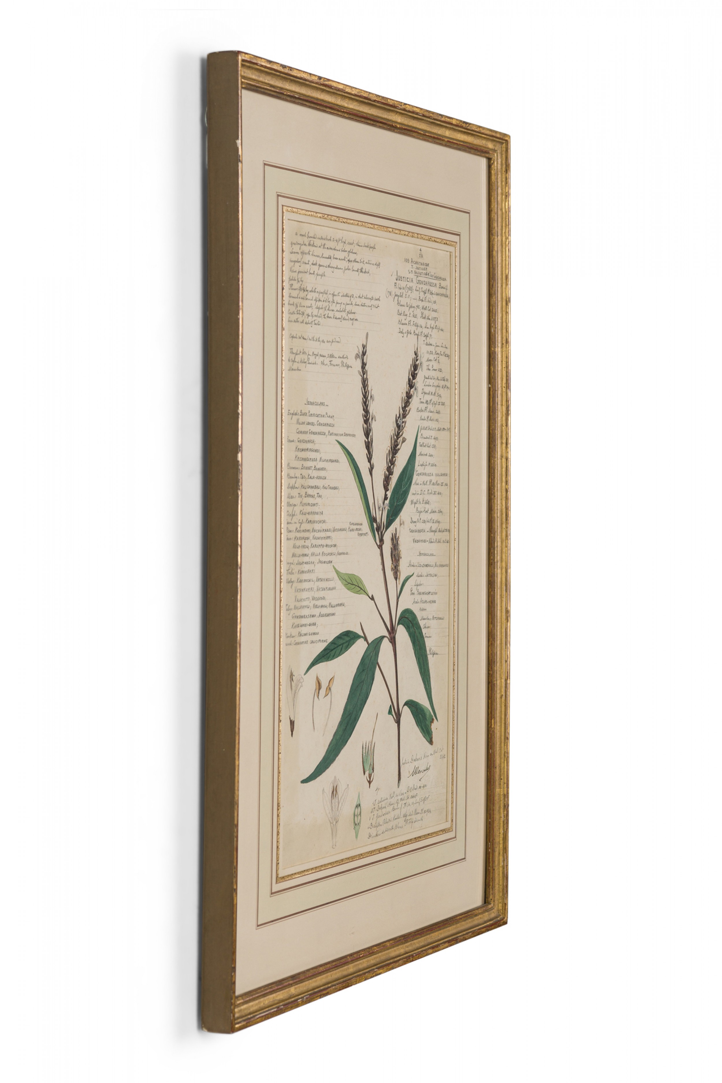American Victorian (19th Century) watercolor, ink, and pencil botanical drawing depicting a Justicia Gendarussa plant in green tones against a beige background, matted in a beveled parcel gilt painted wood frame. (Part of large set: 063653A, Companion pieces available individually: 063653-063701)