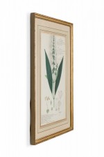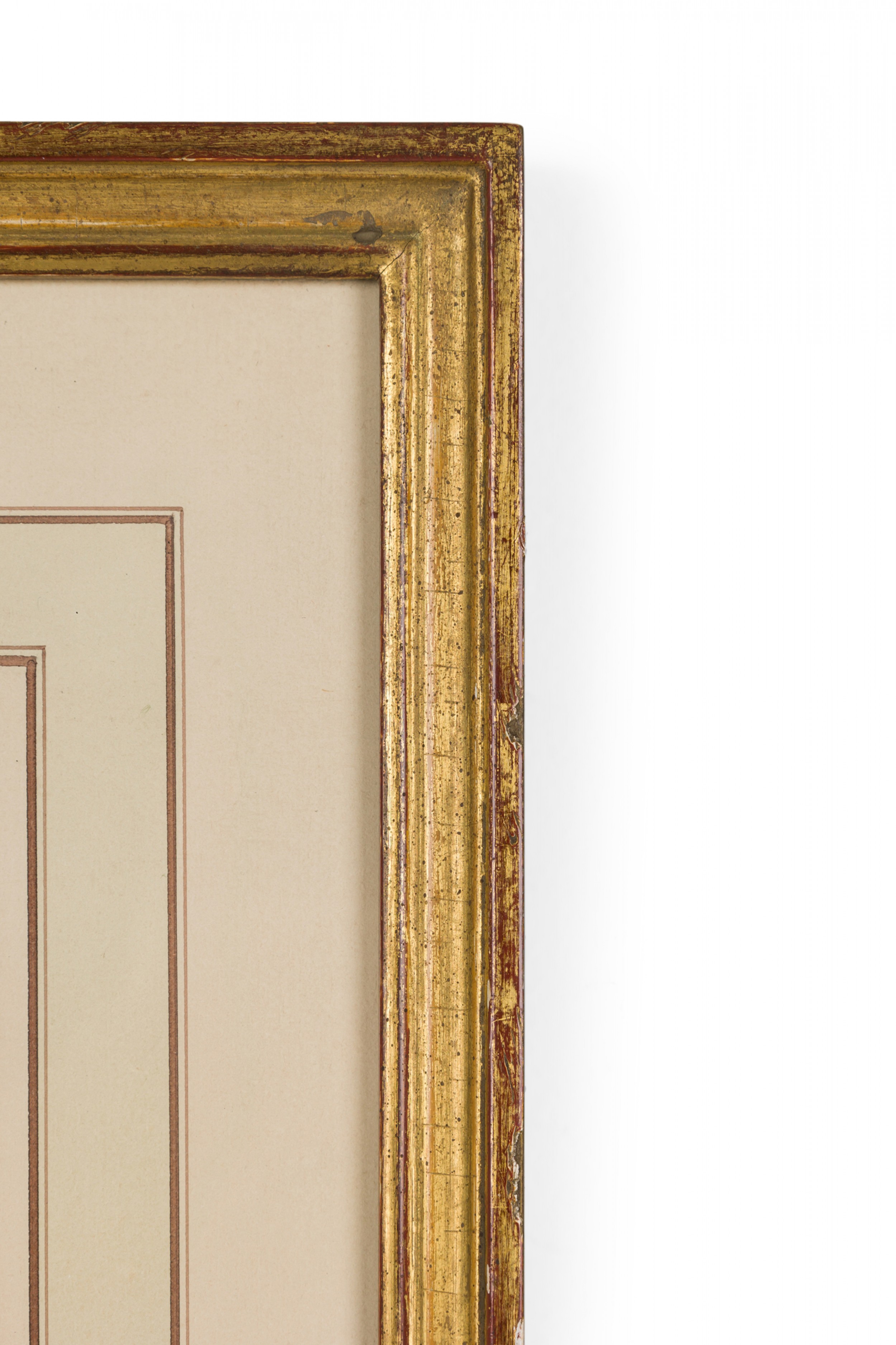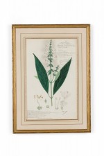 American Victorian (19th Century) watercolor, ink, and pencil botanical drawing depicting a Justicia Montana plant in green tones against a beige background, matted in a beveled parcel gilt painted wood frame. (Part of large set: 063653A, Companion pieces available individually: 063653-063701).
