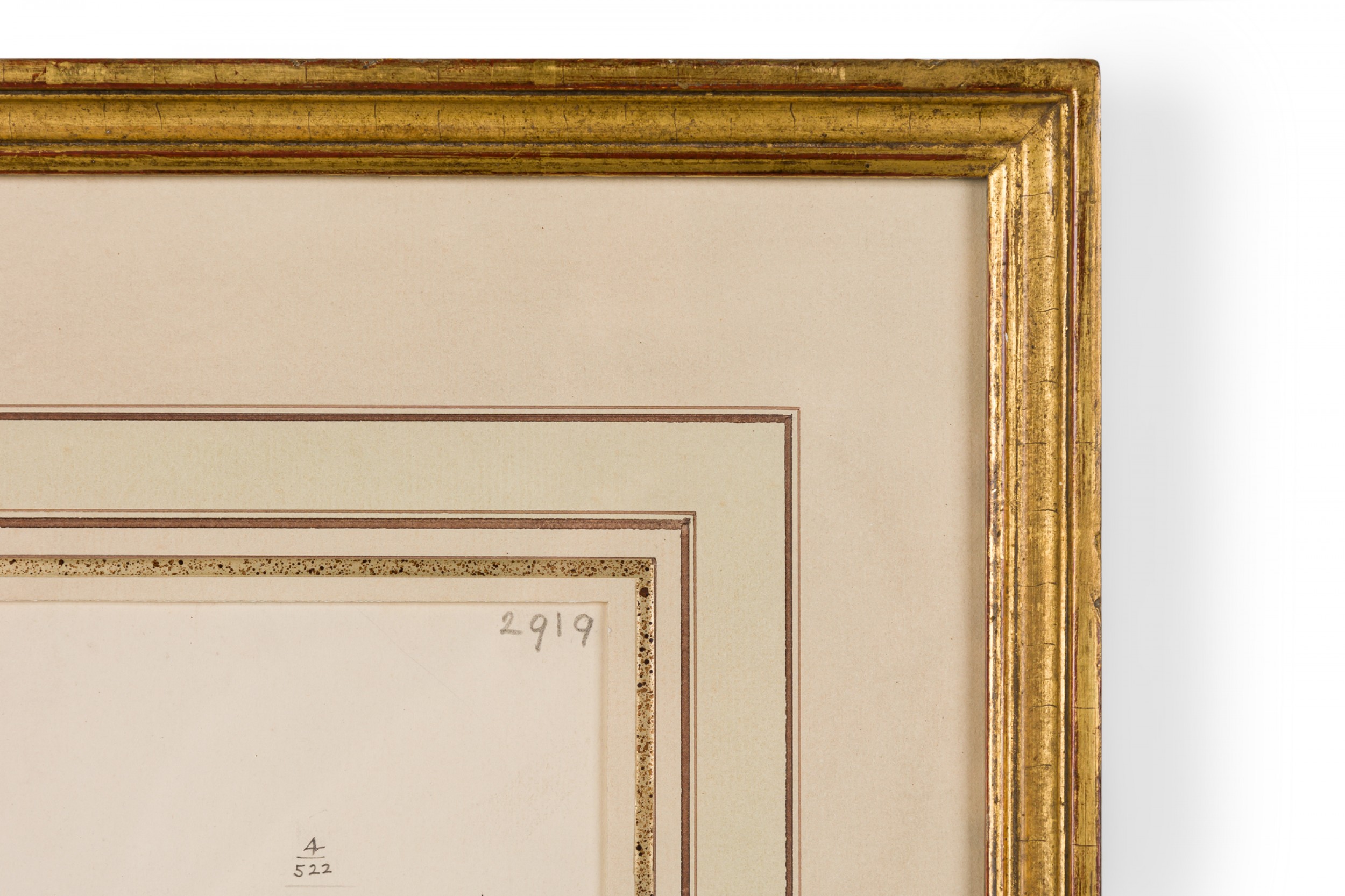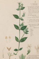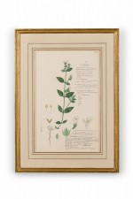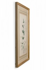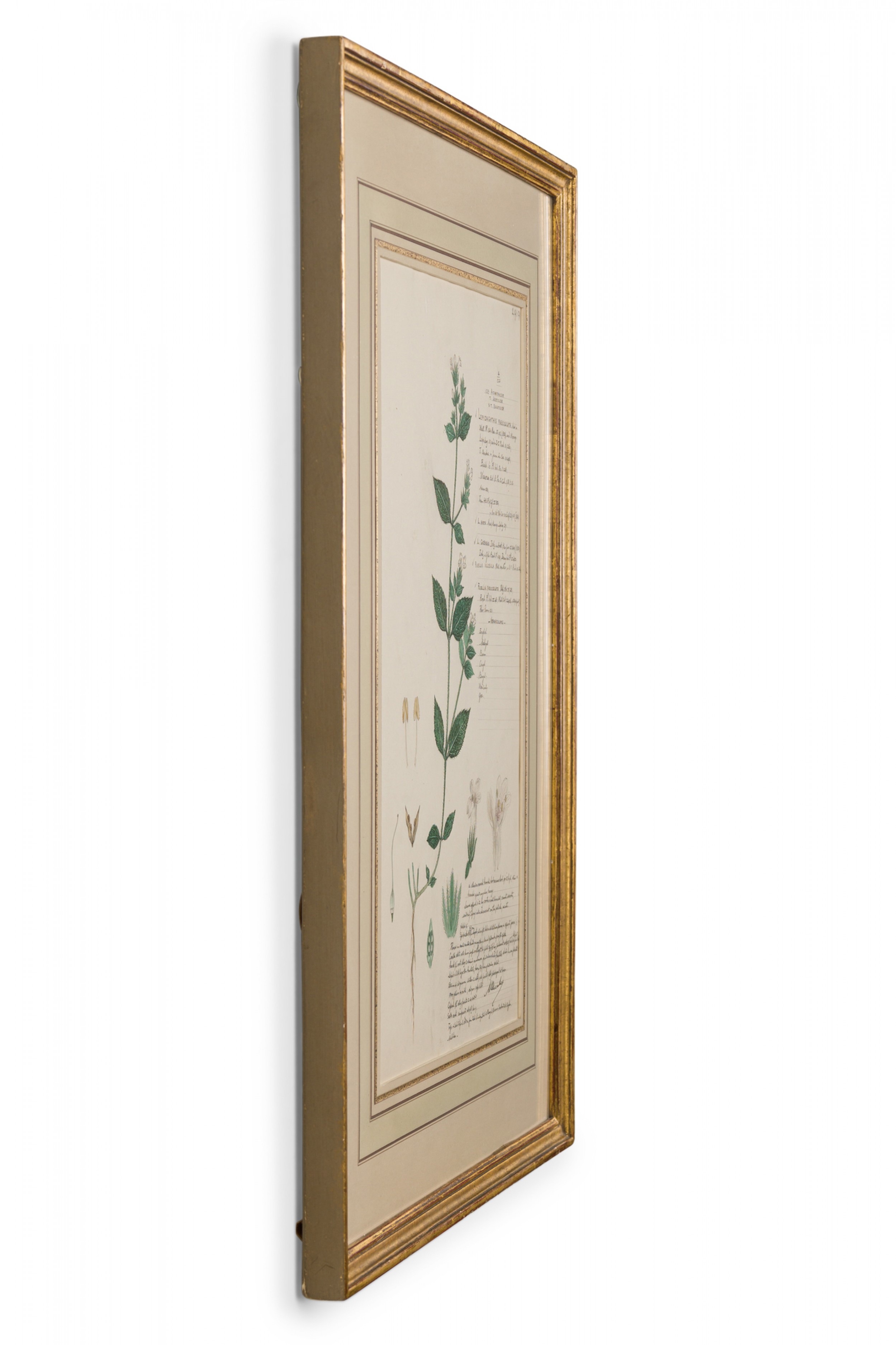 American Victorian (19th Century) watercolor, ink, and pencil botanical drawing depicting a Lepidagathis Fasciculata plant in green tones against a beige background, matted in a beveled parcel gilt painted wood frame. (Part of large set: 063653A, Companion pieces available individually: 063653-063701).