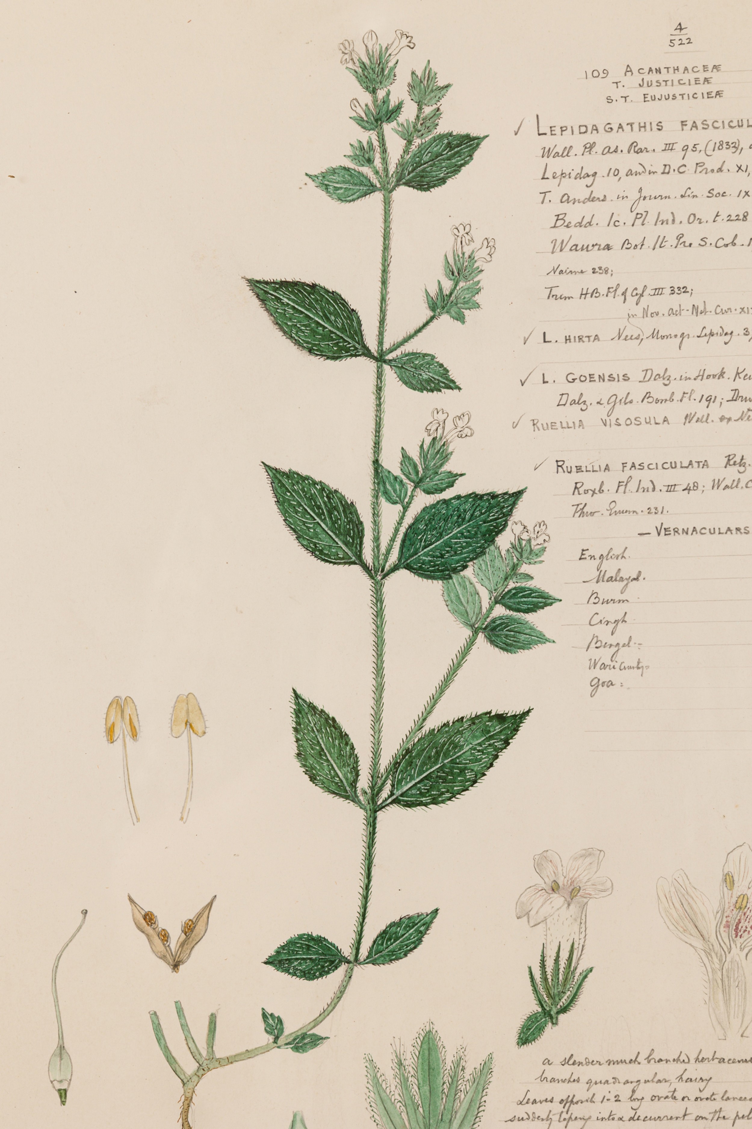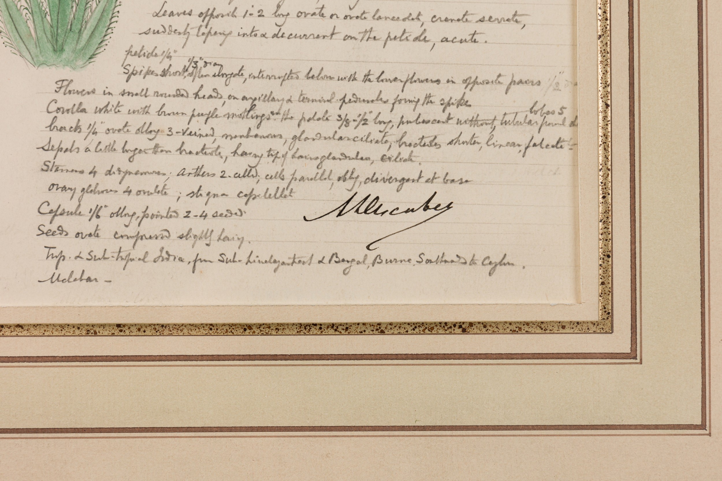 American Victorian (19th Century) watercolor, ink, and pencil botanical drawing depicting a Lepidagathis Fasciculata plant in green tones against a beige background, matted in a beveled parcel gilt painted wood frame. (Part of large set: 063653A, Companion pieces available individually: 063653-063701)