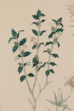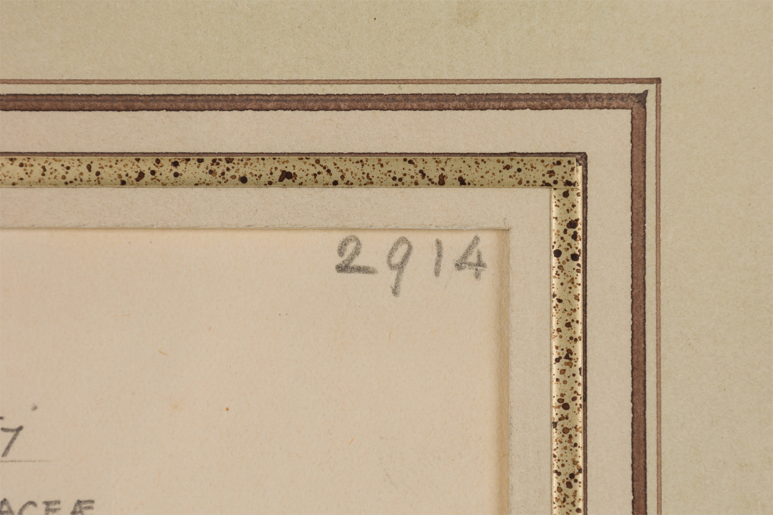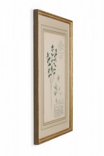 American Victorian (19th Century) watercolor, ink, and pencil botanical drawing depicting a Lepidagathis Pungens plant in green tones against a beige background, matted in a beveled parcel gilt painted wood frame. (Part of large set: 063653A, Companion pieces available individually: 063653-063701)