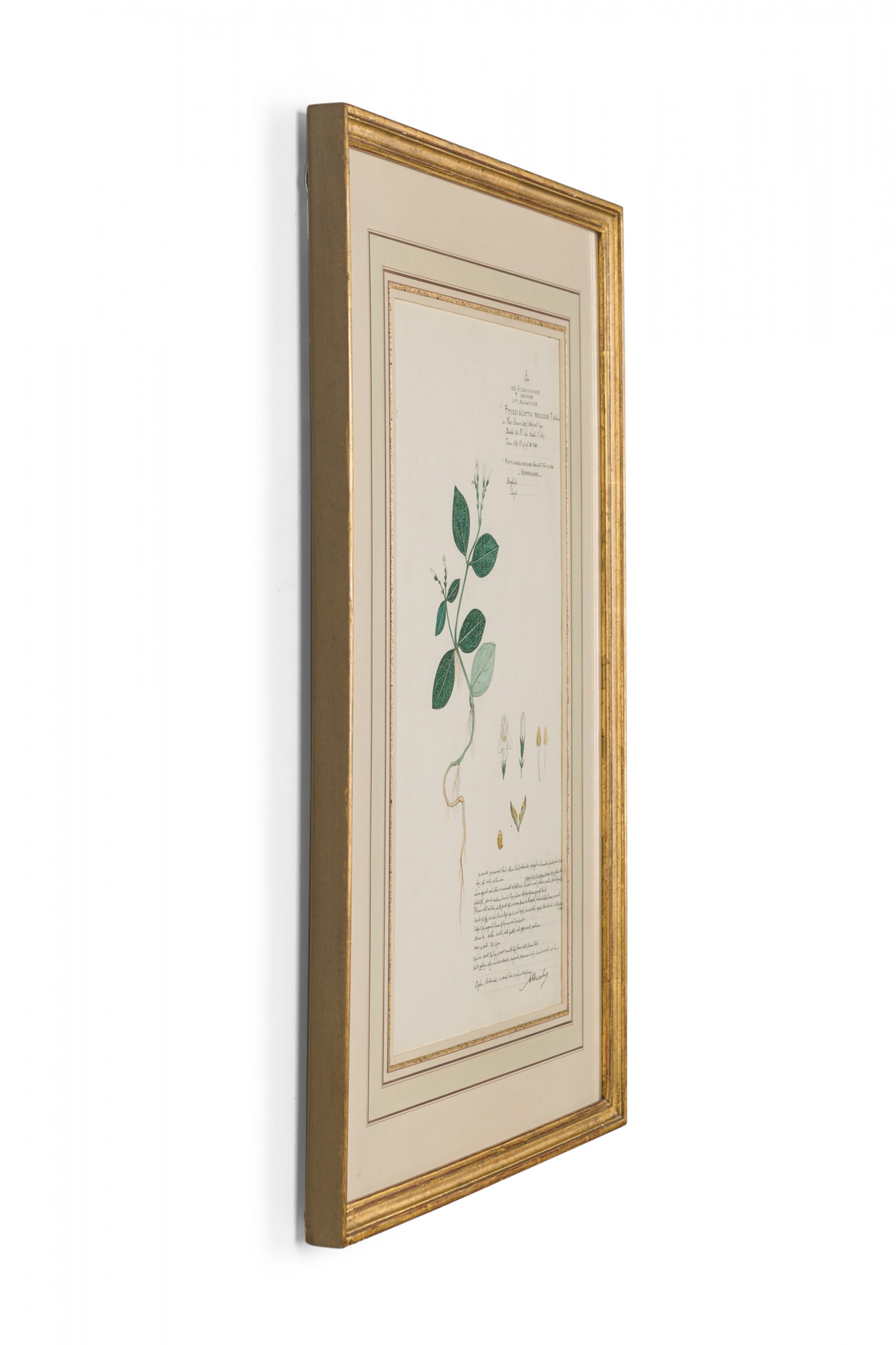 American Victorian (19th Century) watercolor, ink, and pencil botanical drawing depicting a Ptyssiglottis Radicosa plant in green tones against a beige background, matted in a beveled parcel gilt painted wood frame. (Part of large set: 063653A, Companion pieces available individually: 063653-063701).