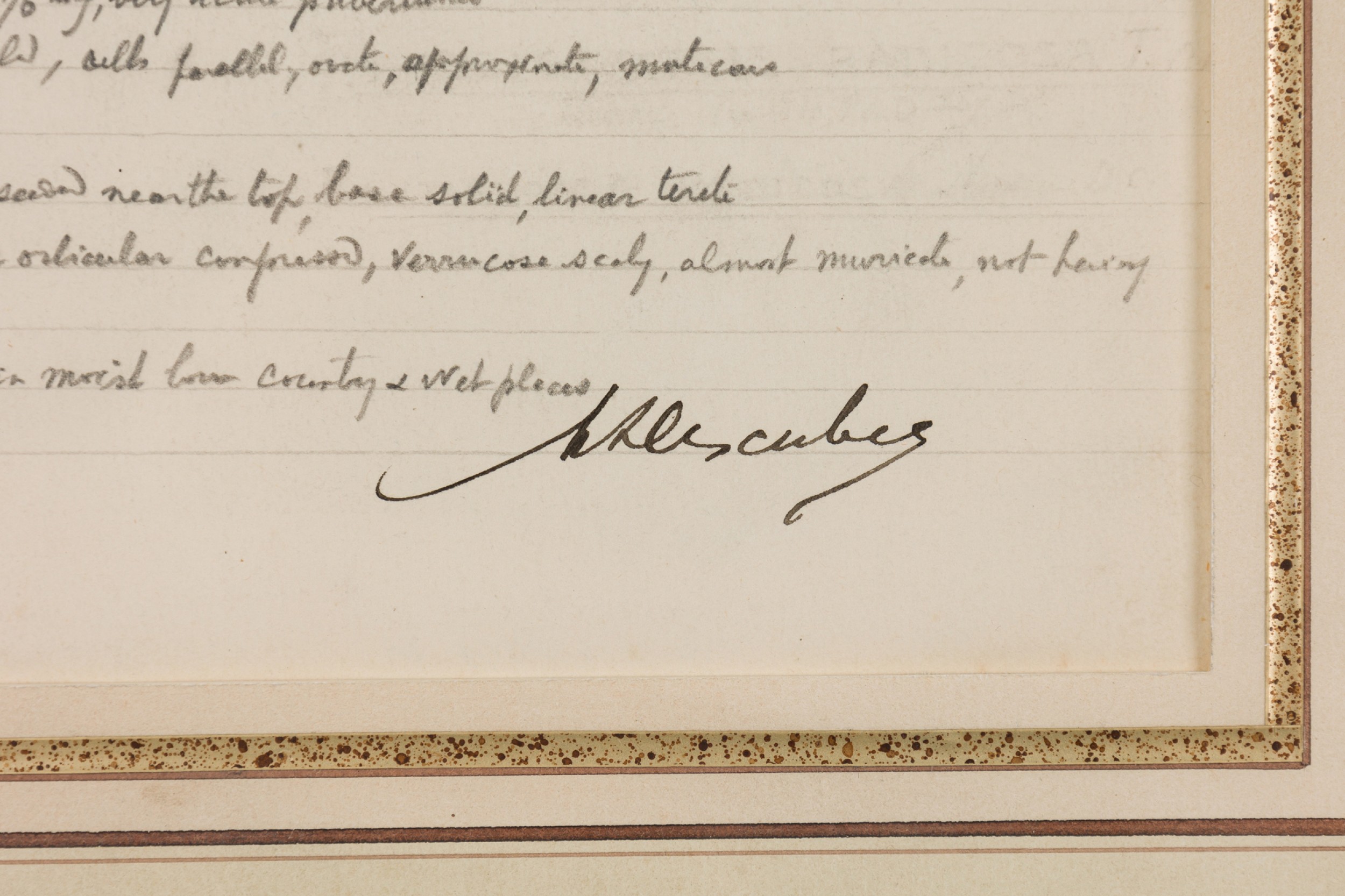 American Victorian (19th Century) watercolor, ink, and pencil botanical drawing depicting a Ptyssiglottis Radicosa plant in green tones against a beige background, matted in a beveled parcel gilt painted wood frame. (Part of large set: 063653A, Companion pieces available individually: 063653-063701)