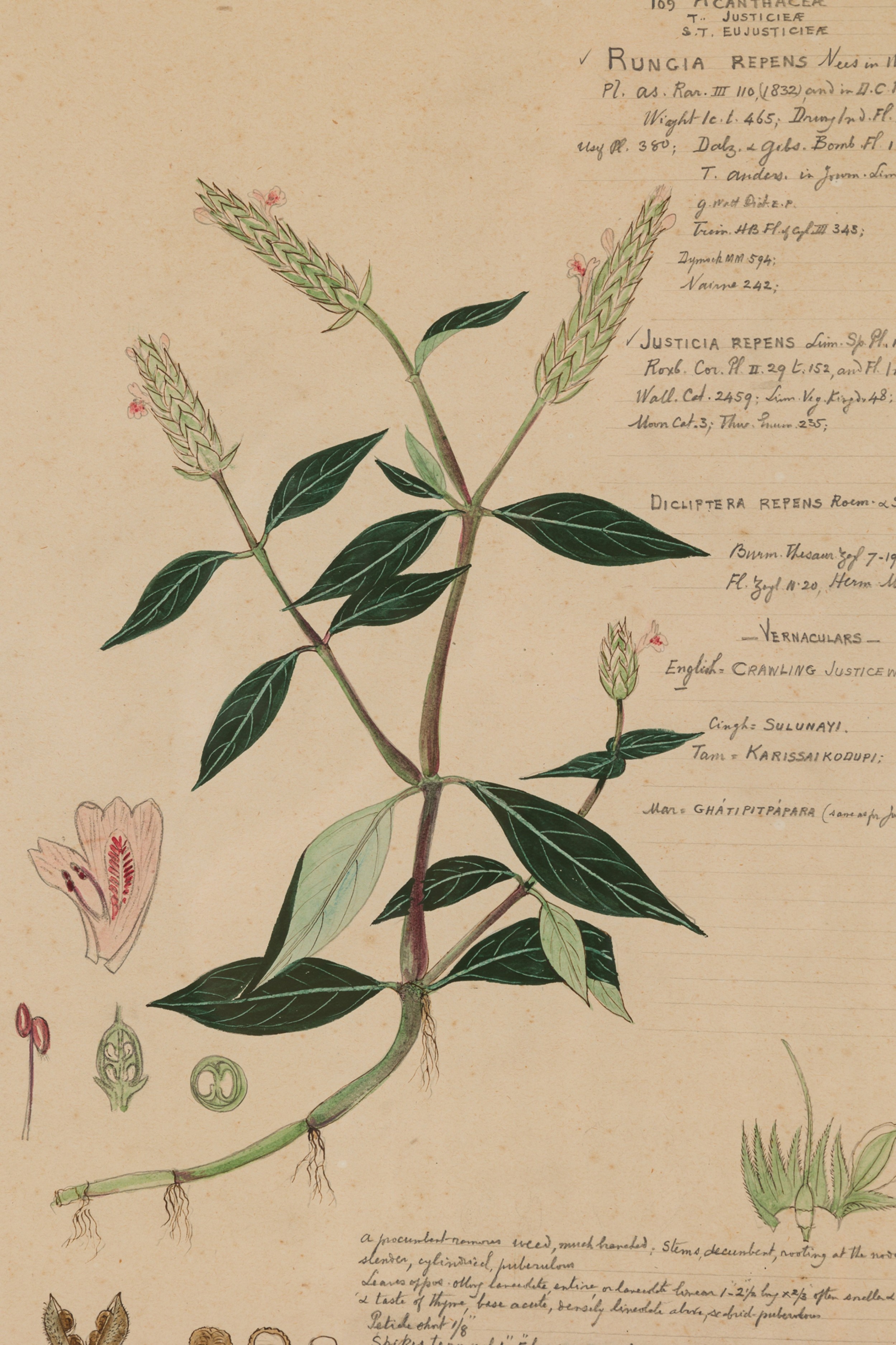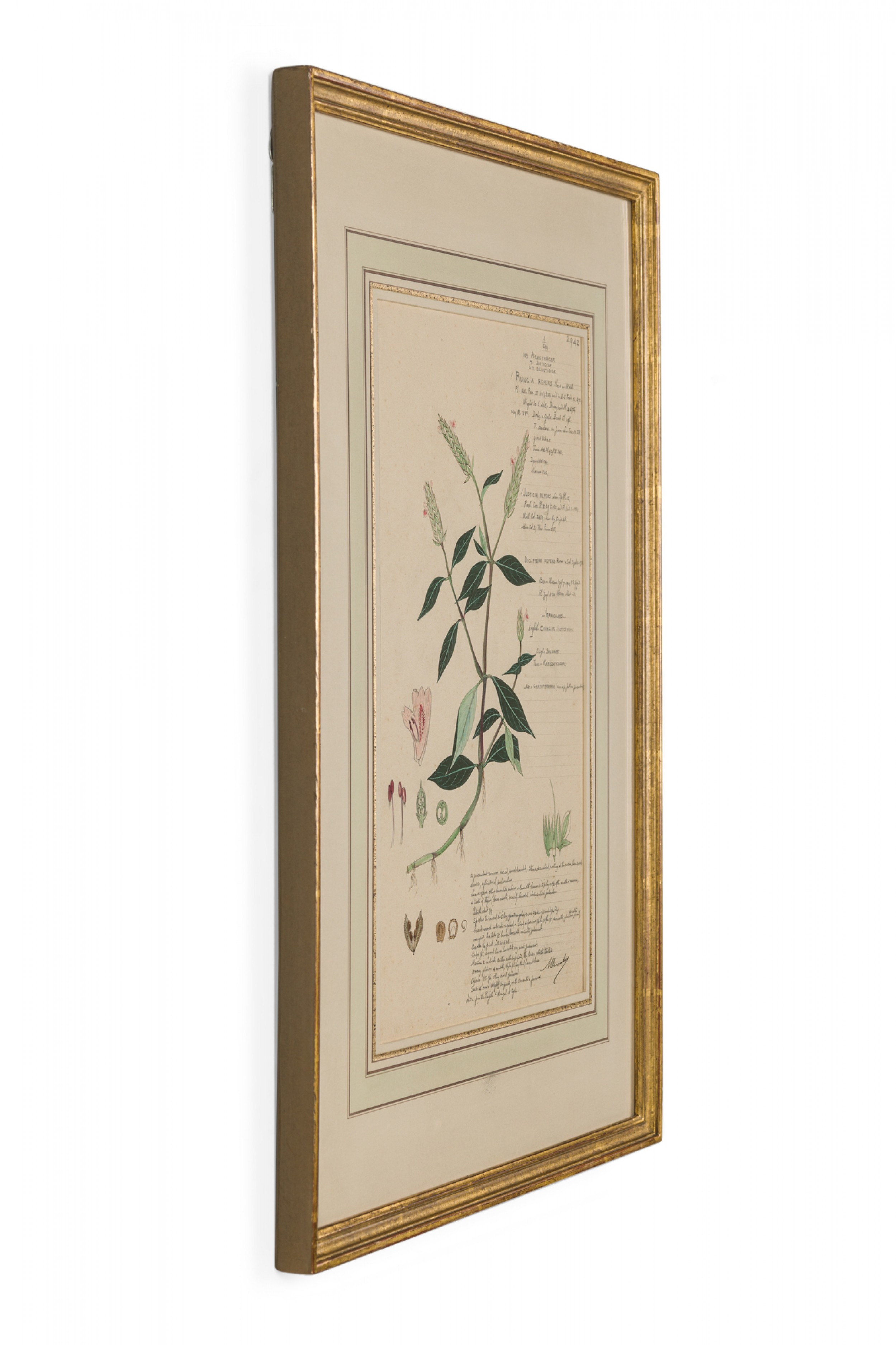 American Victorian (19th Century) watercolor, ink, and pencil botanical drawing depicting a Rungia Repens plant in green tones against a beige background, matted in a beveled parcel gilt painted wood frame. (Part of large set: 063653A, Companion pieces available individually: 063653-063701).