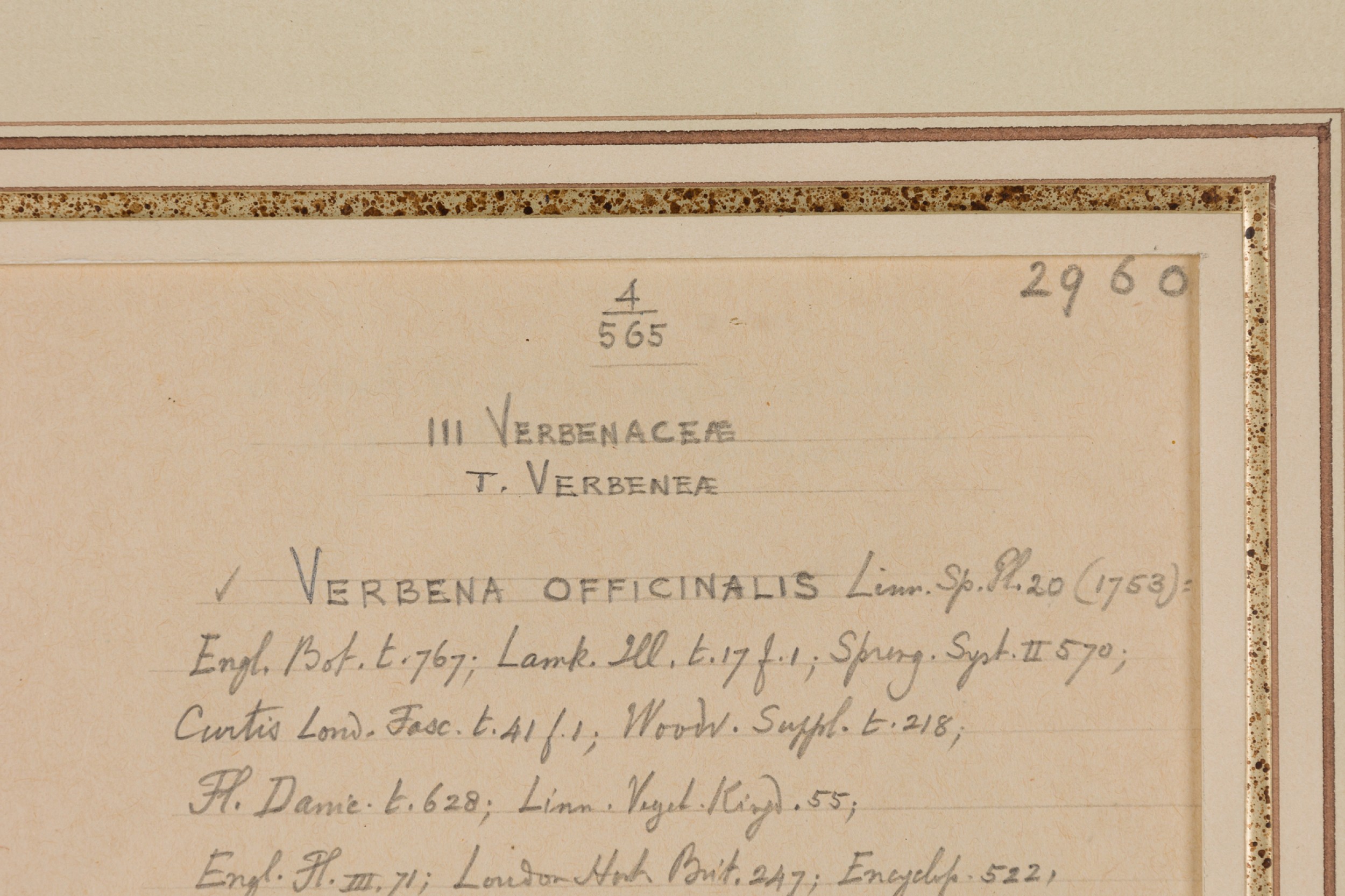 American Victorian (19th Century) watercolor, ink, and pencil botanical drawing depicting a Verbena Officinalis plant in green tones against a beige background, matted in a beveled parcel gilt painted wood frame. (Part of large set: 063653A, Companion pieces available individually: 063653-063701).