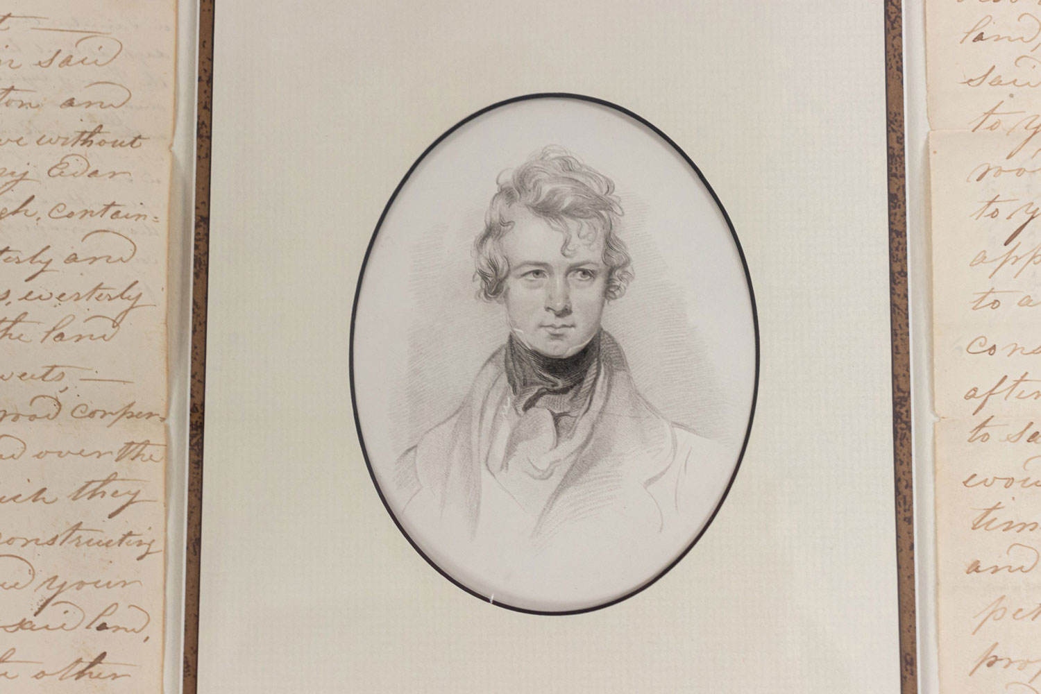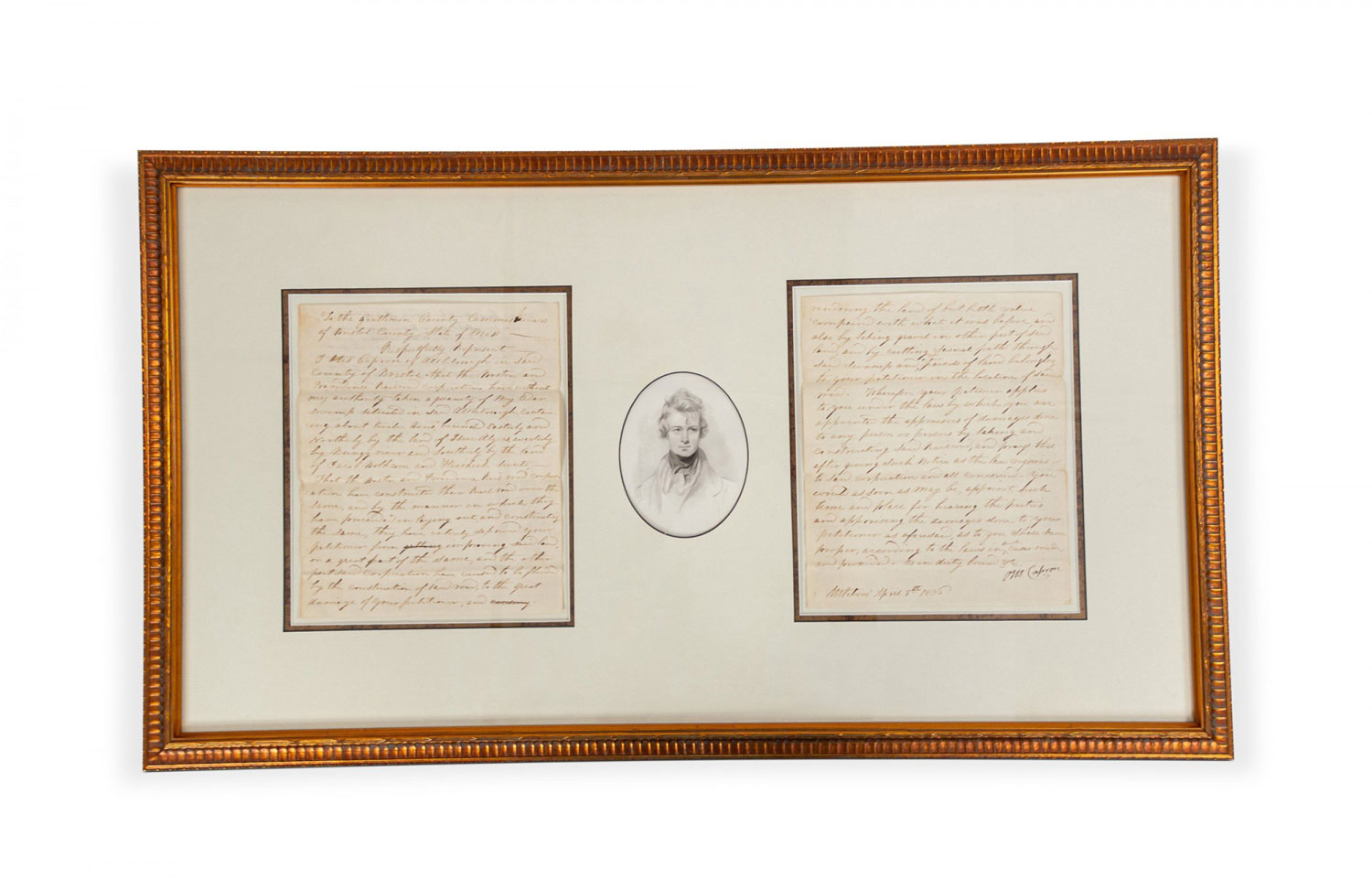 American (19th Century) copy collection of two letters from the 1830s in a white mat with a central oval printed portrait of a gentleman (Otis Cafron) in a gold wooden frame.