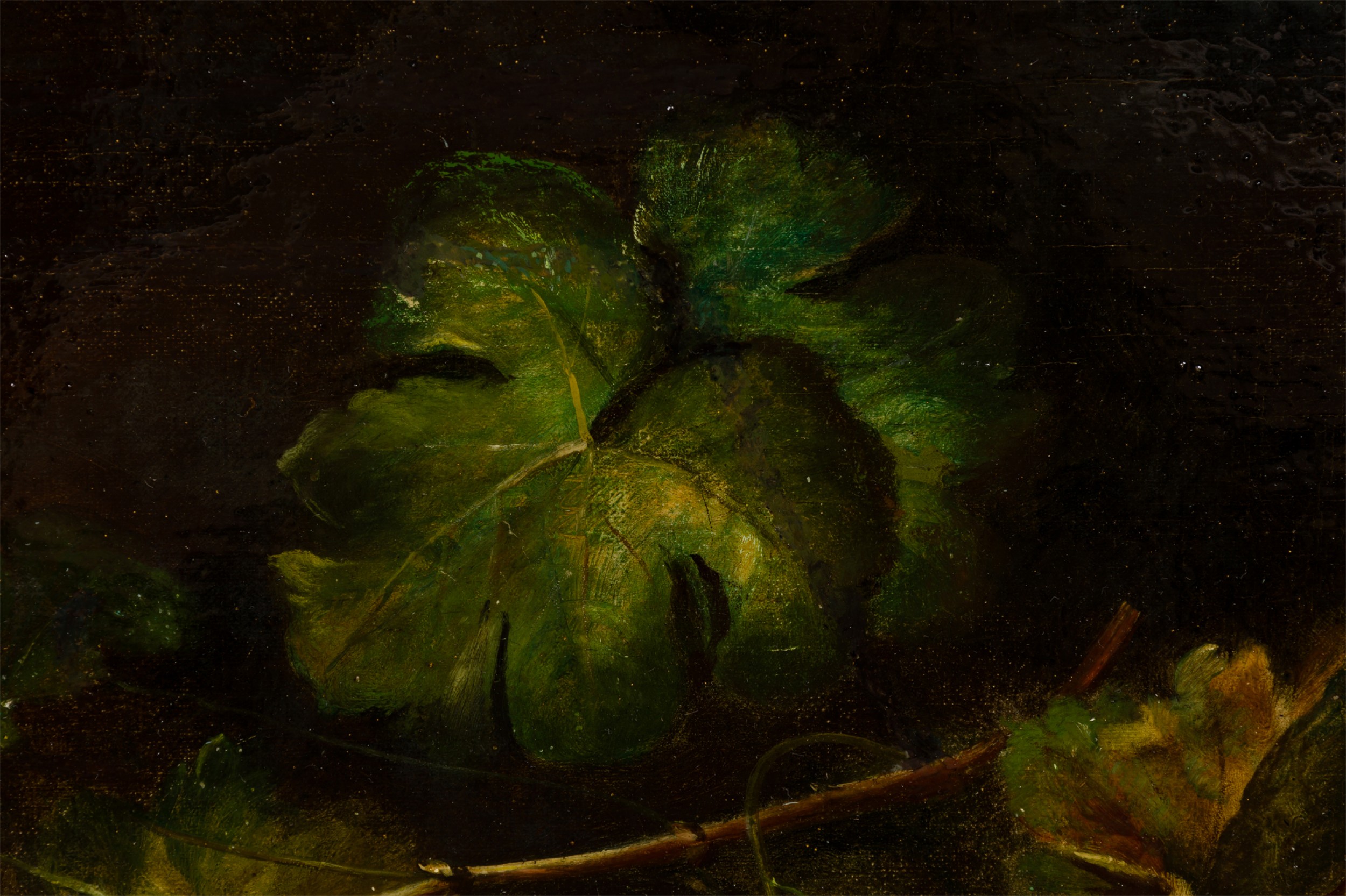 Dutch (19th Century) still life oil painting depicting robust grapes, peaches, plums and lobster on a wood table with shadowed green leaves in a dimly lit, atmospheric composition on canvas with an applied glossy varnish and mounted in a black, inset parcel gilt, elaborate frame..