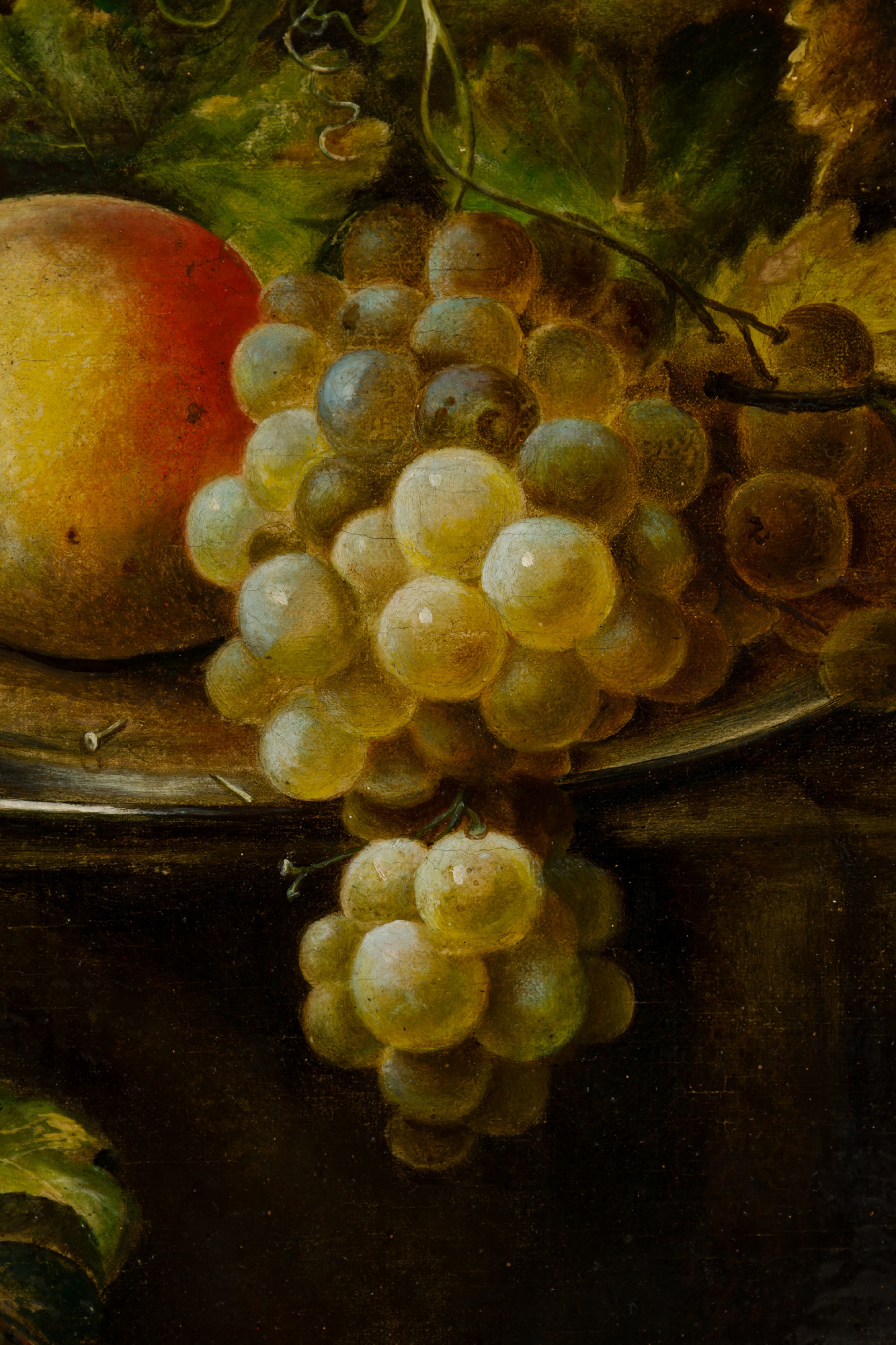 Dutch (19th Century) still life oil painting depicting robust grapes, peaches, plums and lobster on a wood table with shadowed green leaves in a dimly lit, atmospheric composition on canvas with an applied glossy varnish and mounted in a black, inset parcel gilt, elaborate frame.