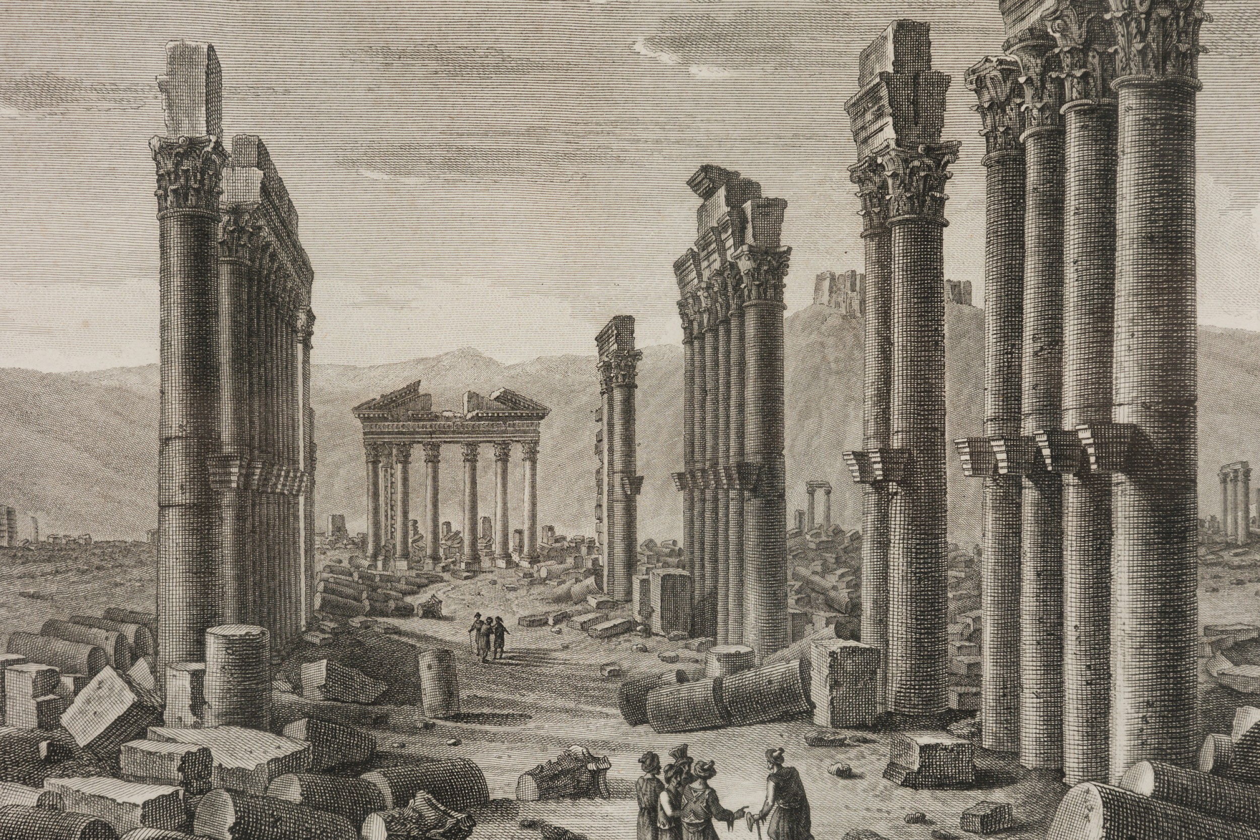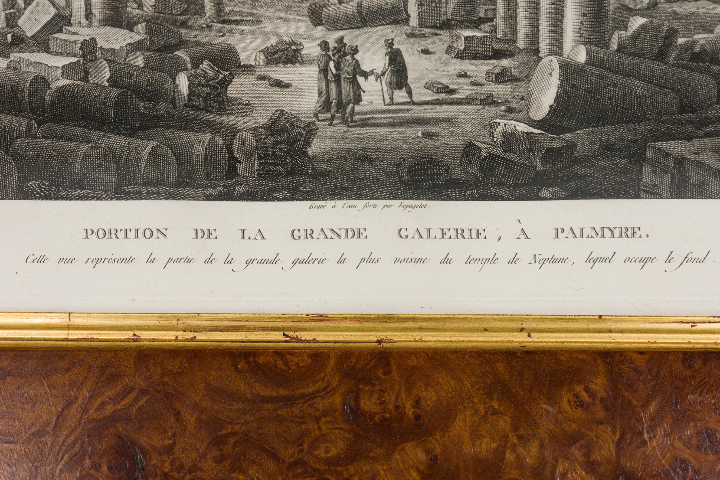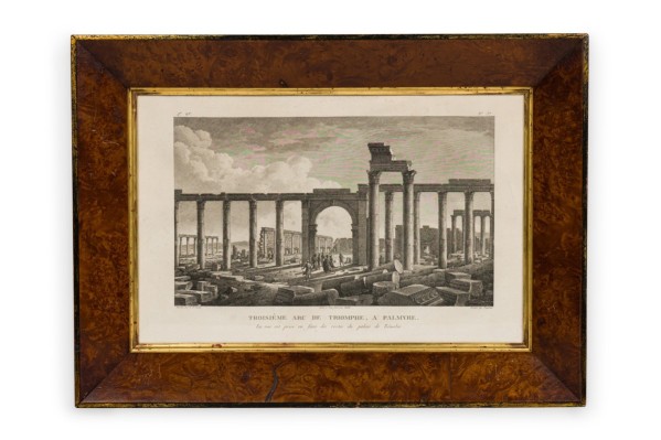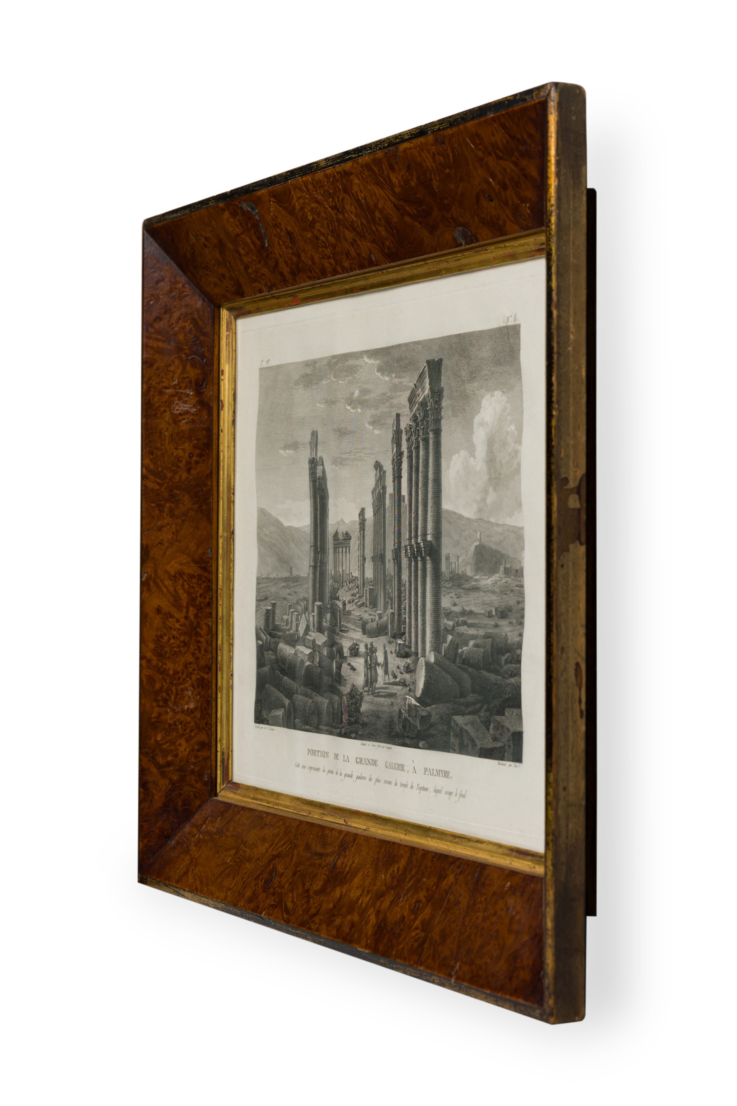Italian Neo-Classic lithograph of the Temple of Baalshamin in Palmyra, Syria with a group of people congregating around the middleground in a burl wood and gilded frame attributed to L.F.Cassas (Signed: Lienard) (Companion pieces: NWL6055A, NWL6055B & NWL6055D)