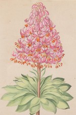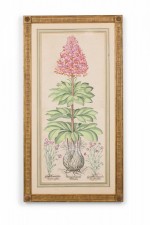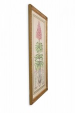French Victorian (19th Century) botanical illustration titled "Martagon Imperiale Molchatum" depicting a pink blossomed flower with green leaves against a beige background, double-matted in a fluted giltwood frame with carved flower medallions at the corners. (PIERRE-JOSEPH REDOUTÉ)