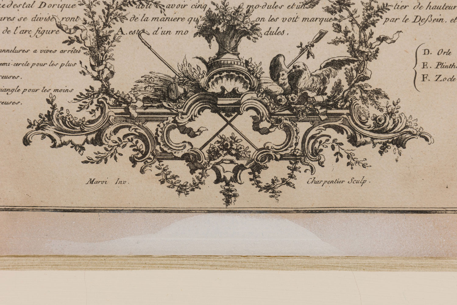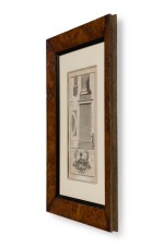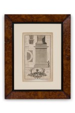Italian Neo-classic engravings of an ionic base pedestal blueprint in a burl wood frame with an ivory double-mat (Companion pieces: NWL6074, NWL6075 & NWL6076).