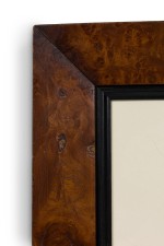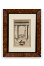 Italian Neo-classic engravings of pedestals on an archway featuring a man chasing children in a burl wood frame with an ivory double-mat (Companion pieces: NWL6074, NWL6076 & NWL6077)