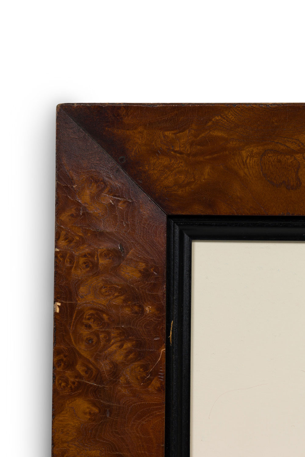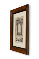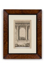 Italian Neo-classic engraving of pedestals on an archway featuring a genre scene of people gathered together at a table in a burl wood frame with an ivory double-mat (Companion pieces: NWL6075, NWL6076 & NWL6077).