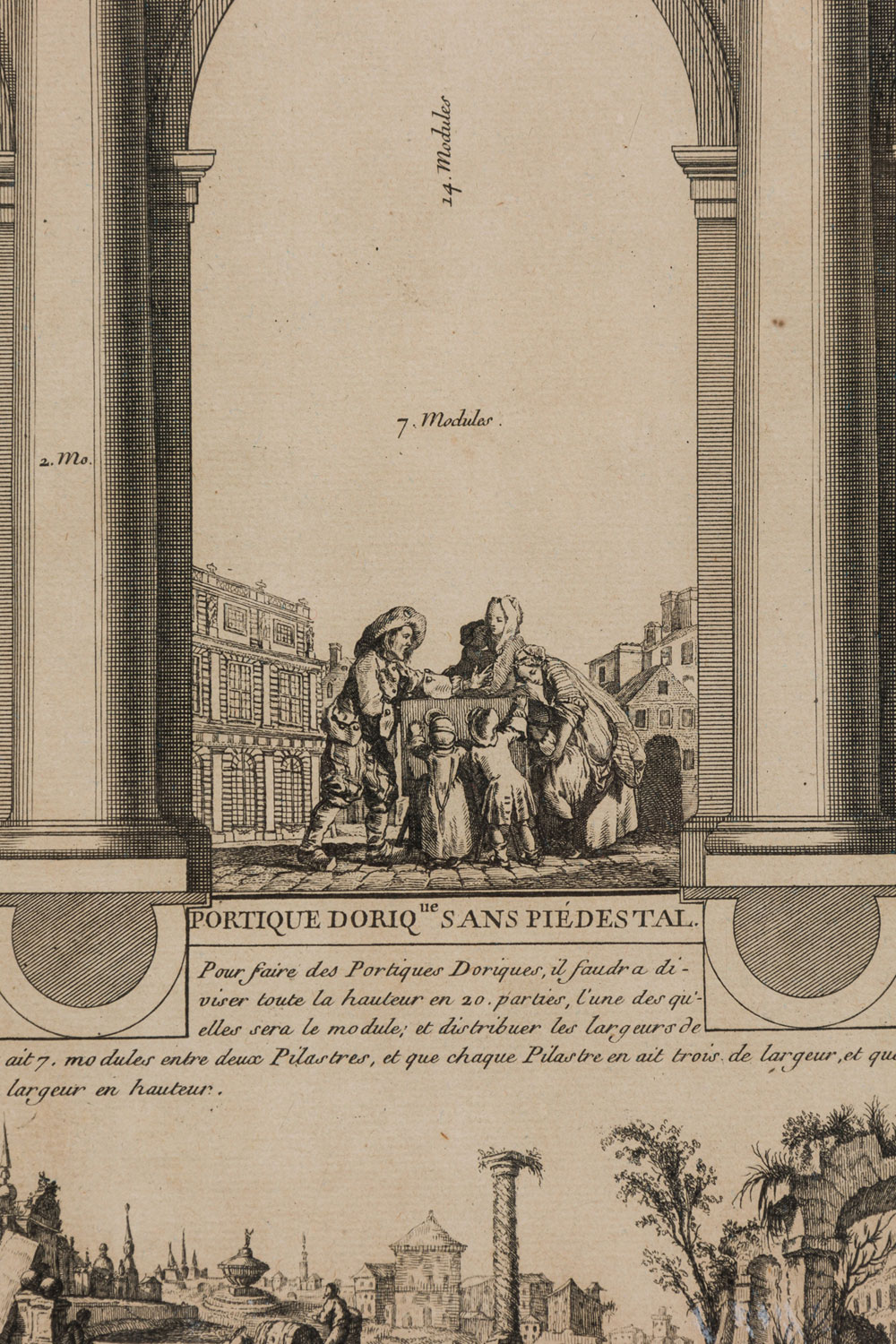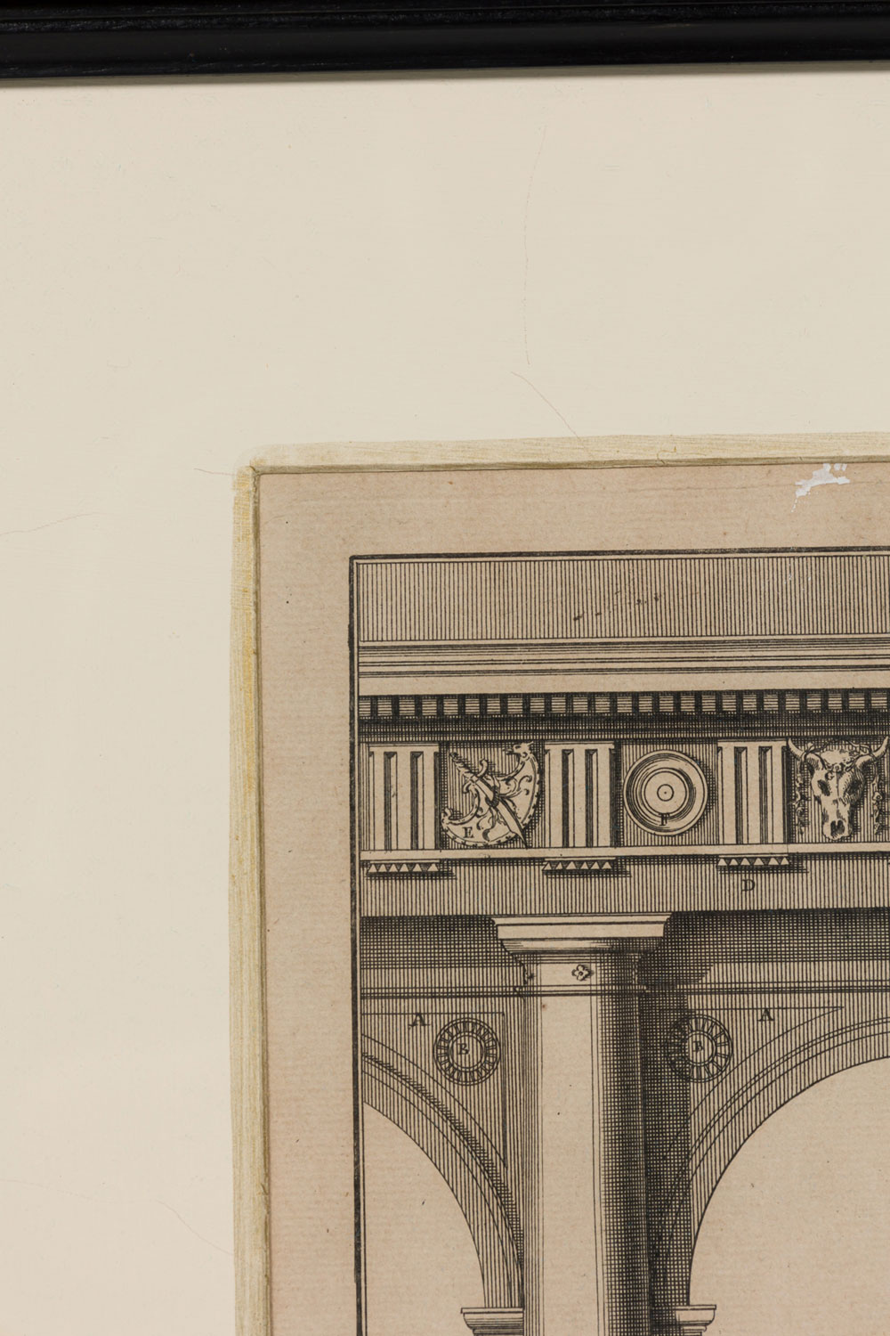 Framed Italian Neo-Classic Engravings of Pedestals on an Archway with Genre Scene