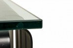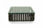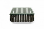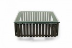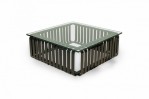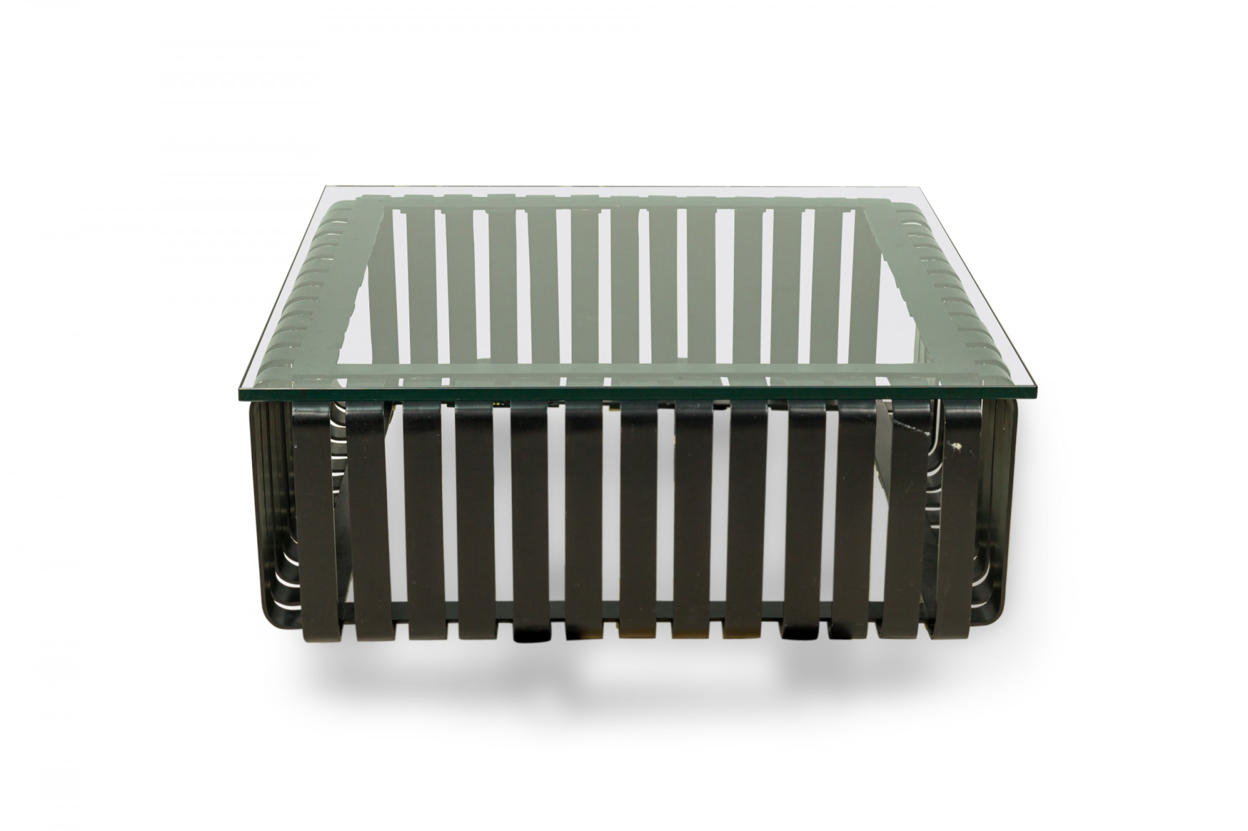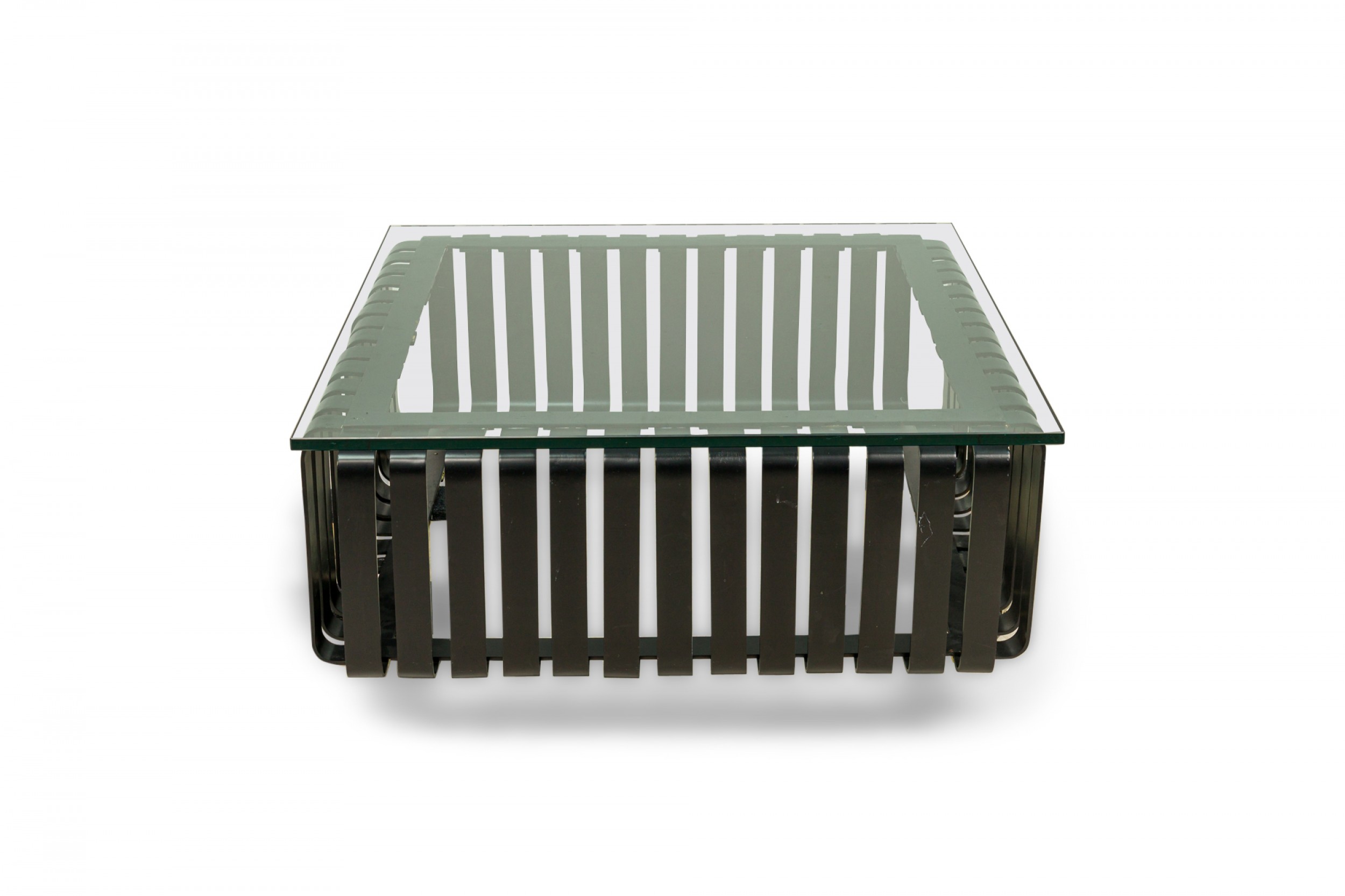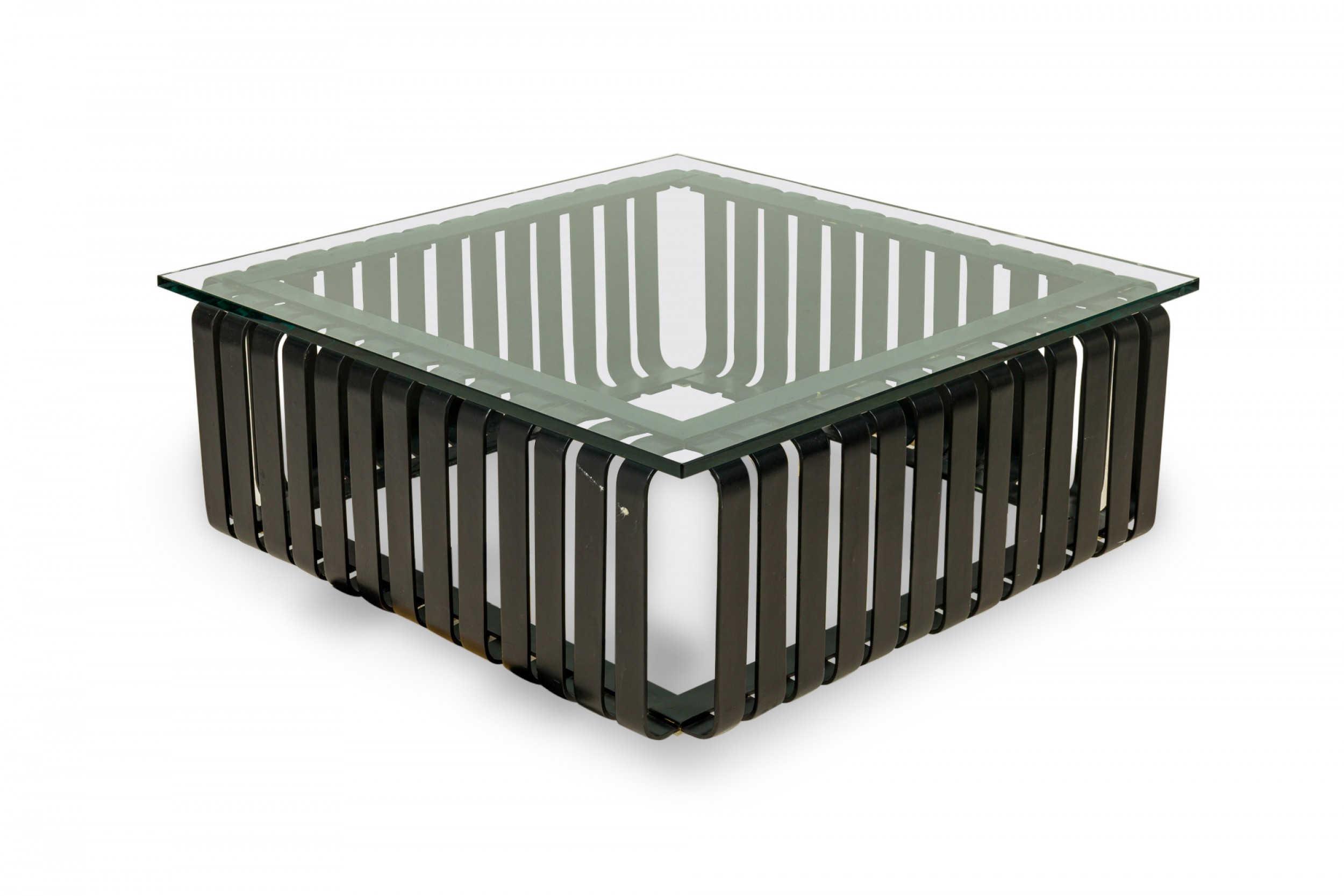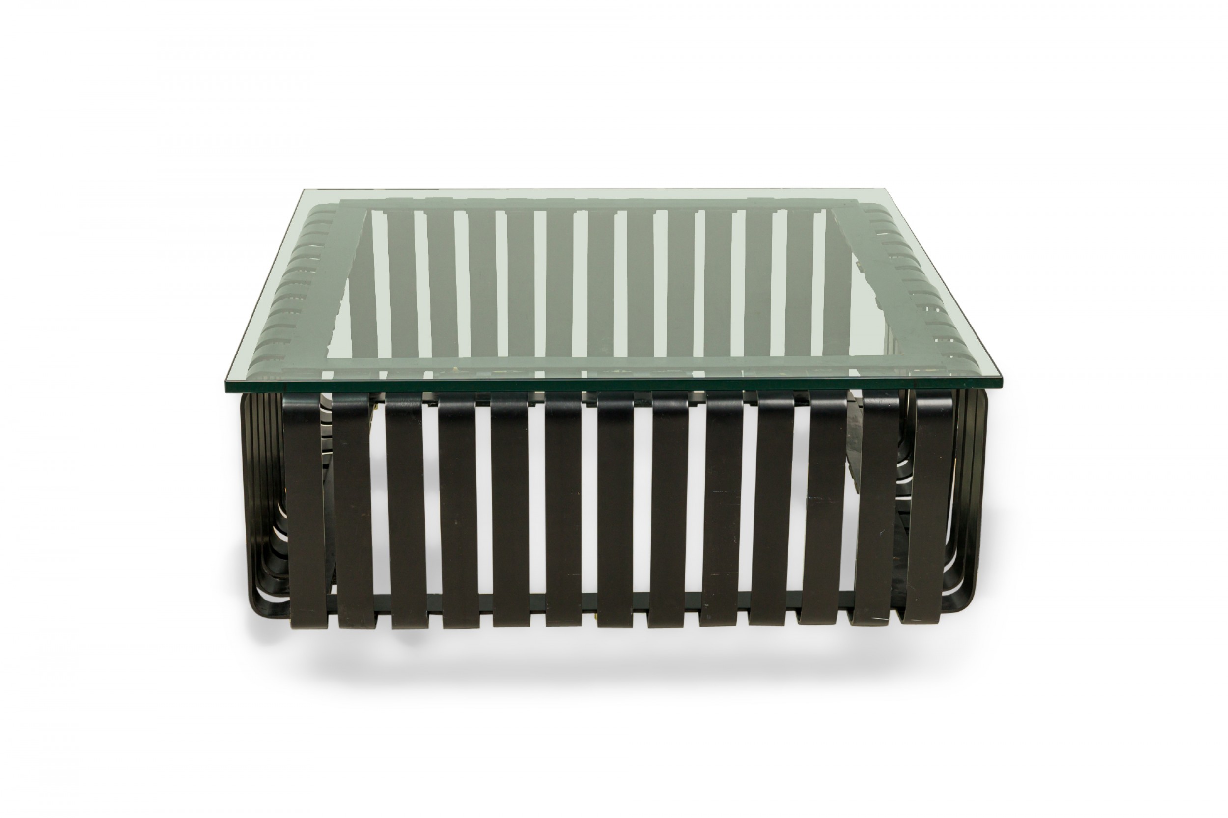 Mid-Century coffee / cocktail table with a steam bent ebonized maple vertical slat base around a square wooden frame, topped with a thick square clear glass top. (FRANK GEHRY FOR KNOLL INTERNATIONAL)