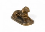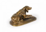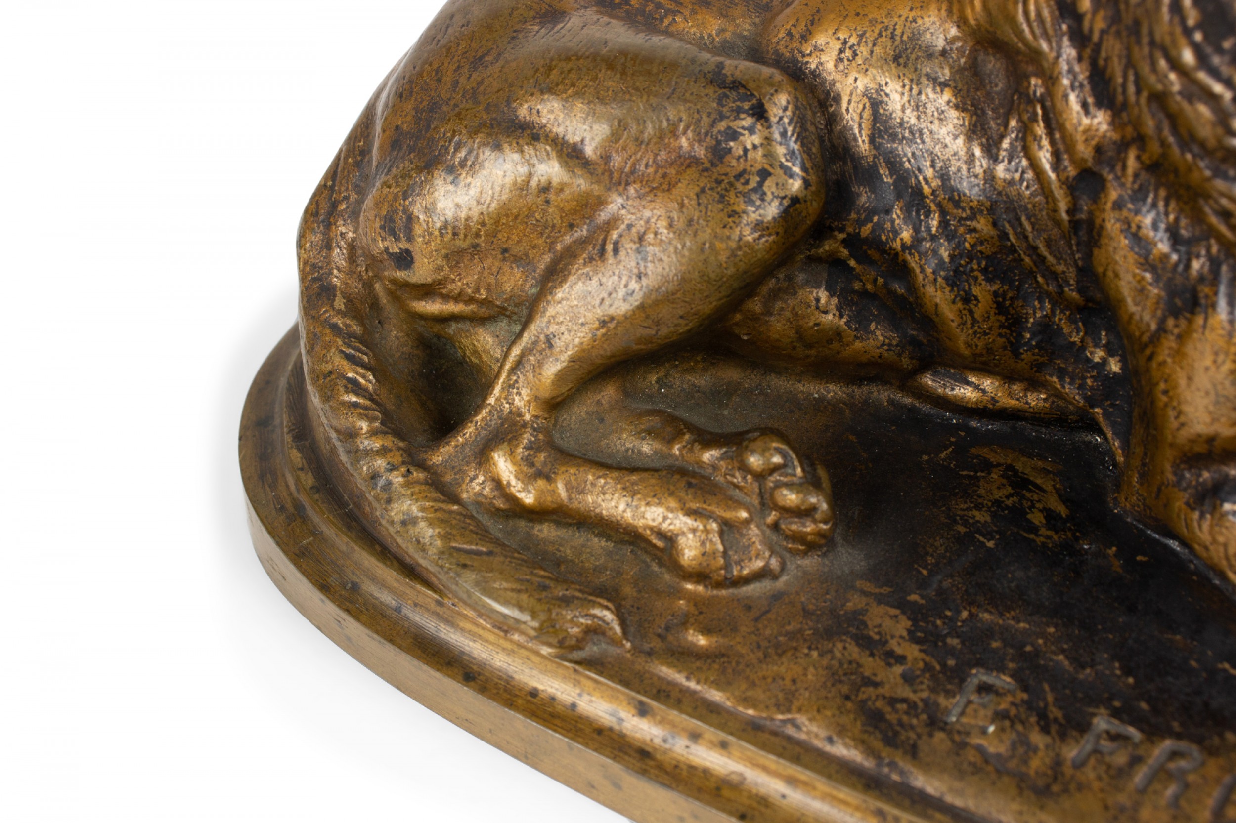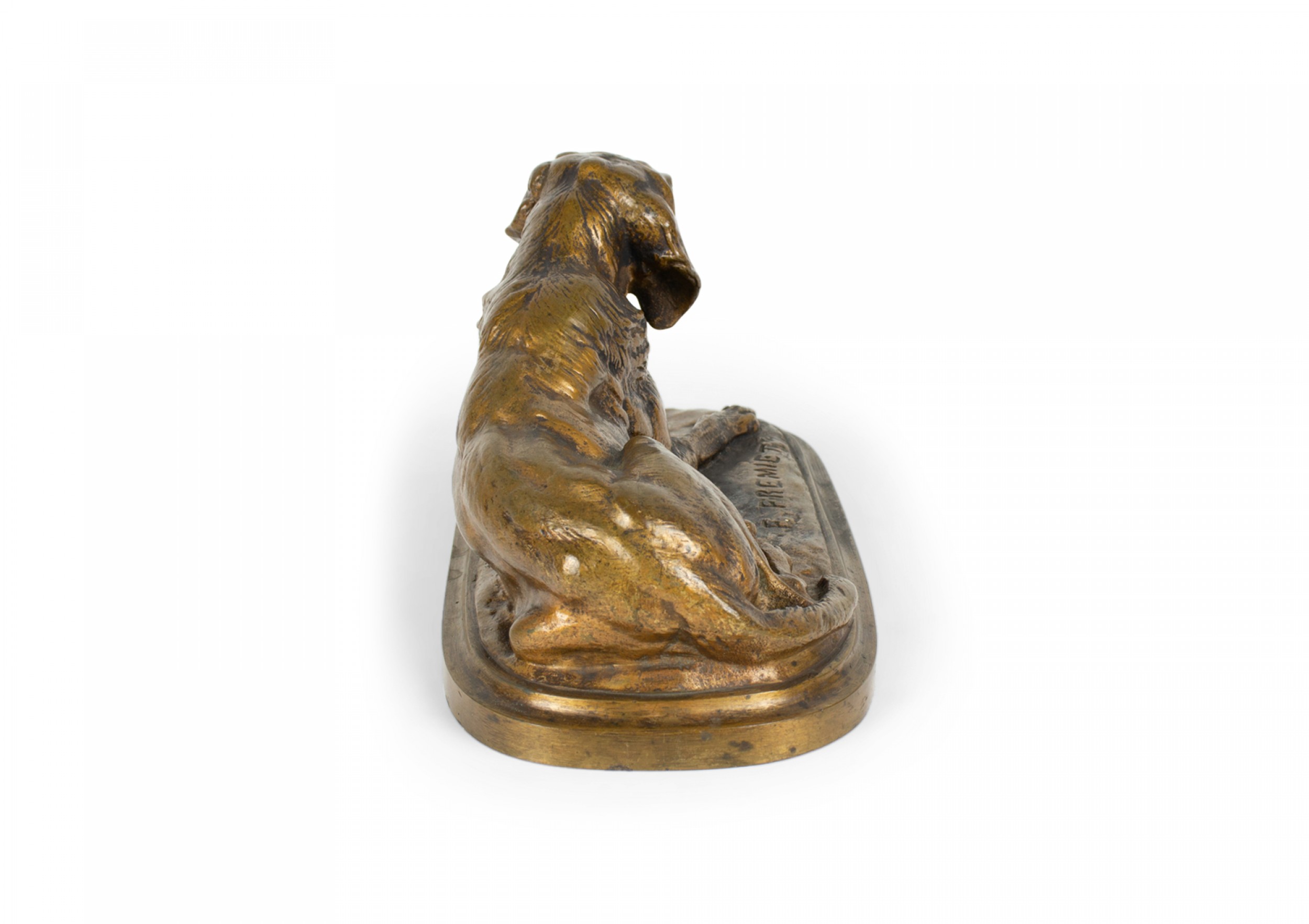 French Victorian bronze figure of reclining dog on oval shaped base (signed FREMIET).